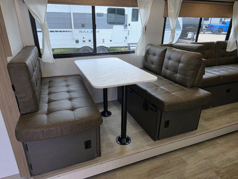 You're sure to make camping memories in this spacious travel trailer! You can easily sleep eight people each night thanks to the double-size bunks, the custom king bed with Versa Tilt in the front bedroom plus the Versa-Lounge within the large slide out! The cooktop and microwave oven will let you make meals each day, and you'll appreciate the hidden pantry with shelves behind the fireplace. There is also a booth dinette where you can dine together or play a game of cards after dinner is cleaned up, or you may just find yourselves outdoors under the 18' awning with 4K blade lighting. And don't overlook the full bath, complete with a tub/shower that will make bath time easier if you have little ones.