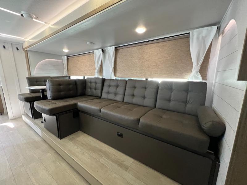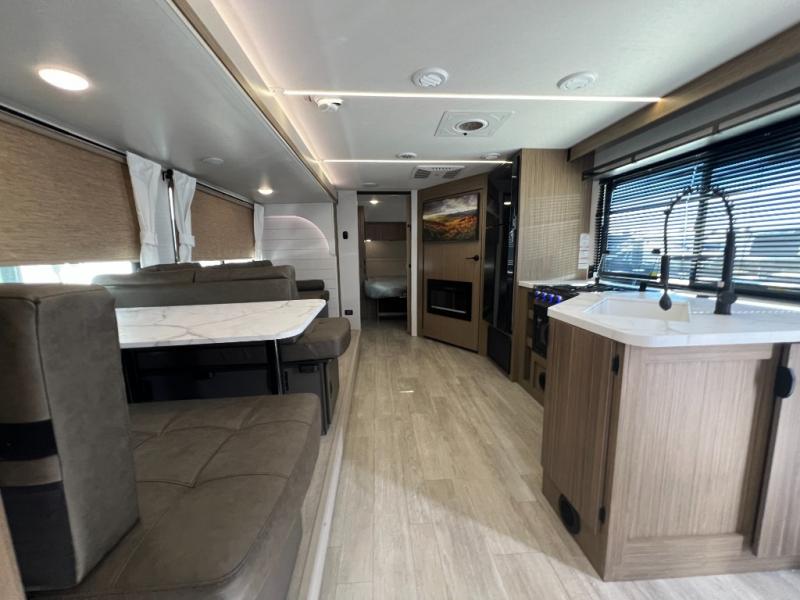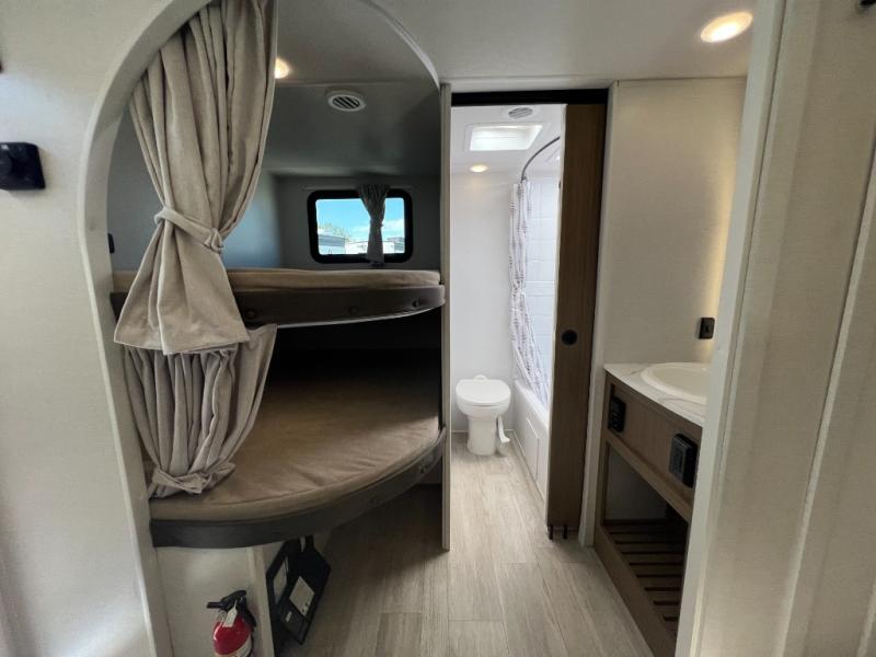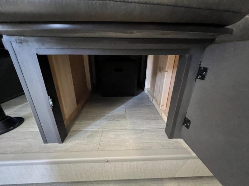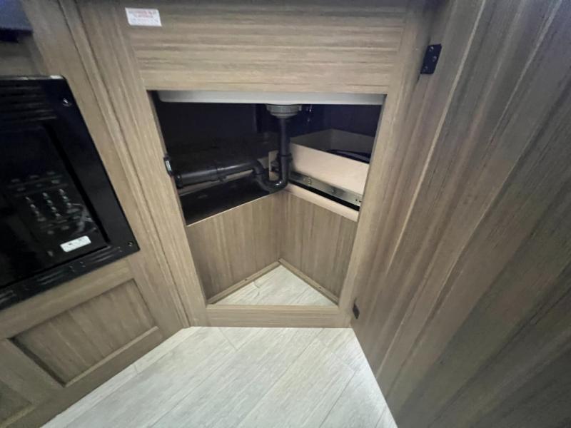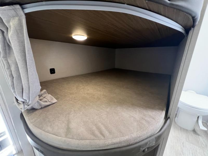 You're sure to make camping memories in this spacious travel trailer! You can easily sleep eight people each night thanks to the double-size bunks, the custom king bed with Versa Tilt in the front bedroom plus the Versa-Lounge within the large slide out! The cooktop and microwave oven will let you make meals each day, and you'll appreciate the hidden pantry with shelves behind the fireplace. There is also a booth dinette where you can dine together or play a game of cards after dinner is cleaned up, or you may just find yourselves outdoors under the 18' awning with 4K blade lighting. And don't overlook the full bath, complete with a tub/shower that will make bath time easier if you have little ones.