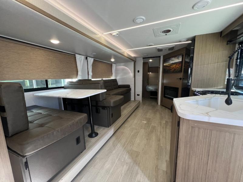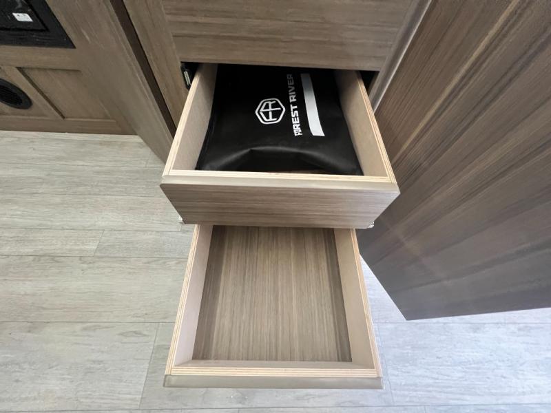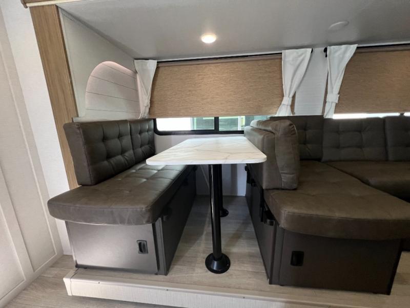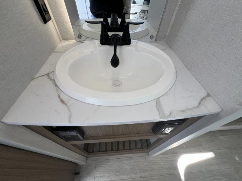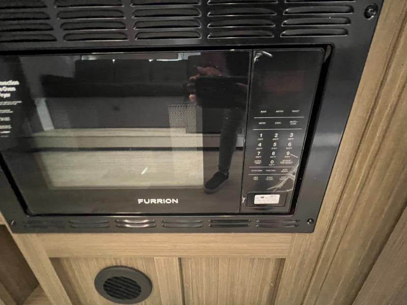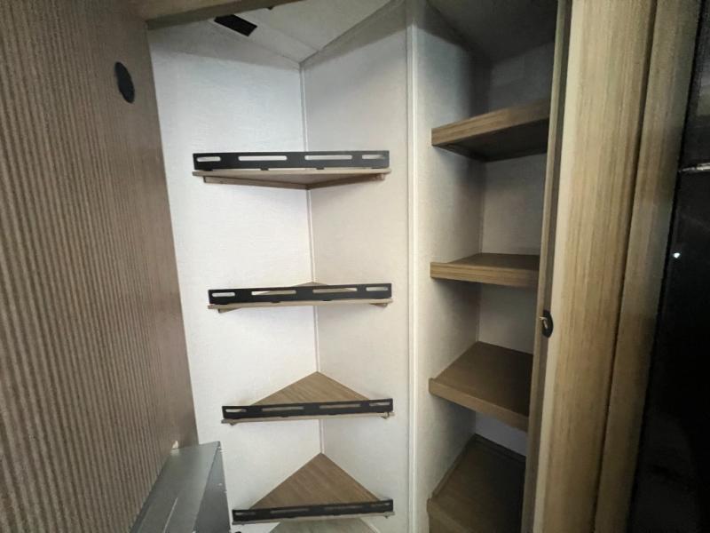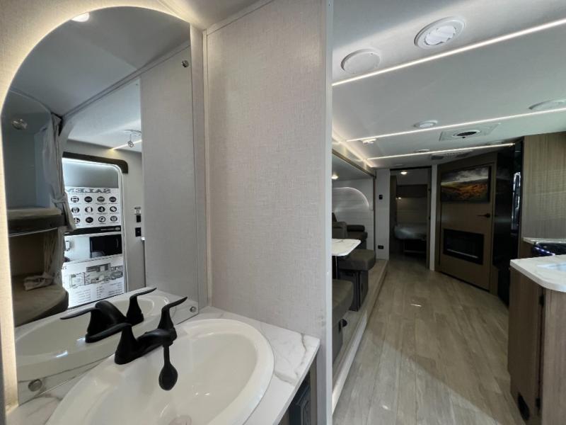 You're sure to make camping memories in this spacious travel trailer! You can easily sleep eight people each night thanks to the double-size bunks, the custom king bed with Versa Tilt in the front bedroom plus the Versa-Lounge within the large slide out! The cooktop and microwave oven will let you make meals each day, and you'll appreciate the hidden pantry with shelves behind the fireplace. There is also a booth dinette where you can dine together or play a game of cards after dinner is cleaned up, or you may just find yourselves outdoors under the 18' awning with 4K blade lighting. And don't overlook the full bath, complete with a tub/shower that will make bath time easier if you have little ones.