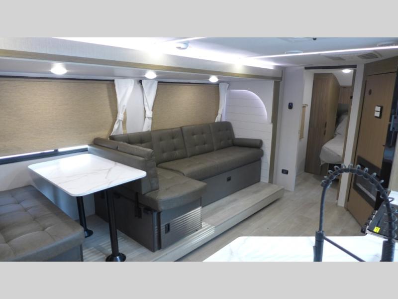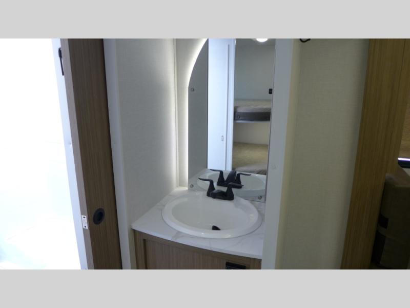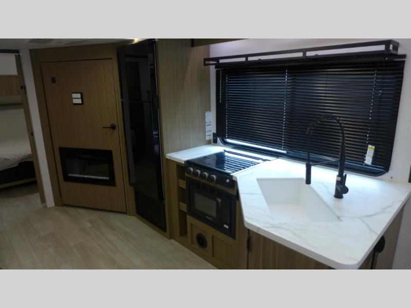 You're sure to make camping memories in this spacious travel trailer! You can easily sleep eight people each night thanks to the double-size bunks, the custom king bed with Versa Tilt in the front bedroom plus the Versa-Lounge within the large slide out! The cooktop and microwave oven will let you make meals each day, and you'll appreciate the hidden pantry with shelves behind the fireplace. There is also a booth dinette where you can dine together or play a game of cards after dinner is cleaned up, or you may just find yourselves outdoors under the 18' awning with 4K blade lighting. And don't overlook the full bath, complete with a tub/shower that will make bath time easier if you have little ones.