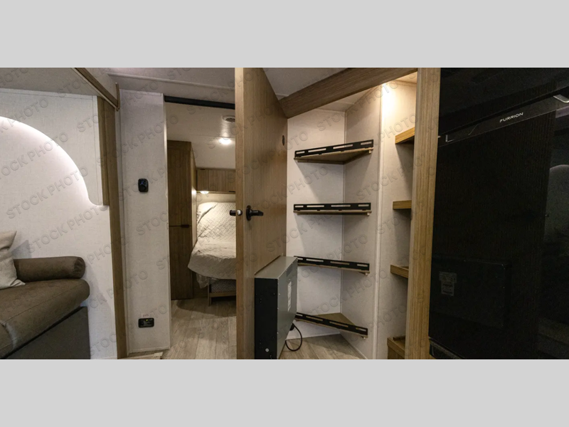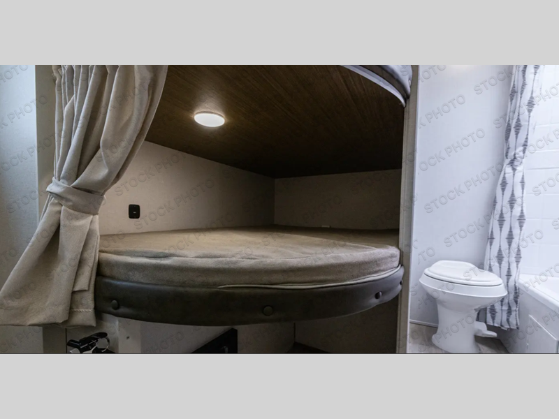 You're sure to make camping memories in this spacious travel trailer! You can easily sleep eight people each night thanks to the double-size bunks, the custom king bed with Versa Tilt in the front bedroom plus the Versa-Lounge within the large slide out! The cooktop and microwave oven will let you make meals each day, and you'll appreciate the hidden pantry with shelves behind the fireplace. There is also a booth dinette where you can dine together or play a game of cards after dinner is cleaned up, or you may just find yourselves outdoors under the 18' awning with 4K blade lighting. And don't overlook the full bath, complete with a tub/shower that will make bath time easier if you have little ones.