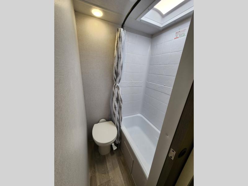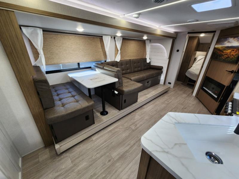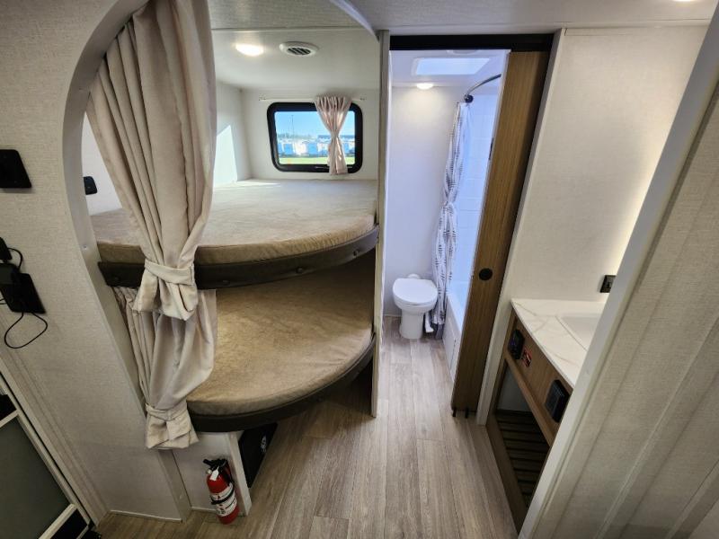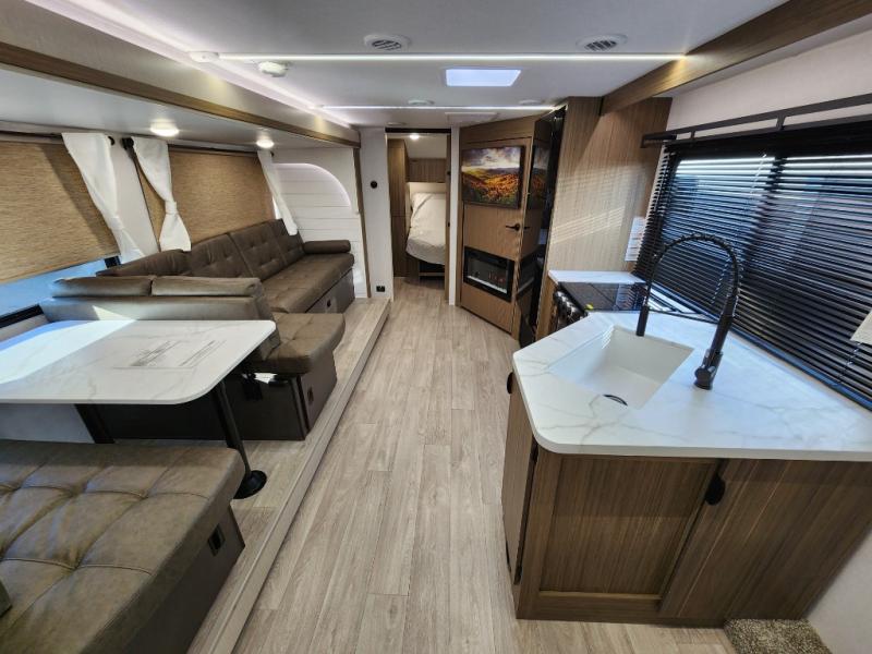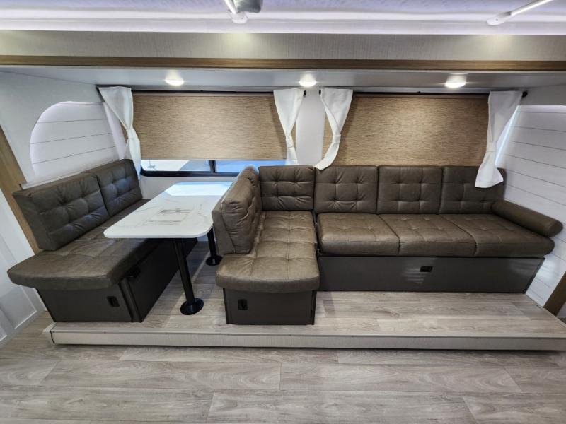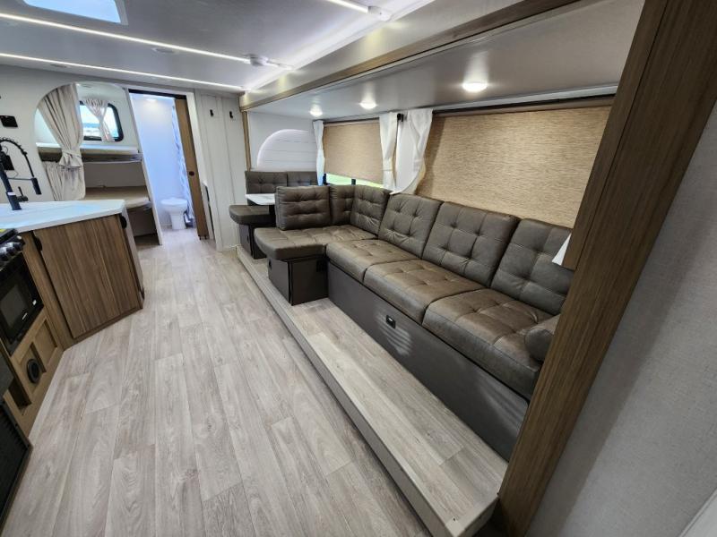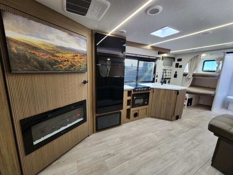 You're sure to make camping memories in this spacious travel trailer! You can easily sleep eight people each night thanks to the double-size bunks, the custom king bed with Versa Tilt in the front bedroom plus the Versa-Lounge within the large slide out! The cooktop and microwave oven will let you make meals each day, and you'll appreciate the hidden pantry with shelves behind the fireplace. There is also a booth dinette where you can dine together or play a game of cards after dinner is cleaned up, or you may just find yourselves outdoors under the 18' awning with 4K blade lighting. And don't overlook the full bath, complete with a tub/shower that will make bath time easier if you have little ones.