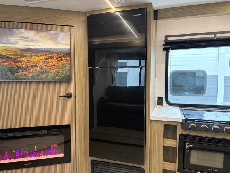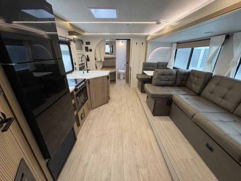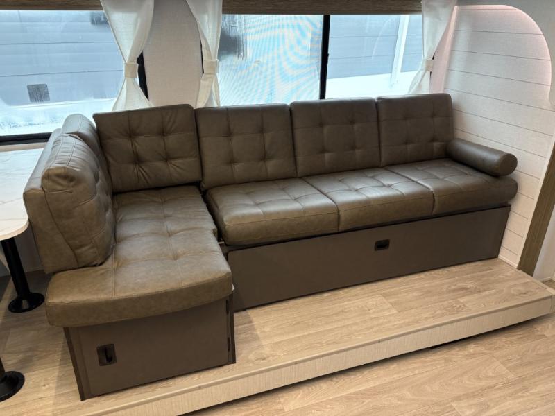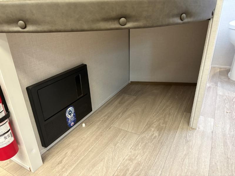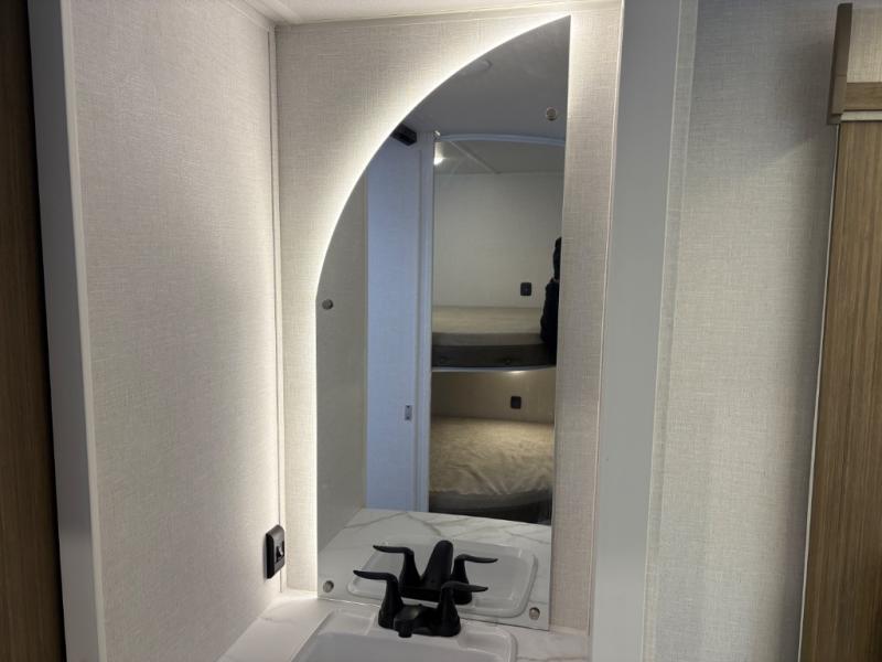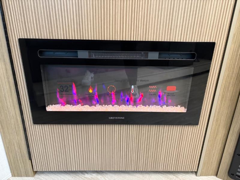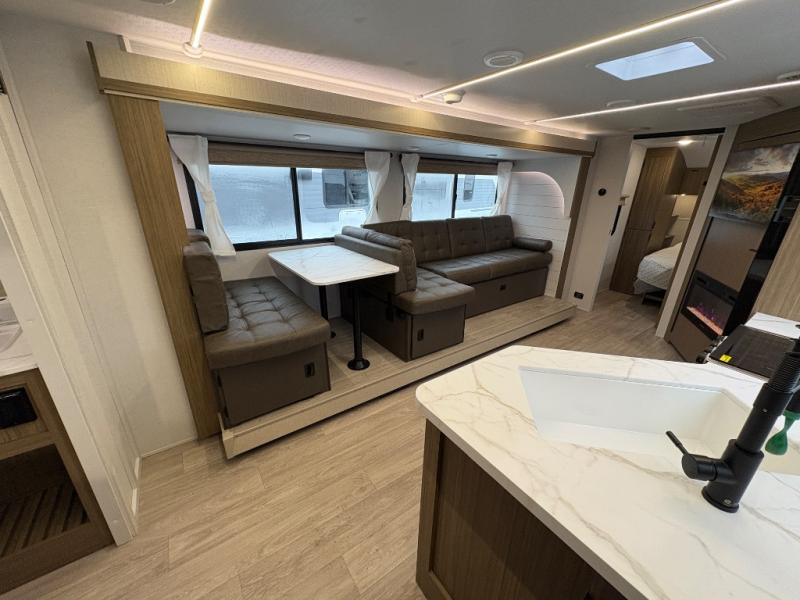 You're sure to make camping memories in this spacious travel trailer! You can easily sleep eight people each night thanks to the double-size bunks, the custom king bed with Versa Tilt in the front bedroom plus the Versa-Lounge within the large slide out! The cooktop and microwave oven will let you make meals each day, and you'll appreciate the hidden pantry with shelves behind the fireplace. There is also a booth dinette where you can dine together or play a game of cards after dinner is cleaned up, or you may just find yourselves outdoors under the 18' awning with 4K blade lighting. And don't overlook the full bath, complete with a tub/shower that will make bath time easier if you have little ones.