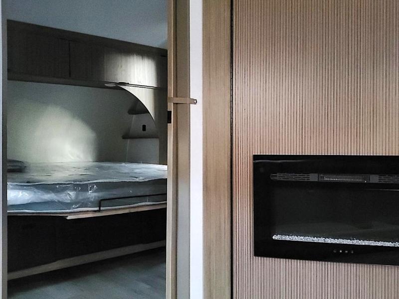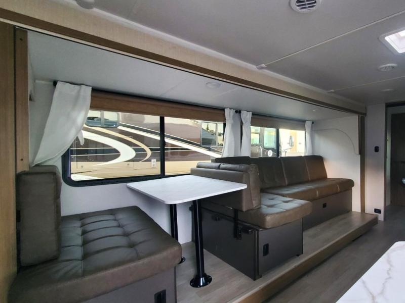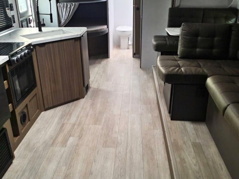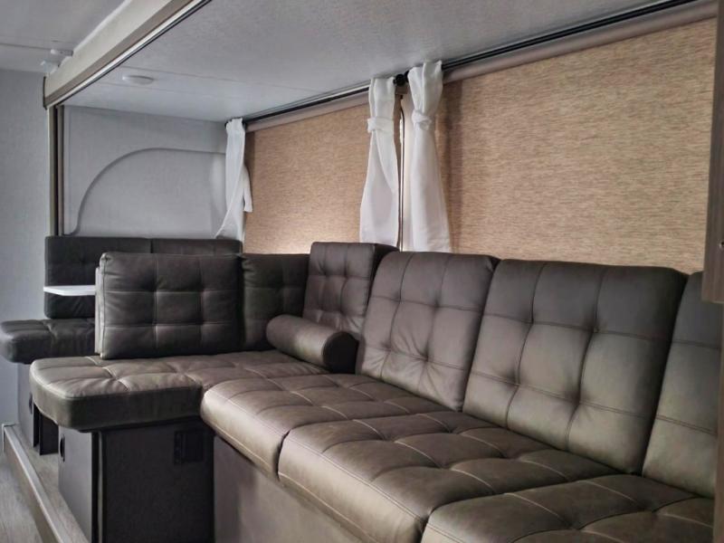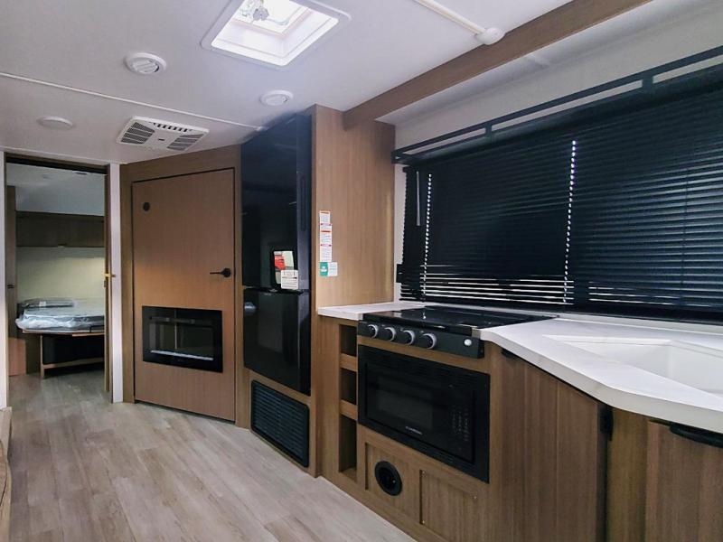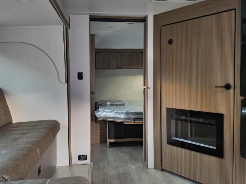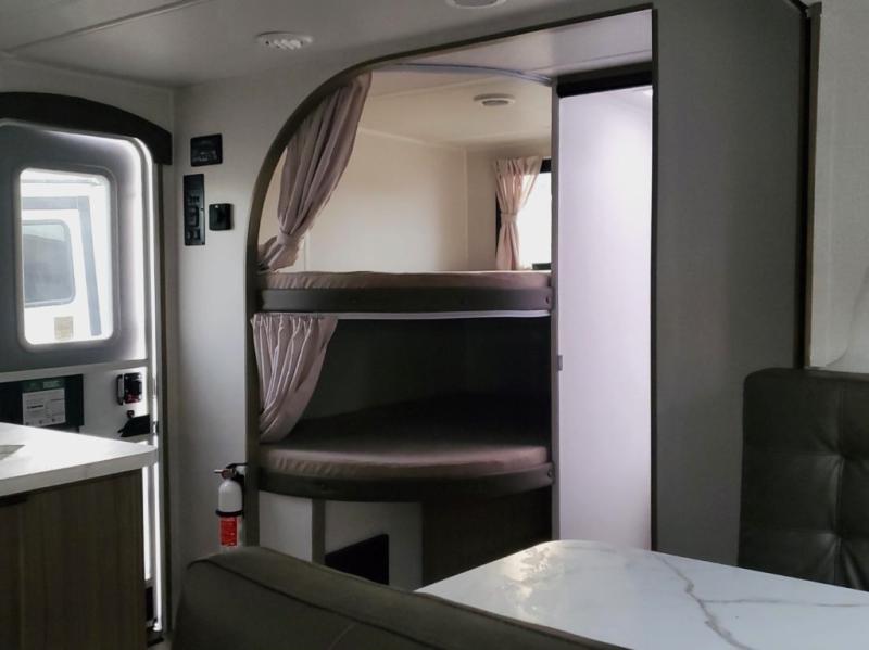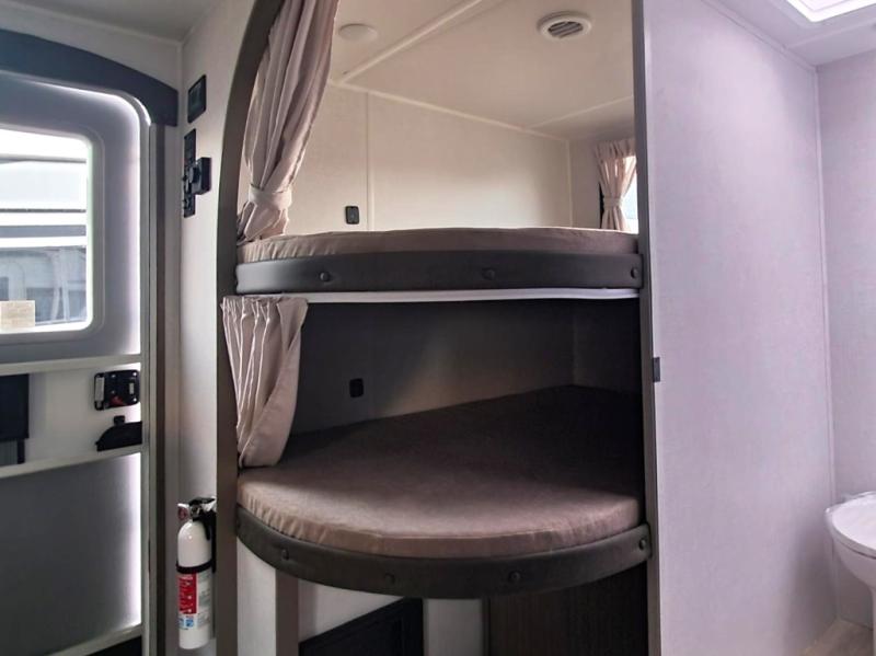 You're sure to make camping memories in this spacious travel trailer! You can easily sleep eight people each night thanks to the double-size bunks, the custom king bed with Versa Tilt in the front bedroom plus the Versa-Lounge within the large slide out! The cooktop and microwave oven will let you make meals each day, and you'll appreciate the hidden pantry with shelves behind the fireplace. There is also a booth dinette where you can dine together or play a game of cards after dinner is cleaned up, or you may just find yourselves outdoors under the 18' awning with 4K blade lighting. And don't overlook the full bath, complete with a tub/shower that will make bath time easier if you have little ones.