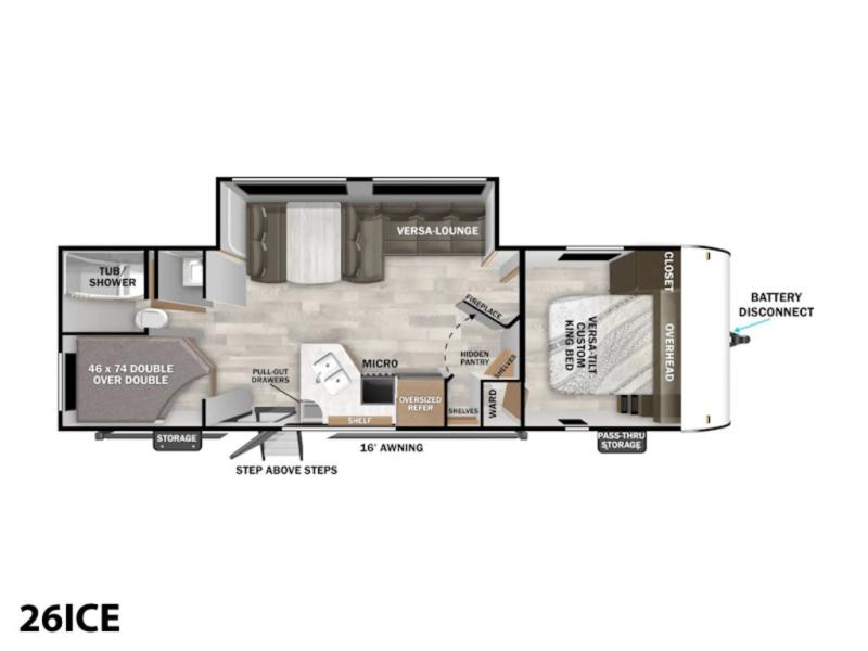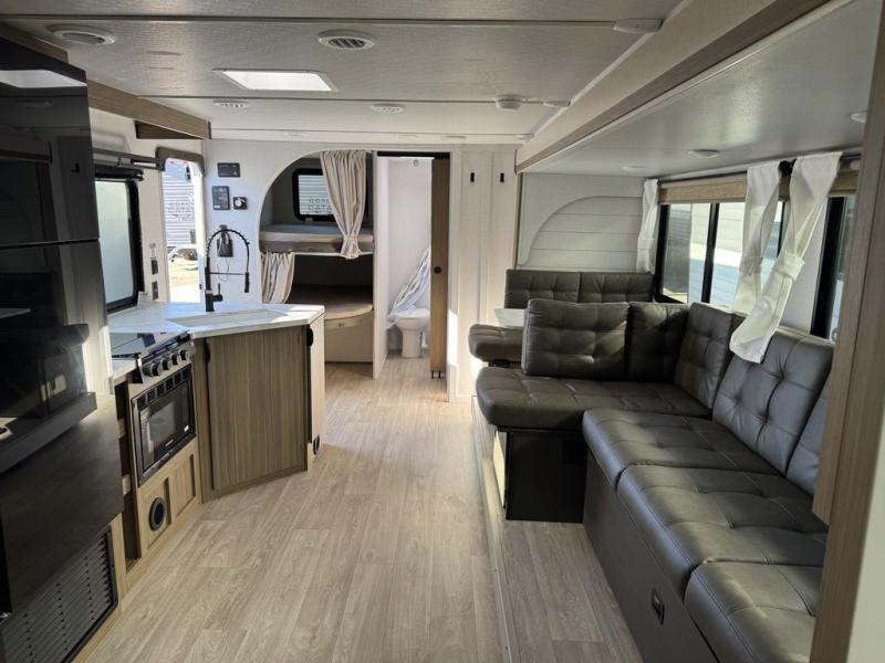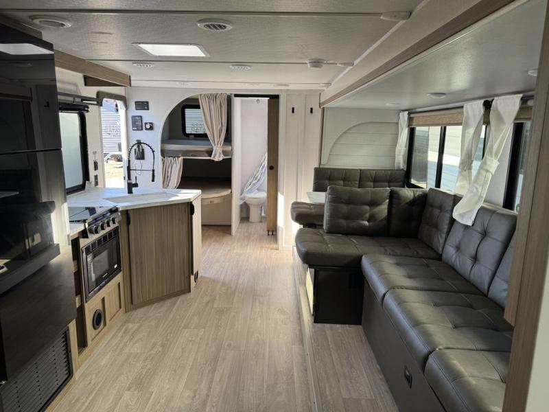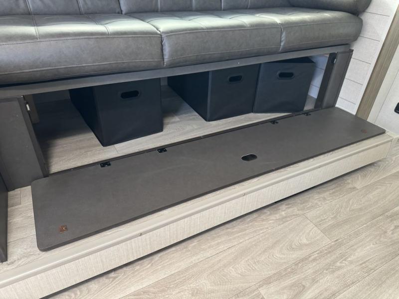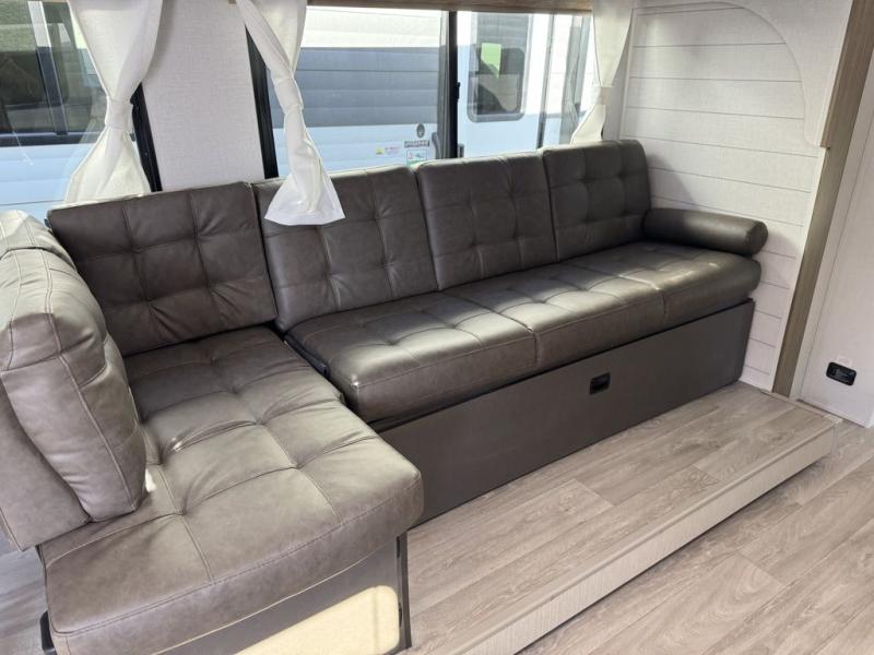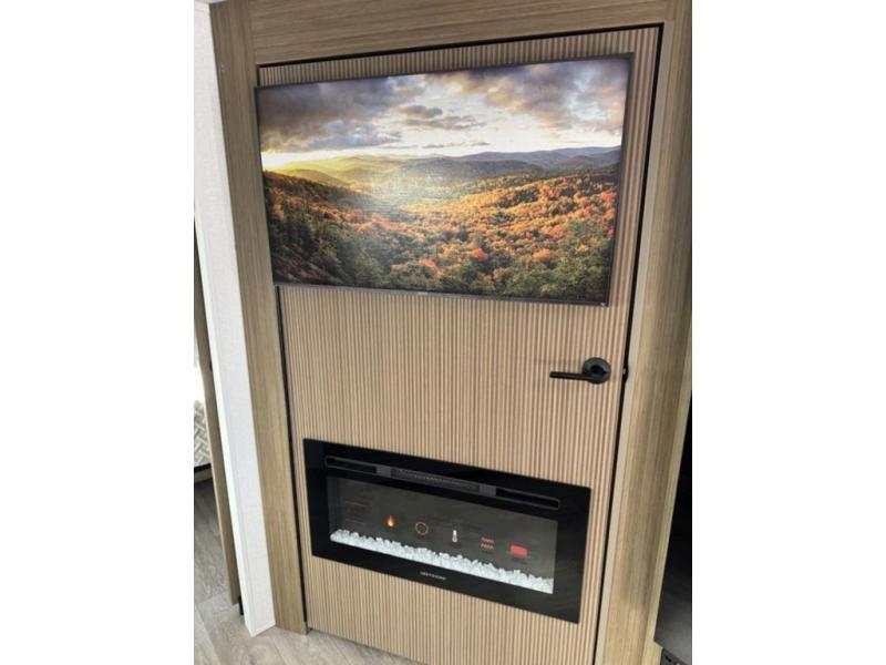 You're sure to make camping memories in this spacious travel trailer! You can easily sleep eight people each night thanks to the double-size bunks, the custom king bed with Versa Tilt in the front bedroom plus the Versa-Lounge within the large slide out! The cooktop and microwave oven will let you make meals each day, and you'll appreciate the hidden pantry with shelves behind the fireplace. There is also a booth dinette where you can dine together or play a game of cards after dinner is cleaned up, or you may just find yourselves outdoors under the 18' awning with 4K blade lighting. And don't overlook the full bath, complete with a tub/shower that will make bath time easier if you have little ones.