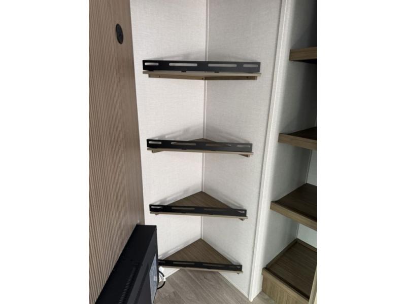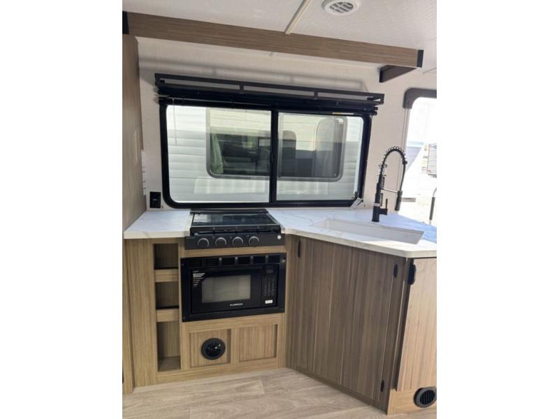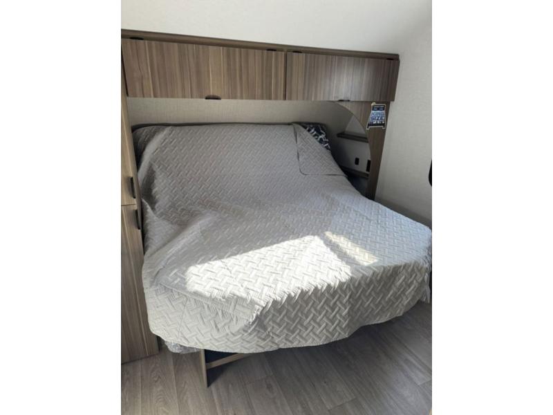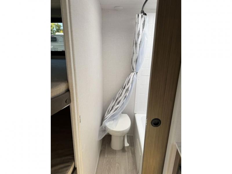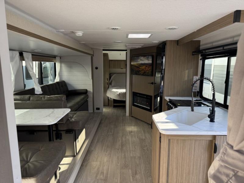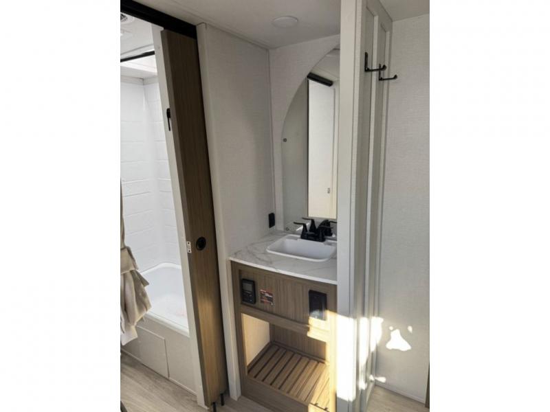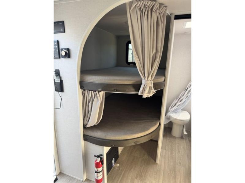 You're sure to make camping memories in this spacious travel trailer! You can easily sleep eight people each night thanks to the double-size bunks, the custom king bed with Versa Tilt in the front bedroom plus the Versa-Lounge within the large slide out! The cooktop and microwave oven will let you make meals each day, and you'll appreciate the hidden pantry with shelves behind the fireplace. There is also a booth dinette where you can dine together or play a game of cards after dinner is cleaned up, or you may just find yourselves outdoors under the 18' awning with 4K blade lighting. And don't overlook the full bath, complete with a tub/shower that will make bath time easier if you have little ones.