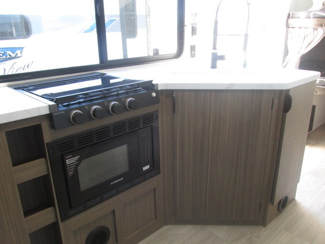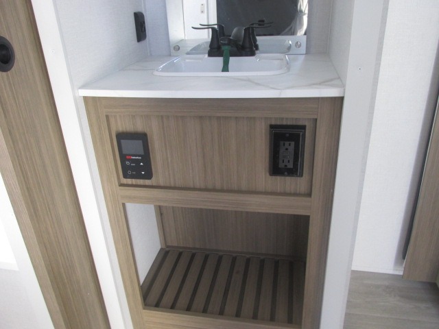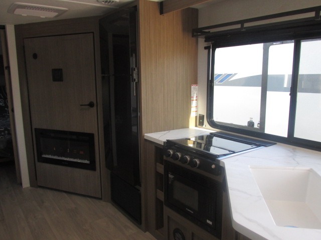 You're sure to make camping memories in this spacious travel trailer! You can easily sleep eight people each night thanks to the double-size bunks, the custom king bed with Versa Tilt in the front bedroom plus the Versa-Lounge within the large slide out! The cooktop and microwave oven will let you make meals each day, and you'll appreciate the hidden pantry with shelves behind the fireplace. There is also a booth dinette where you can dine together or play a game of cards after dinner is cleaned up, or you may just find yourselves outdoors under the 18' awning with 4K blade lighting. And don't overlook the full bath, complete with a tub/shower that will make bath time easier if you have little ones.