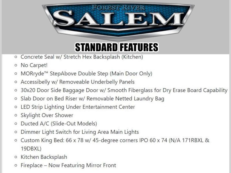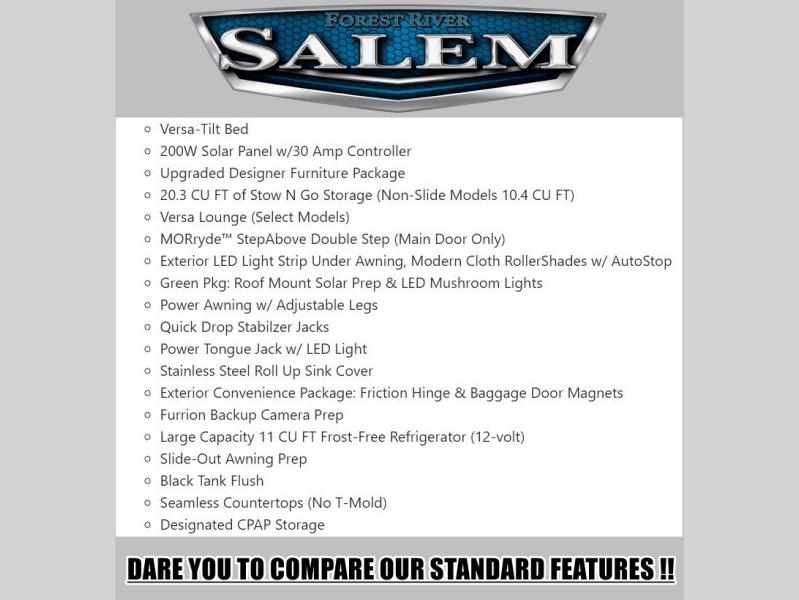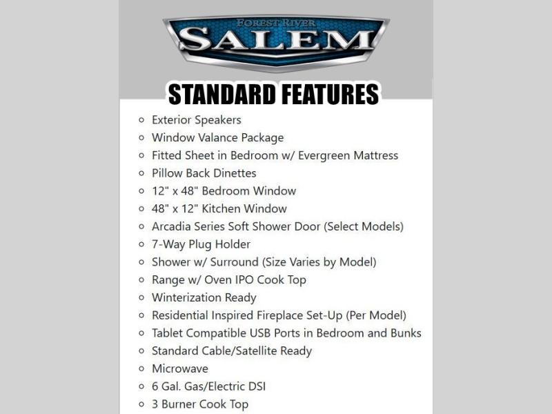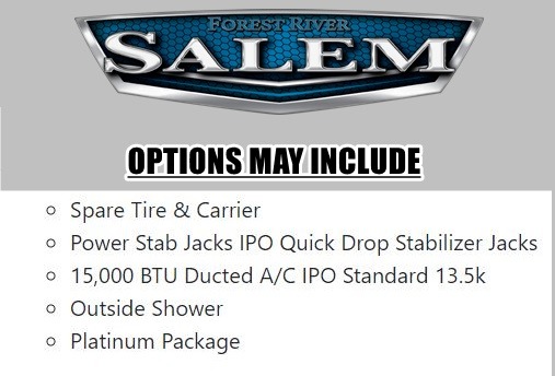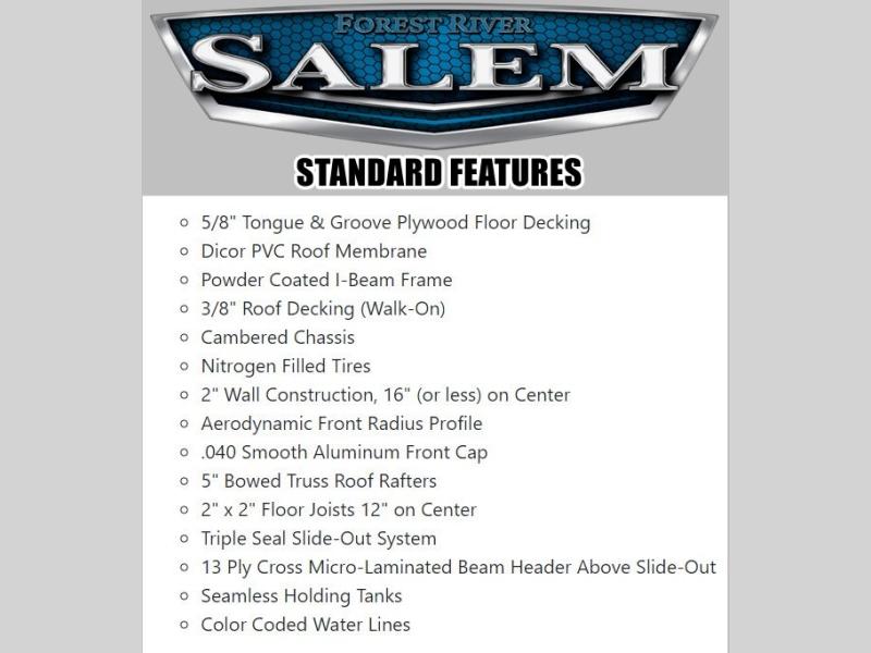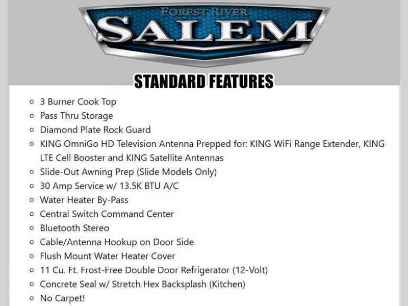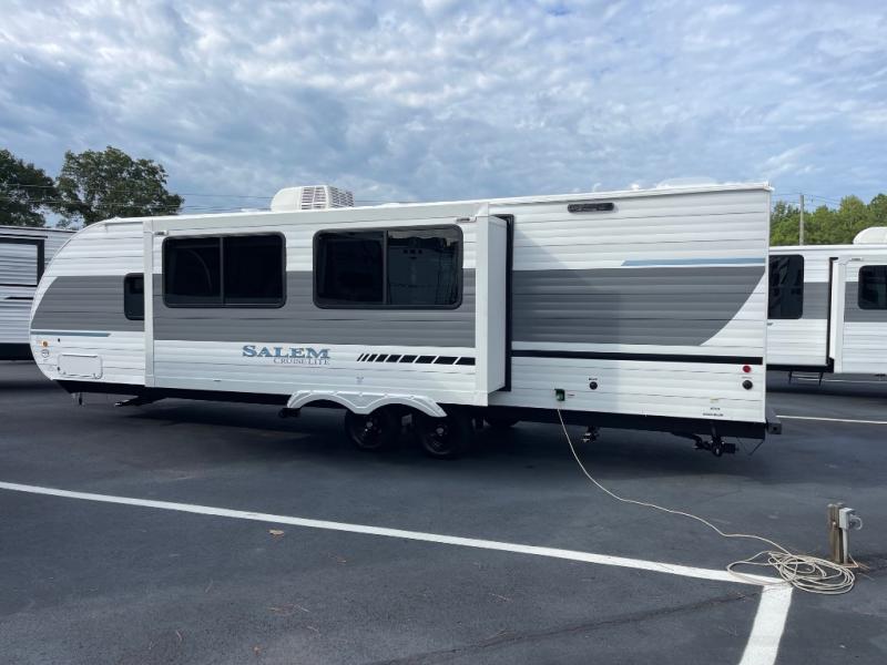 The Salem Cruise Lite travel trailers are packed with hassle-free camping amenities! There are a variety of floorplans to choose from so you can find the best one to fit your needs. The enclosed Accessibelly will help protect against the elements and debris during transport, and the exterior is sure to be eye-catching! There are stylish roller shades inside, along with updated backsplash, elegant curtain rods and curtains, plus many more interior comforts! Choose a Salem Cruise Lite travel trailer today for quality and value!