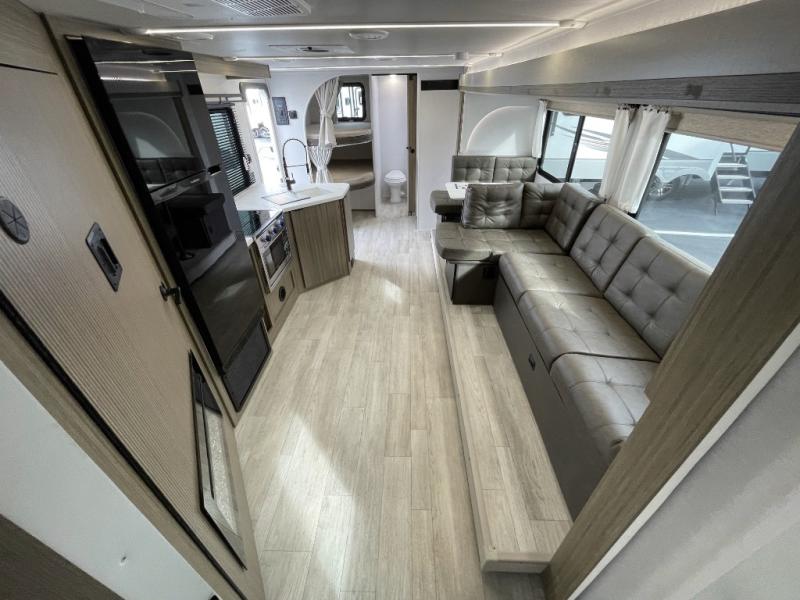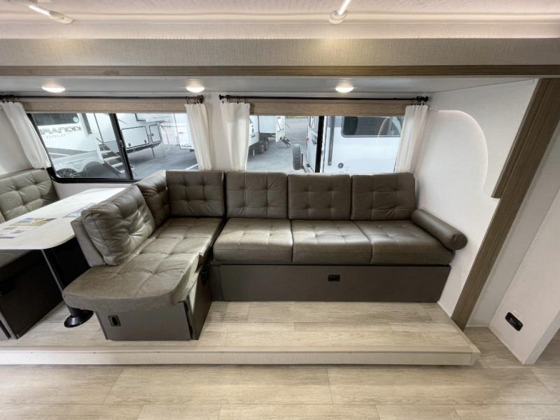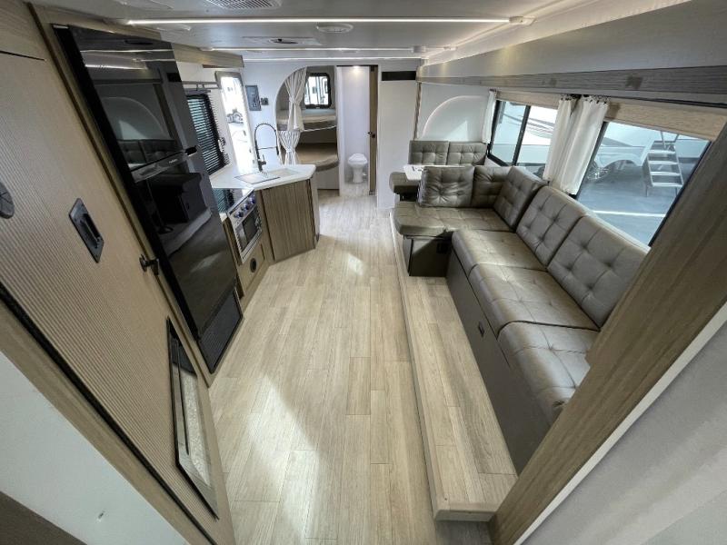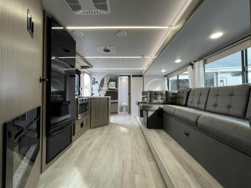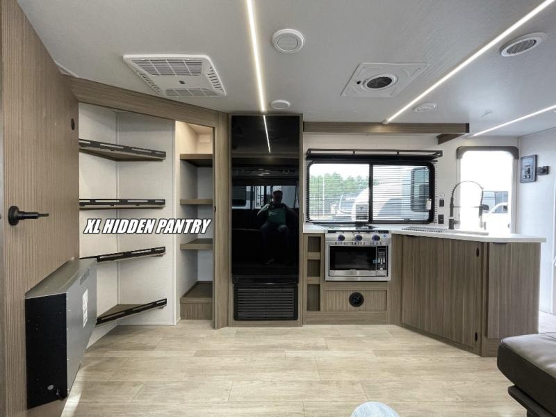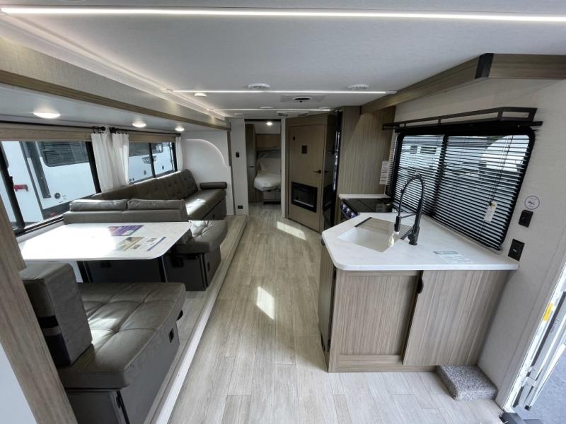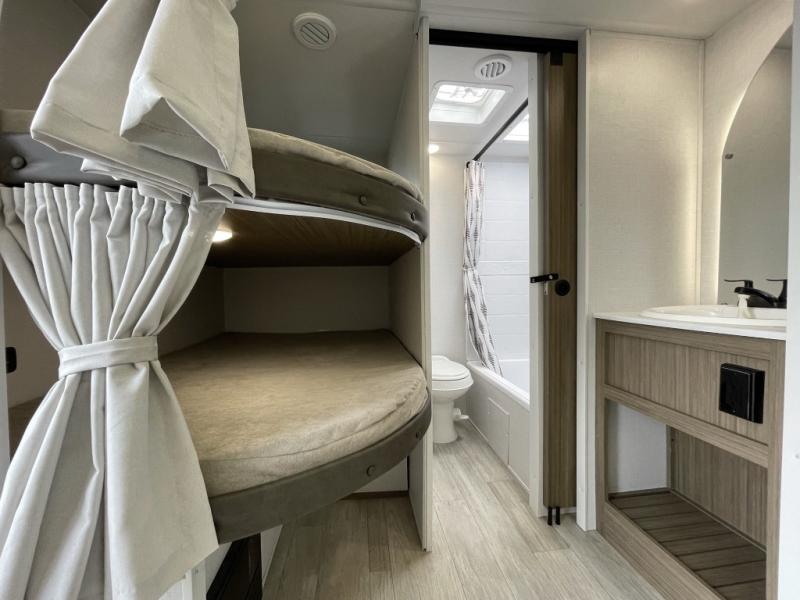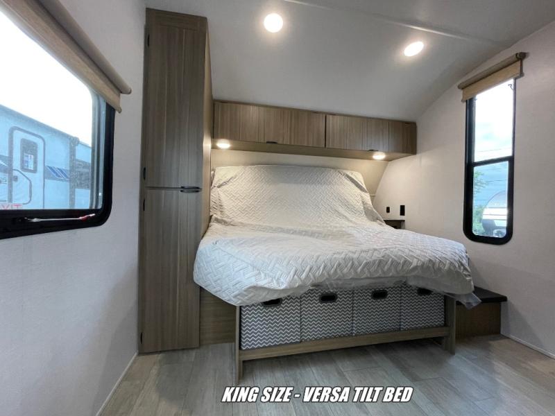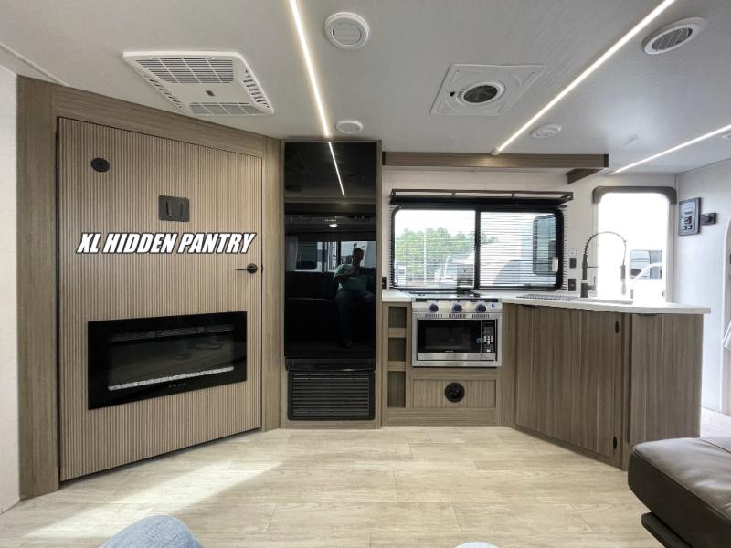 You're sure to make camping memories in this spacious travel trailer! You can easily sleep eight people each night thanks to the double-size bunks, the custom king bed with Versa Tilt in the front bedroom plus the Versa-Lounge within the large slide out! The cooktop and microwave oven will let you make meals each day, and you'll appreciate the hidden pantry with shelves behind the fireplace. There is also a booth dinette where you can dine together or play a game of cards after dinner is cleaned up, or you may just find yourselves outdoors under the 18' awning with 4K blade lighting. And don't overlook the full bath, complete with a tub/shower that will make bath time easier if you have little ones.