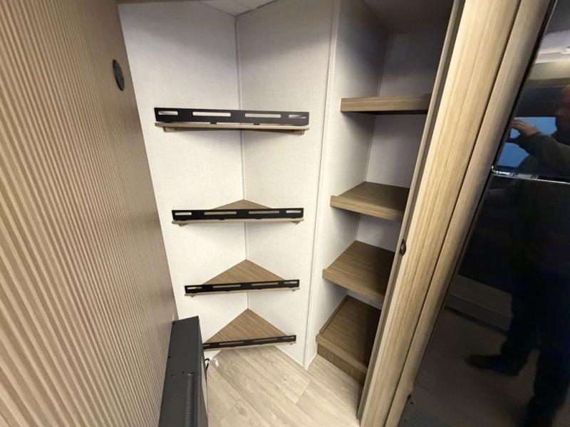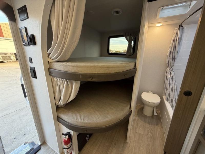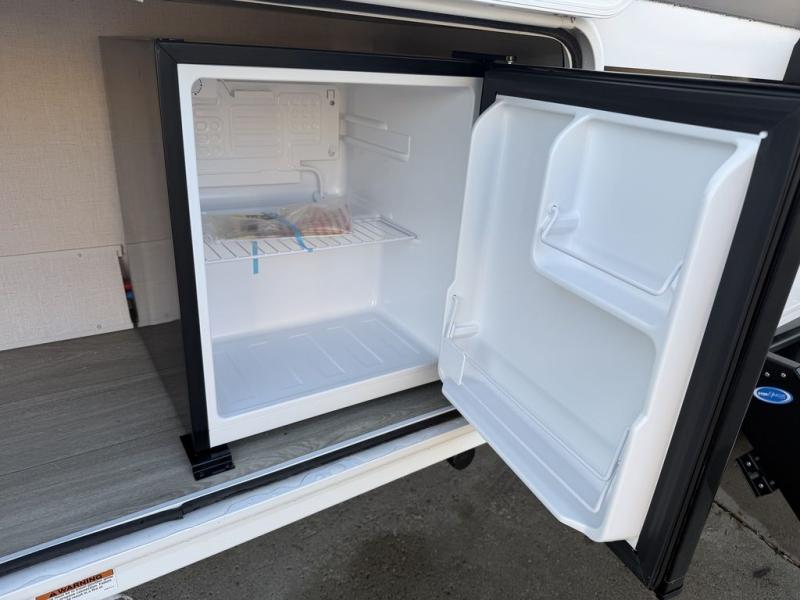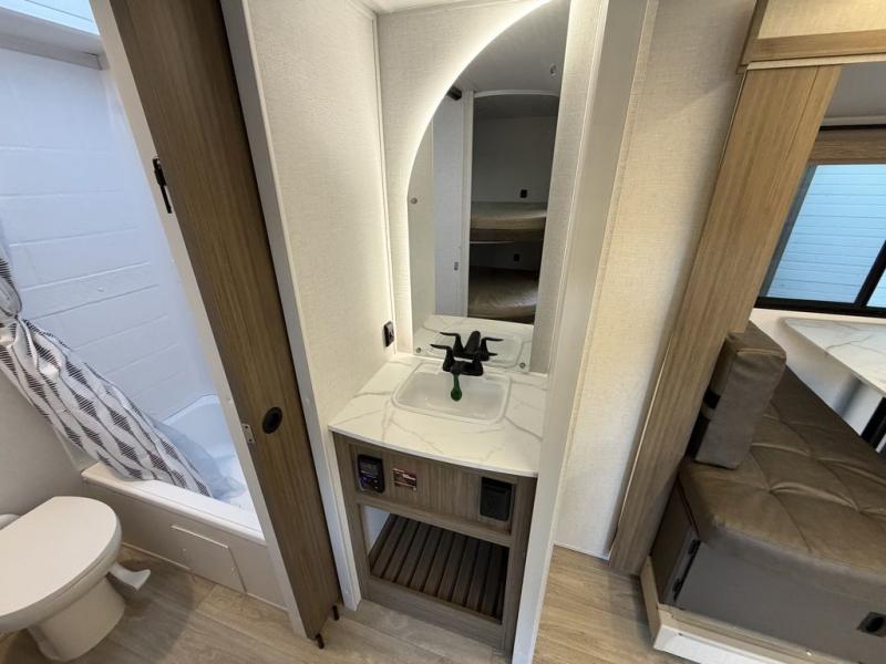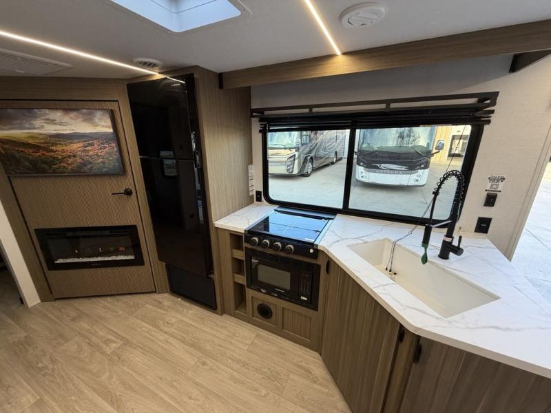 You're sure to make camping memories in this spacious travel trailer! You can easily sleep eight people each night thanks to the double-size bunks, the custom king bed with Versa Tilt in the front bedroom plus the Versa-Lounge within the large slide out! The cooktop and microwave oven will let you make meals each day, and you'll appreciate the hidden pantry with shelves behind the fireplace. There is also a booth dinette where you can dine together or play a game of cards after dinner is cleaned up, or you may just find yourselves outdoors under the 18' awning with 4K blade lighting. And don't overlook the full bath, complete with a tub/shower that will make bath time easier if you have little ones.