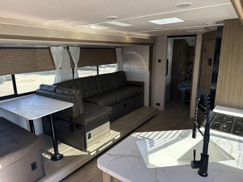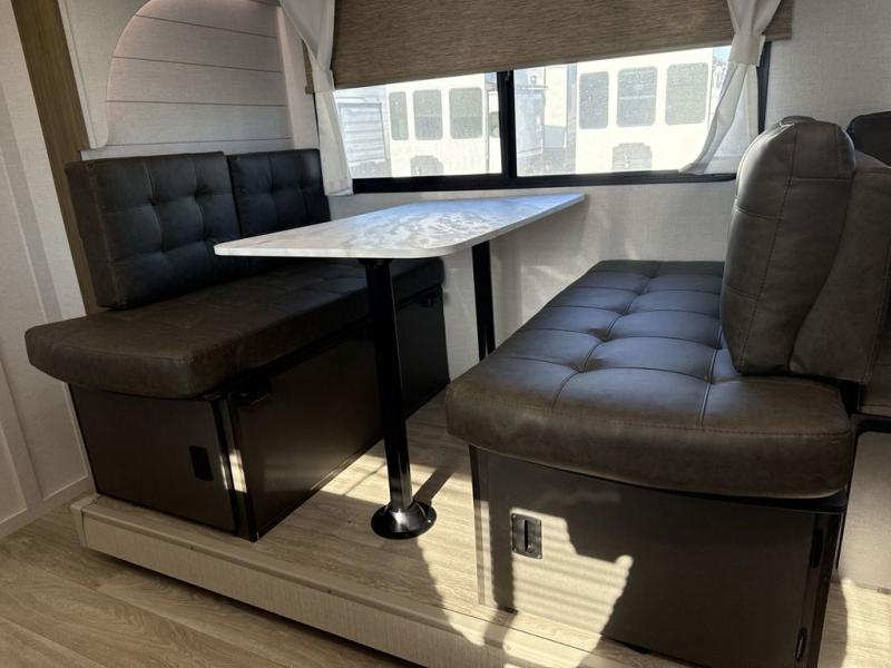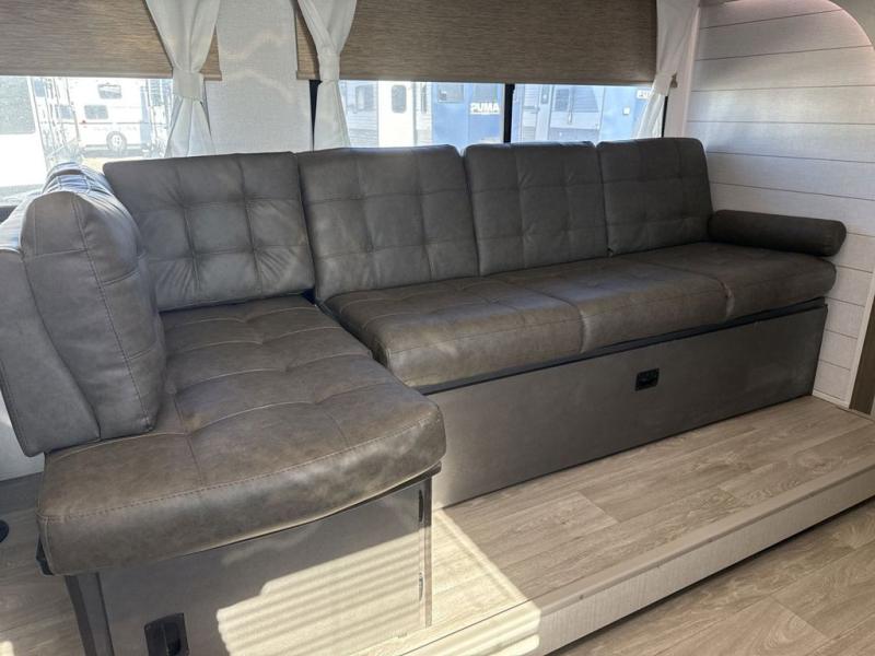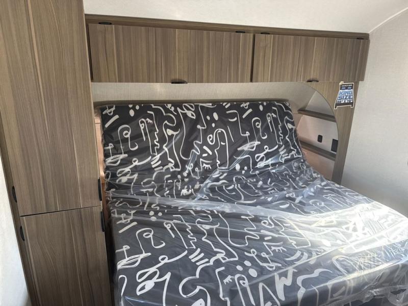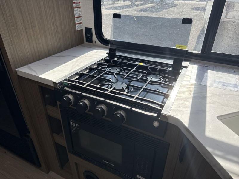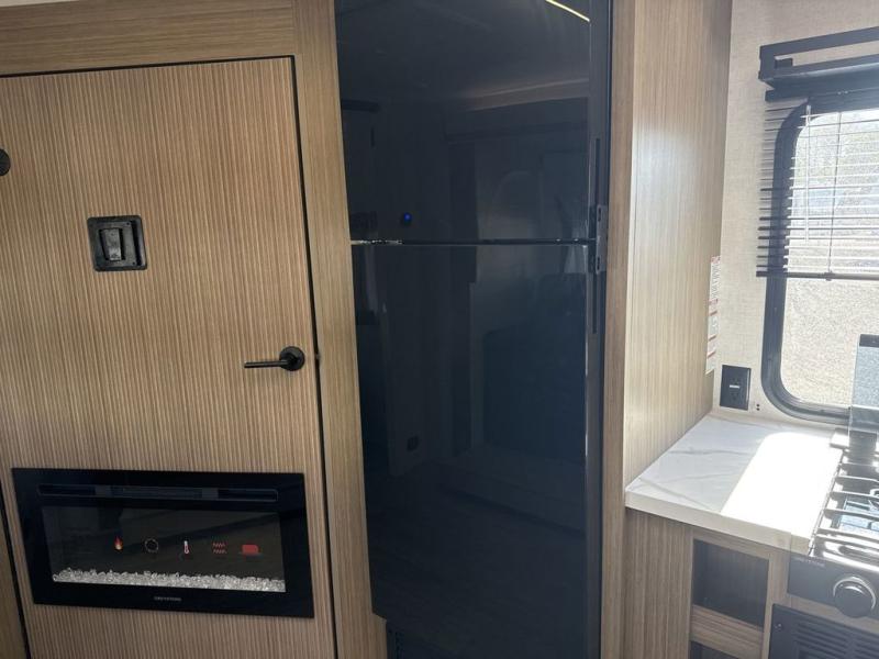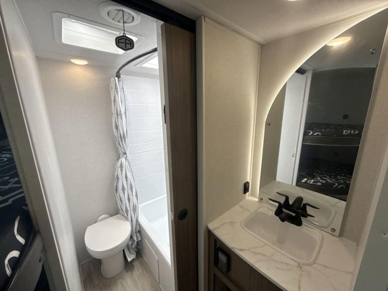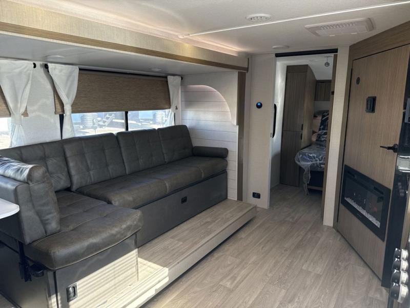 You're sure to make camping memories in this spacious travel trailer! You can easily sleep eight people each night thanks to the double-size bunks, the custom king bed with Versa Tilt in the front bedroom plus the Versa-Lounge within the large slide out! The cooktop and microwave oven will let you make meals each day, and you'll appreciate the hidden pantry with shelves behind the fireplace. There is also a booth dinette where you can dine together or play a game of cards after dinner is cleaned up, or you may just find yourselves outdoors under the 18' awning with 4K blade lighting. And don't overlook the full bath, complete with a tub/shower that will make bath time easier if you have little ones.