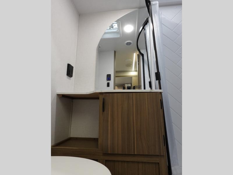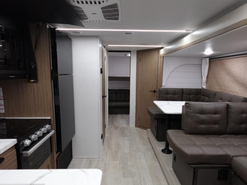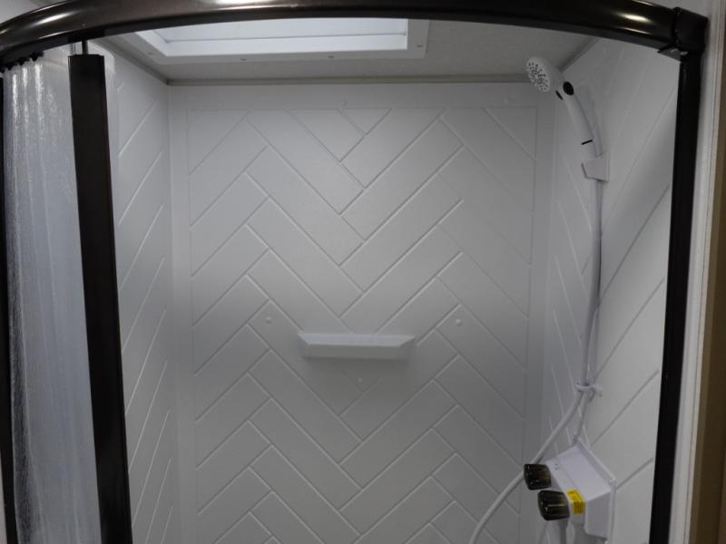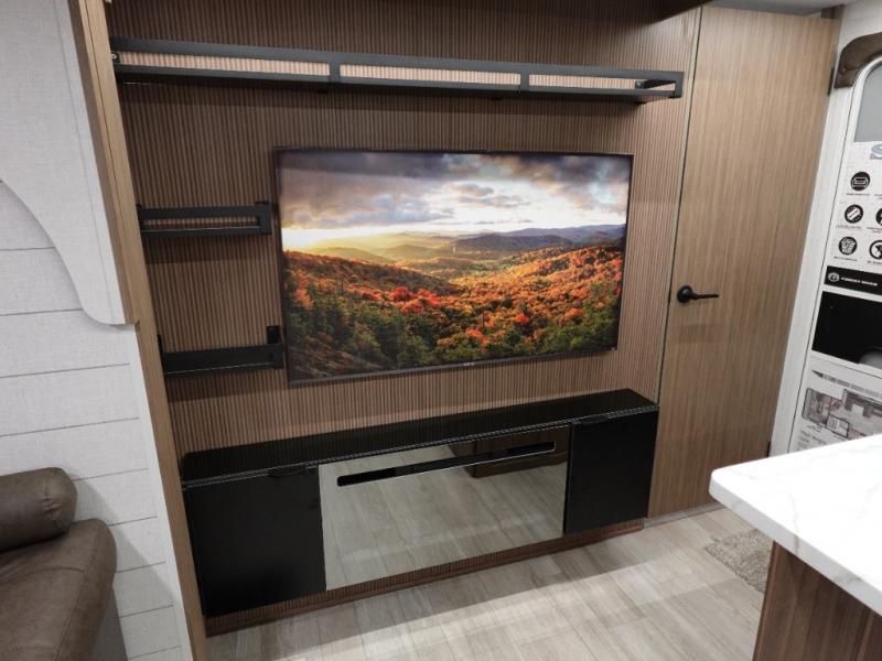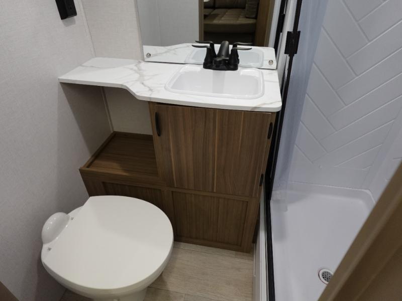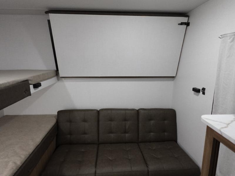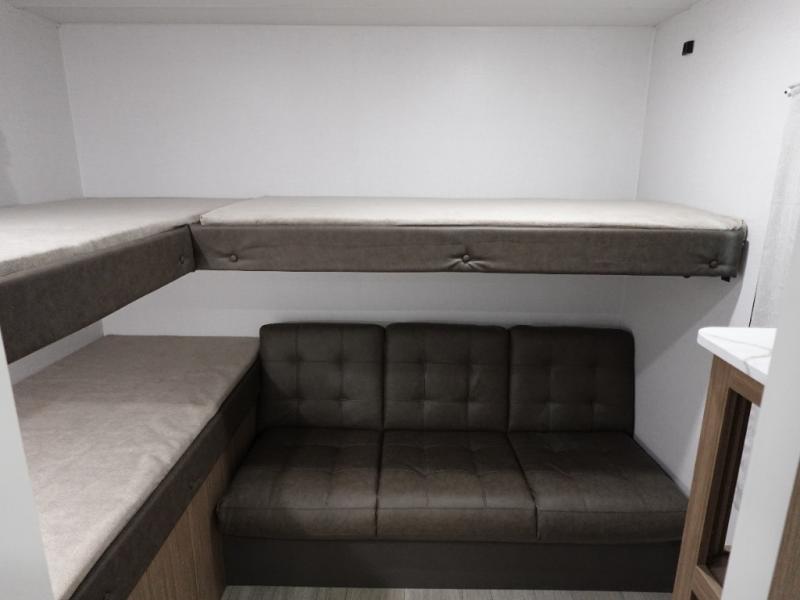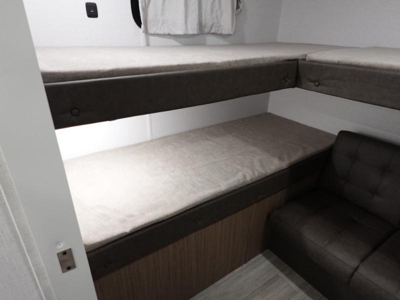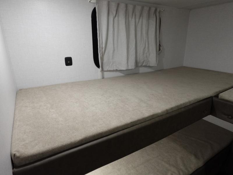 This versatile bunkhouse travel trailer is big enough for the whole family! The private bunkhouse has a set of 30" x 74" bunk beds and a 30" x 74" bunk bed above a Jiffy sofa. Just outside the bunkhouse is a pantry big enough to store everyone's favorite snacks, and a full bathroom with a walk-in shower. The cooktop is just waiting for you to create a delicious meal, and the U-shaped dinette welcomes everyone to enjoy each meal in comfort, plus there is a large panoramic window for a perfect view of your surroundings. Any time of day kick back on the Versa-lounge and relax by the fireplace at the entertainment center. The exterior features a pass-through storage area for you to keep your outdoor camping gear stowed away when not in use, a 16' awning to protect you, and an exterior camp kitchen!