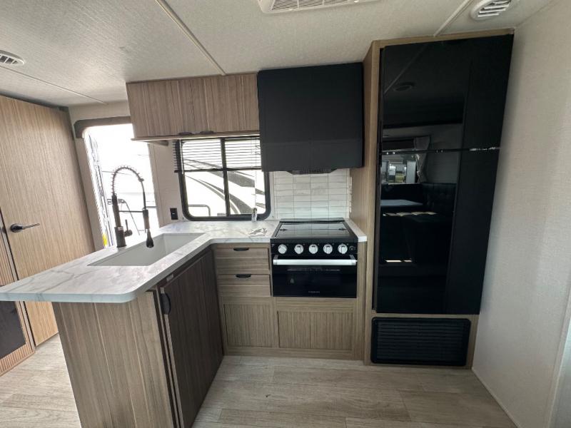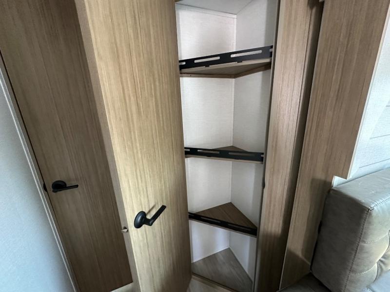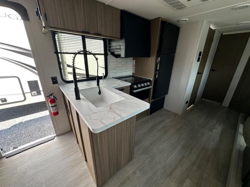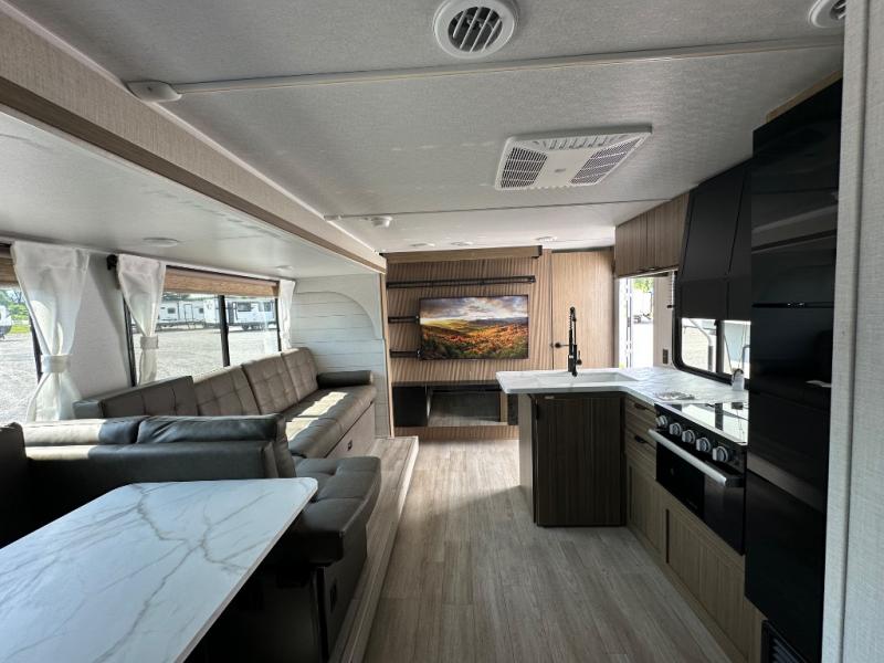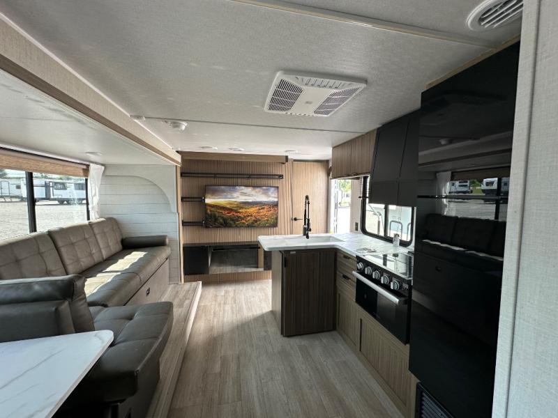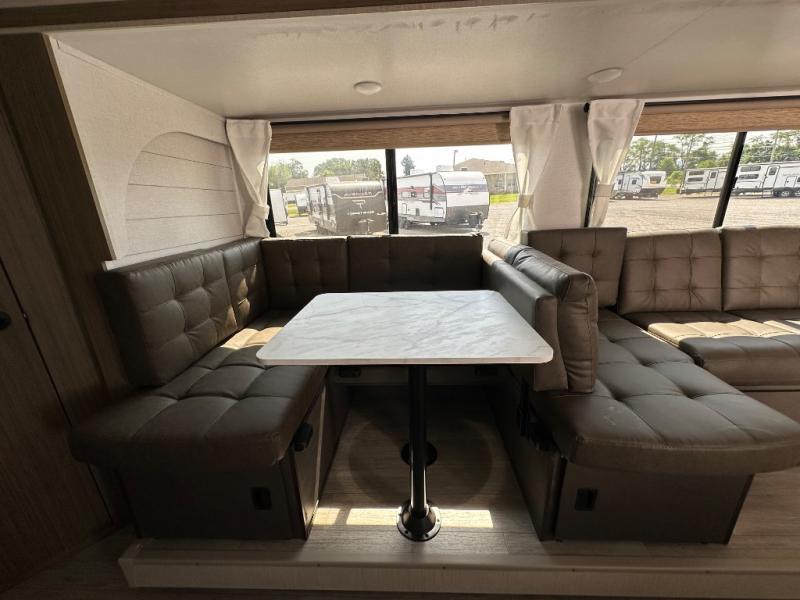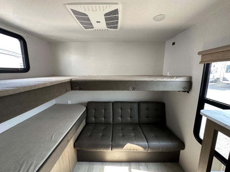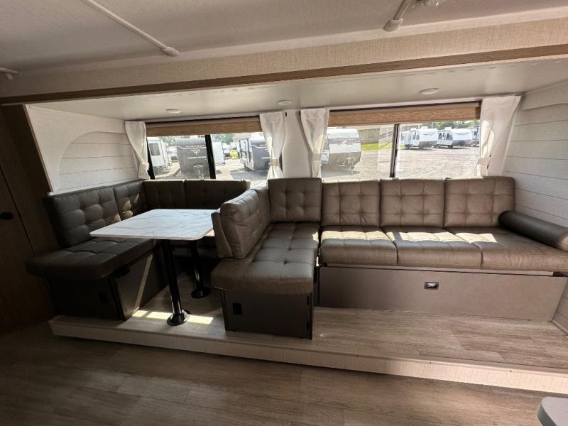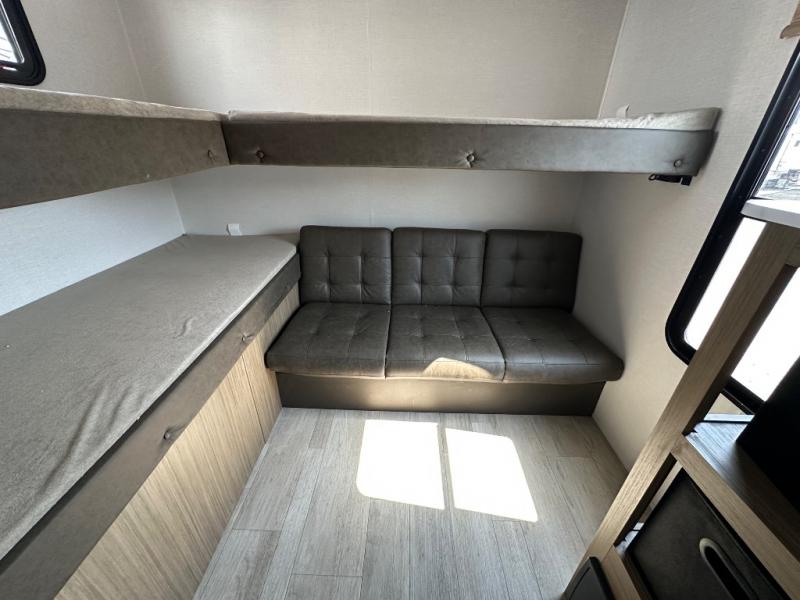 This versatile bunkhouse travel trailer is big enough for the whole family! The private bunkhouse has a set of 30" x 74" bunk beds and a 30" x 74" bunk bed above a Jiffy sofa. Just outside the bunkhouse is a pantry big enough to store everyone's favorite snacks, and a full bathroom with a walk-in shower. The cooktop is just waiting for you to create a delicious meal, and the U-shaped dinette welcomes everyone to enjoy each meal in comfort, plus there is a large panoramic window for a perfect view of your surroundings. Any time of day kick back on the Versa-lounge and relax by the fireplace at the entertainment center. The exterior features a pass-through storage area for you to keep your outdoor camping gear stowed away when not in use, a 16' awning to protect you, and an exterior camp kitchen!