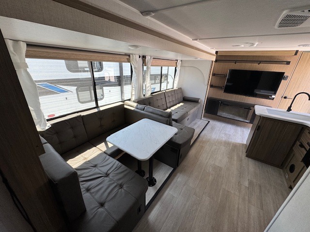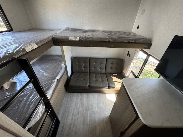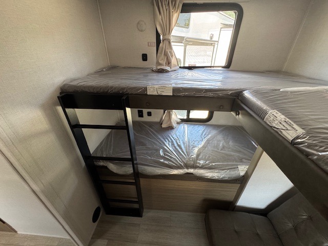 Private Rear Bunkhouse: Includes a set of bunk beds plus a fold-up bunk above a Jiffy sofa—ideal for kids, guests, or extra storage.
