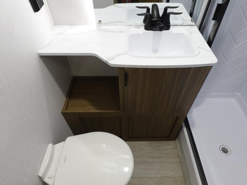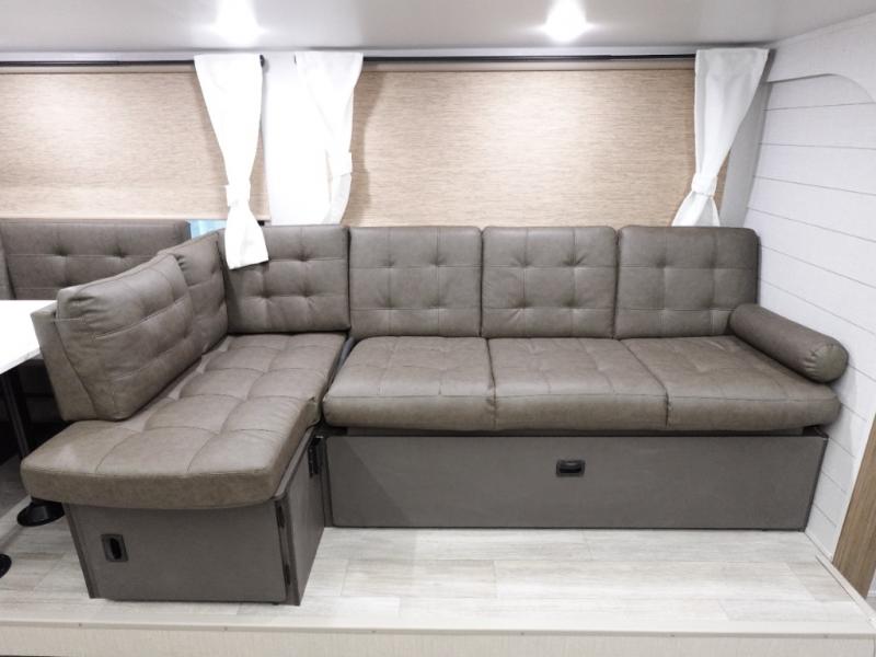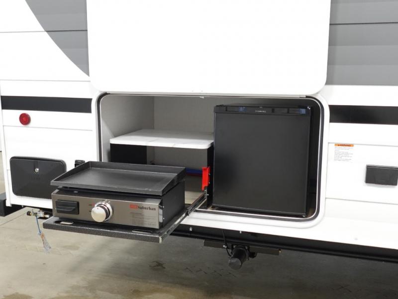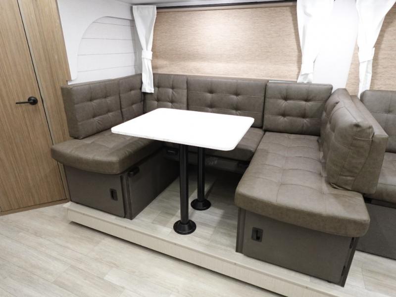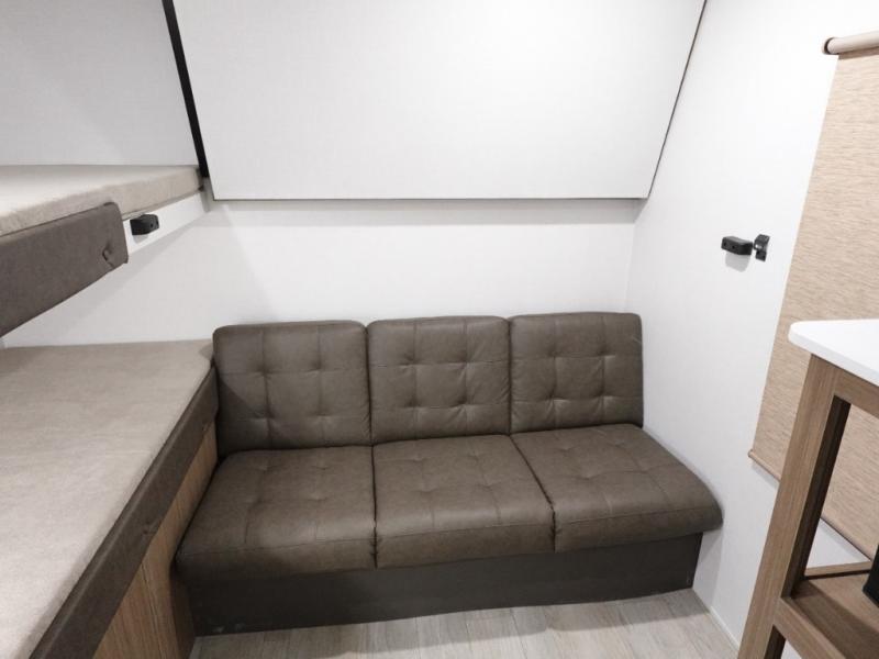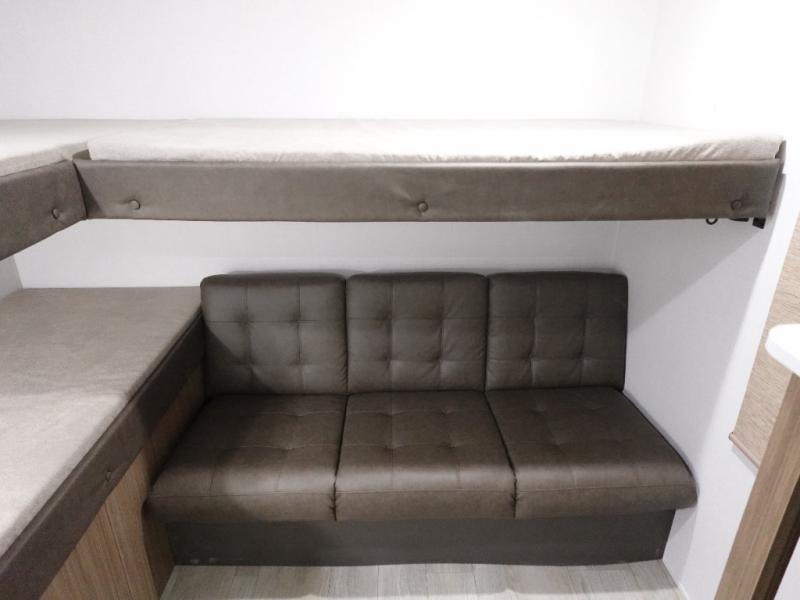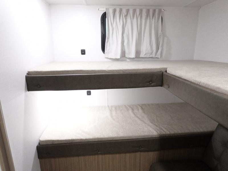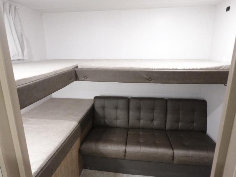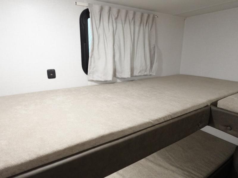 This versatile bunkhouse travel trailer is big enough for the whole family! The private bunkhouse has a set of 30" x 74" bunk beds and a 30" x 74" bunk bed above a Jiffy sofa. Just outside the bunkhouse is a pantry big enough to store everyone's favorite snacks, and a full bathroom with a walk-in shower. The cooktop is just waiting for you to create a delicious meal, and the U-shaped dinette welcomes everyone to enjoy each meal in comfort, plus there is a large panoramic window for a perfect view of your surroundings. Any time of day kick back on the Versa-lounge and relax by the fireplace at the entertainment center. The exterior features a pass-through storage area for you to keep your outdoor camping gear stowed away when not in use, a 16' awning to protect you, and an exterior camp kitchen!