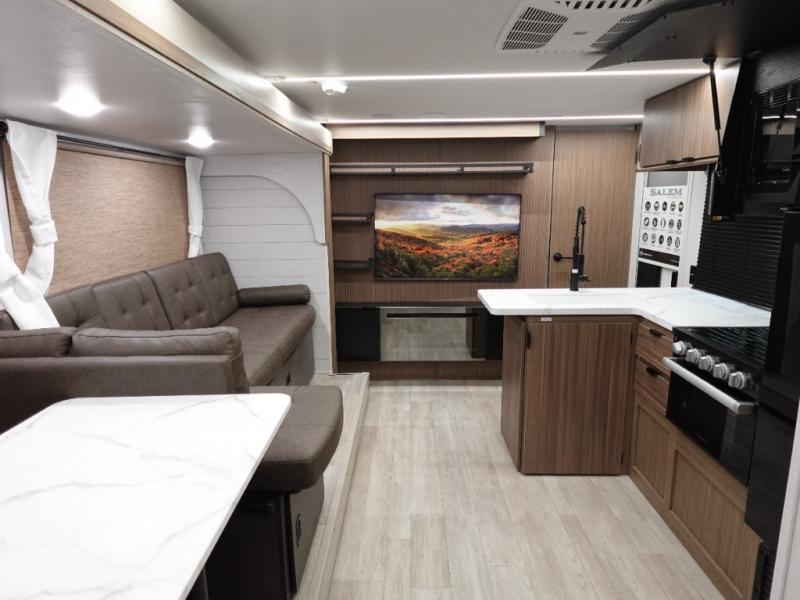 The Salem Cruise Lite travel trailers and toy haulers are value-minded units packed with great camping features! There are a variety of floorplans to choose from between two different regions. The enclosed Accessibelly will help protect against the elements and debris during transport, and the exterior retro/metal redesign is sure to be eye-catching! There are stylish roller shades inside, along with updated backsplash, elegant curtain rods and curtains, plus many more interior comforts! Choose a Salem Cruise Lite today for quality and value!