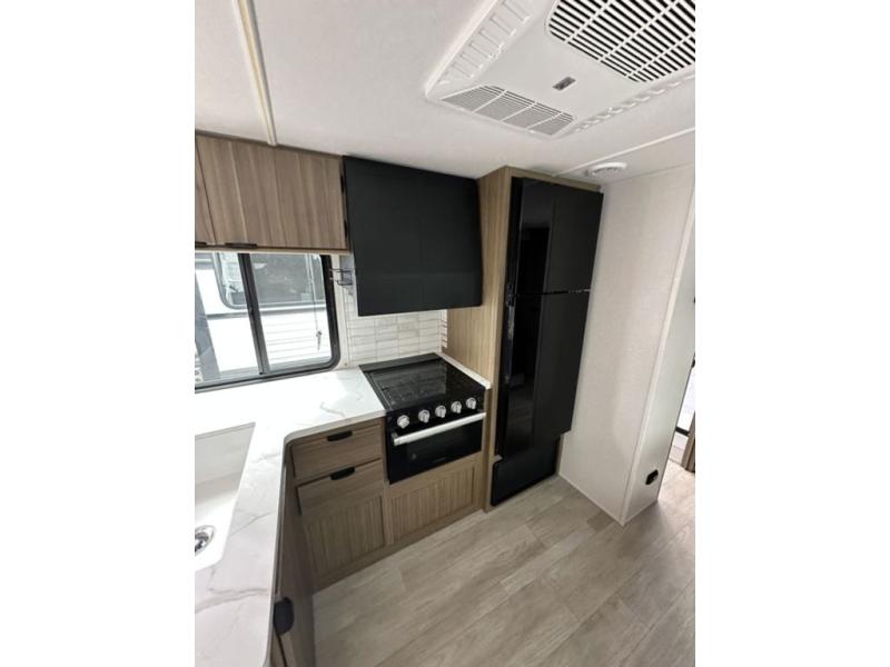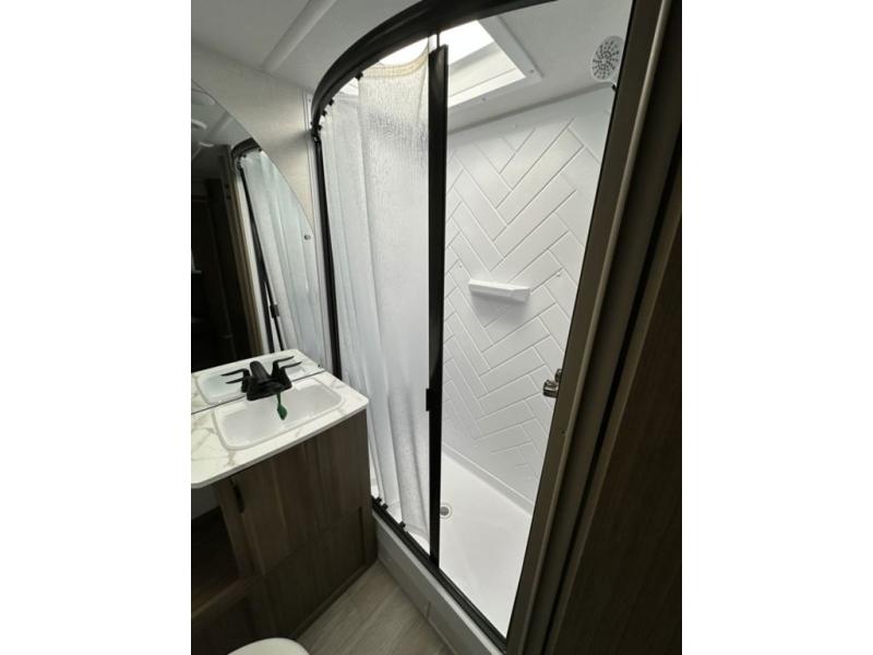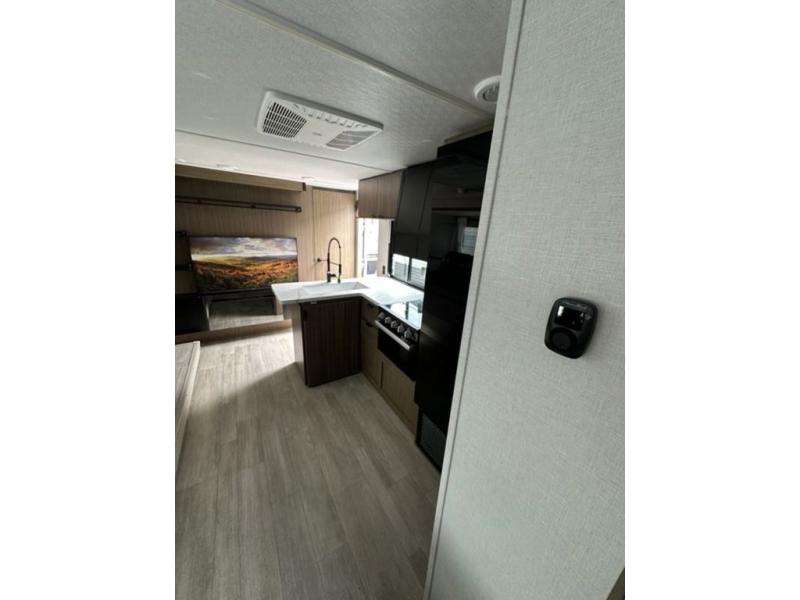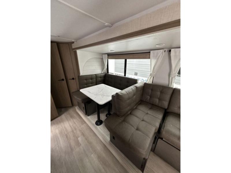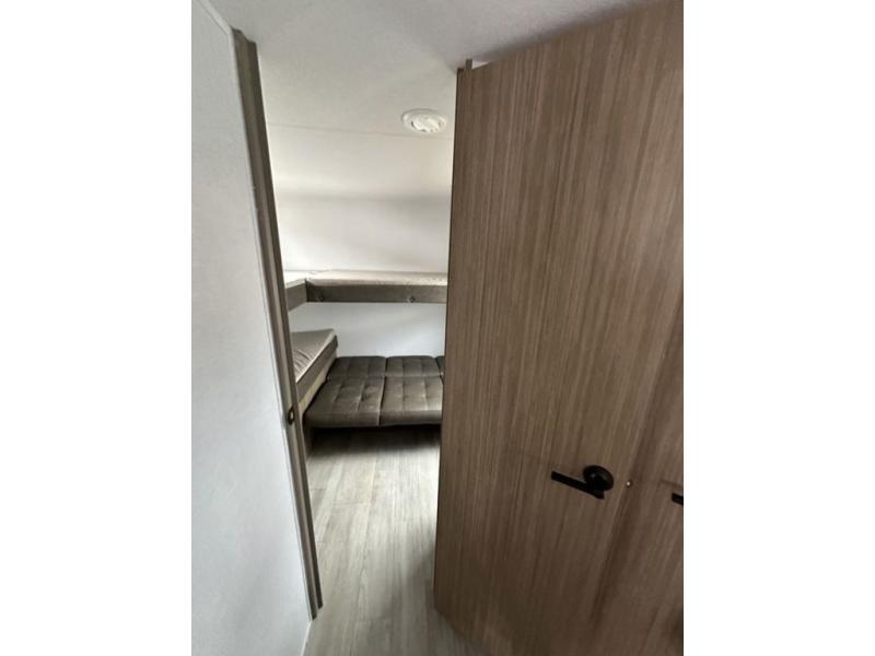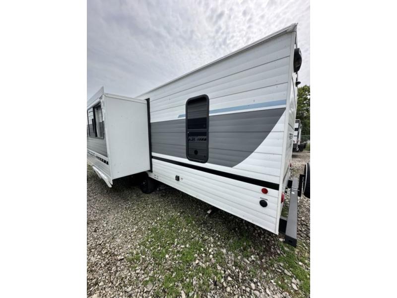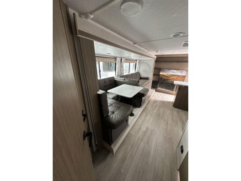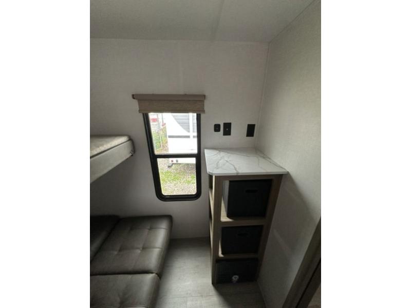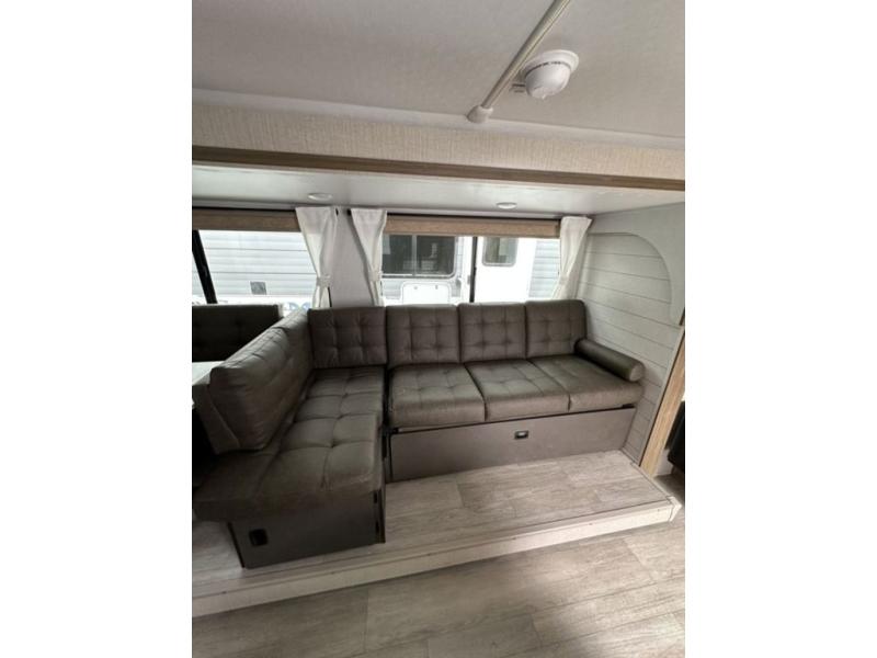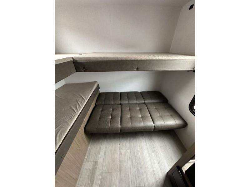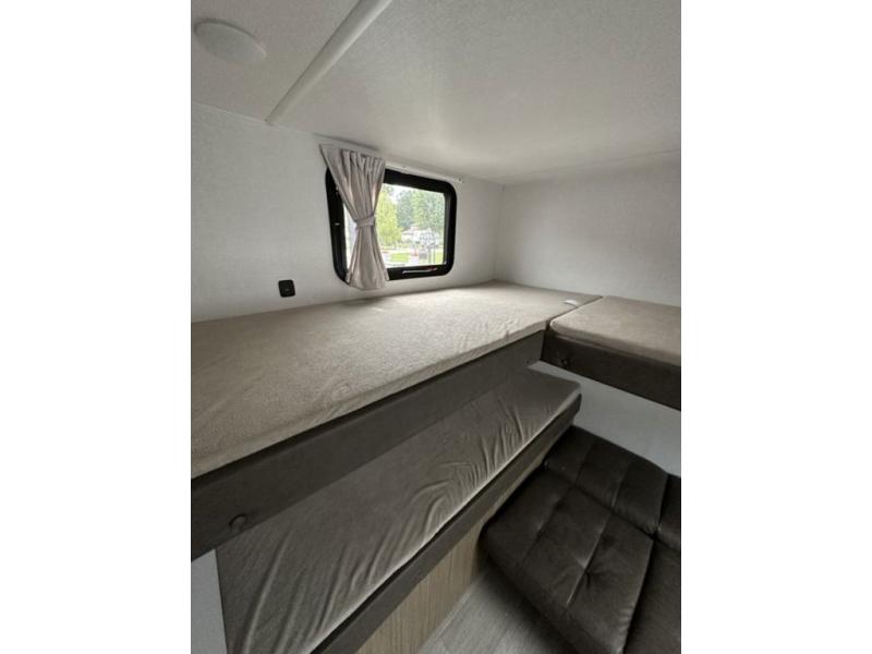 This versatile bunkhouse travel trailer is big enough for the whole family! The private bunkhouse has a set of 30" x 74" bunk beds and a 30" x 74" bunk bed above a Jiffy sofa. Just outside the bunkhouse is a pantry big enough to store everyone's favorite snacks, and a full bathroom with a walk-in shower. The cooktop is just waiting for you to create a delicious meal, and the U-shaped dinette welcomes everyone to enjoy each meal in comfort, plus there is a large panoramic window for a perfect view of your surroundings. Any time of day kick back on the Versa-lounge and relax by the fireplace at the entertainment center. The exterior features a pass-through storage area for you to keep your outdoor camping gear stowed away when not in use, a 16' awning to protect you, and an exterior camp kitchen!