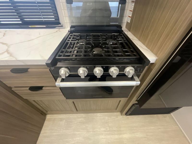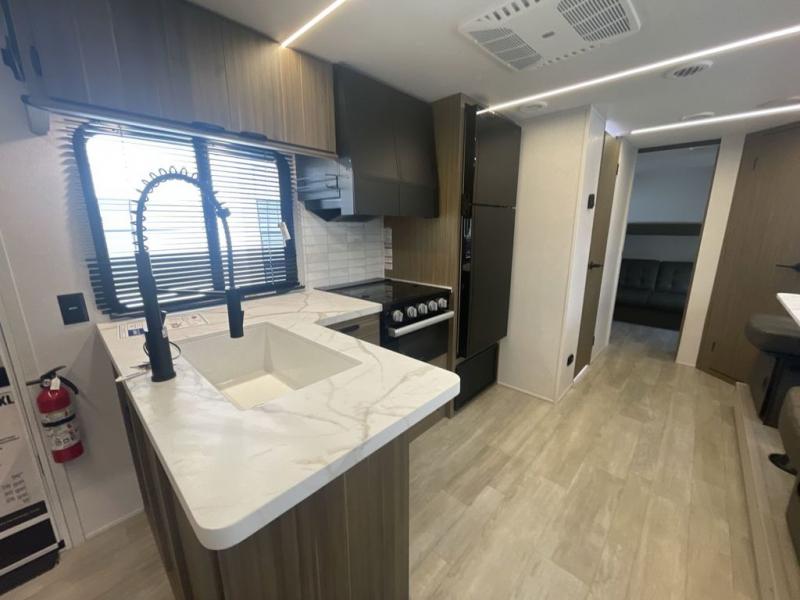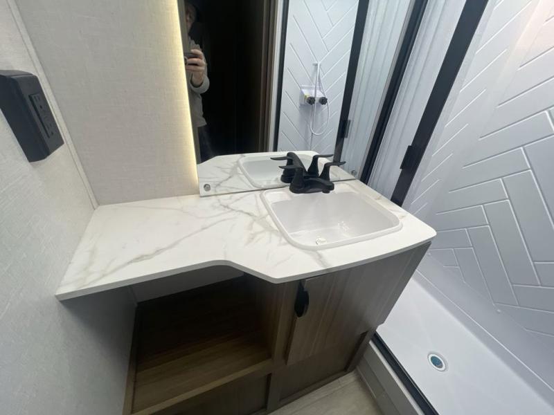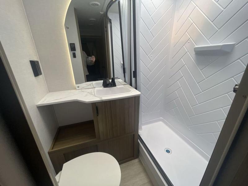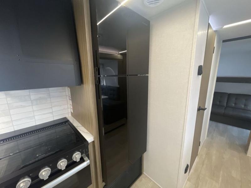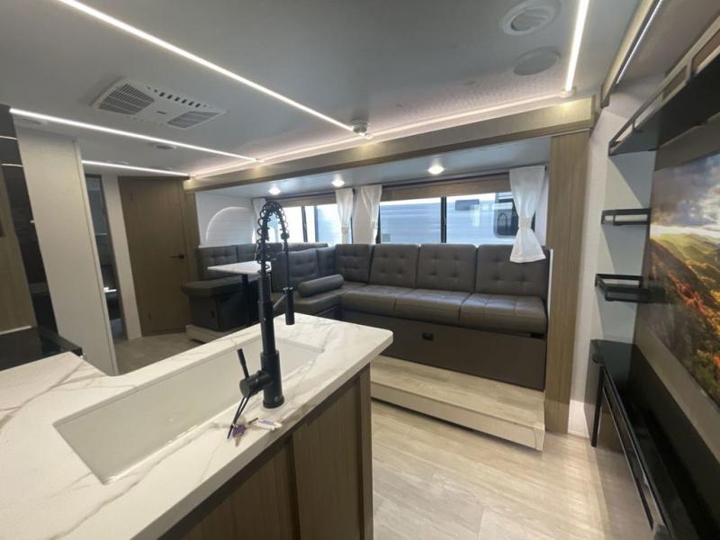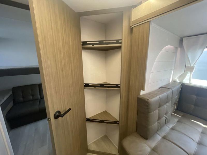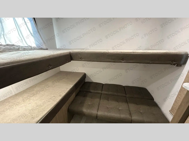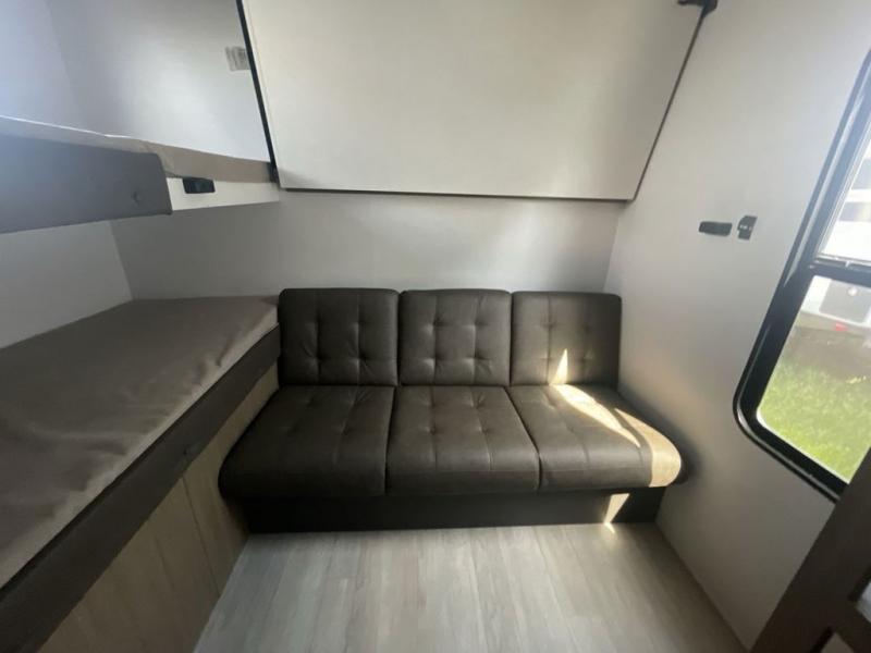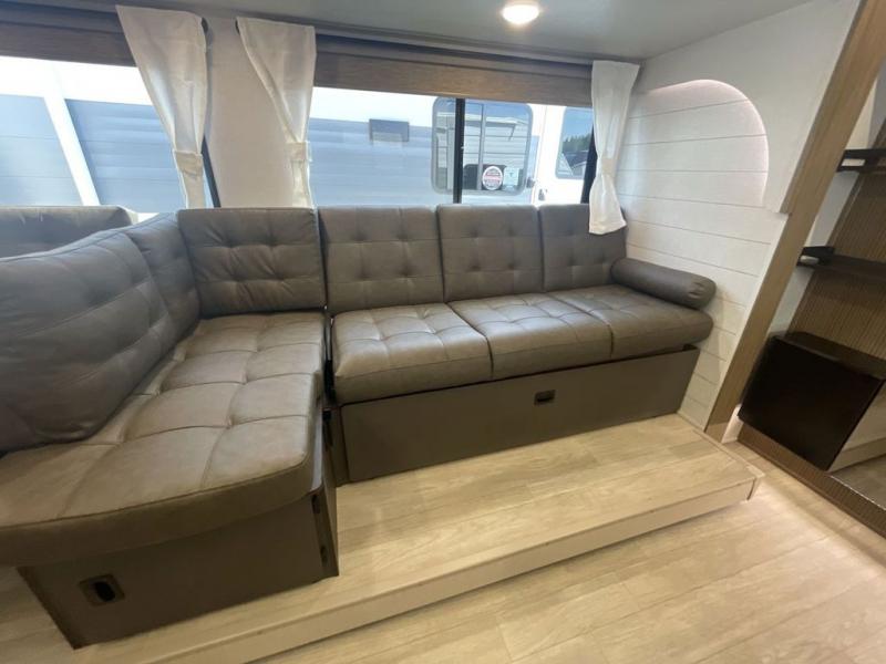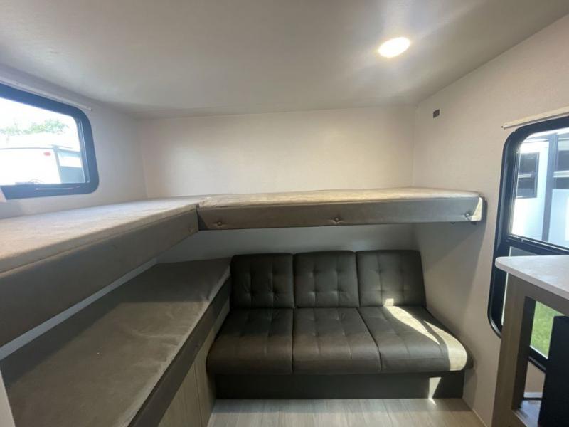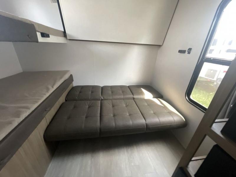 This versatile bunkhouse travel trailer is big enough for the whole family! The private bunkhouse has a set of 30" x 74" bunk beds and a 30" x 74" bunk bed above a Jiffy sofa. Just outside the bunkhouse is a pantry big enough to store everyone's favorite snacks, and a full bathroom with a walk-in shower. The cooktop is just waiting for you to create a delicious meal, and the U-shaped dinette welcomes everyone to enjoy each meal in comfort, plus there is a large panoramic window for a perfect view of your surroundings. Any time of day kick back on the Versa-lounge and relax by the fireplace at the entertainment center. The exterior features a pass-through storage area for you to keep your outdoor camping gear stowed away when not in use, a 16' awning to protect you, and an exterior camp kitchen!