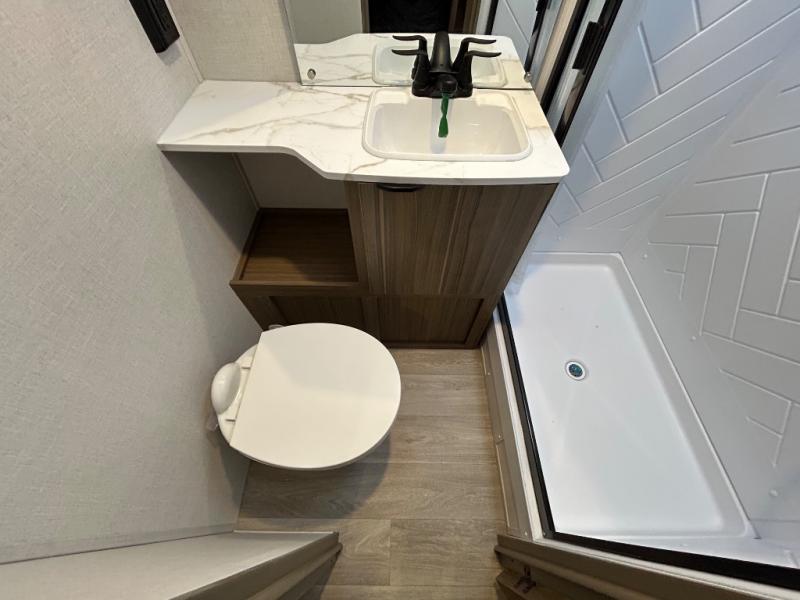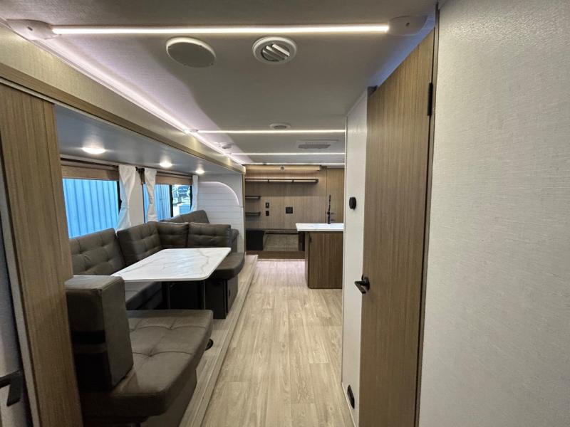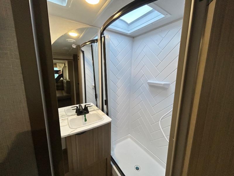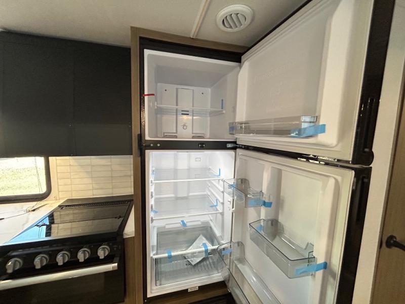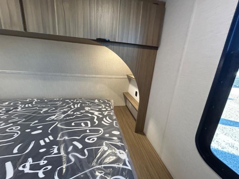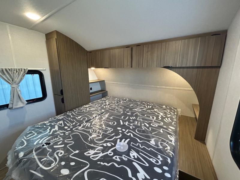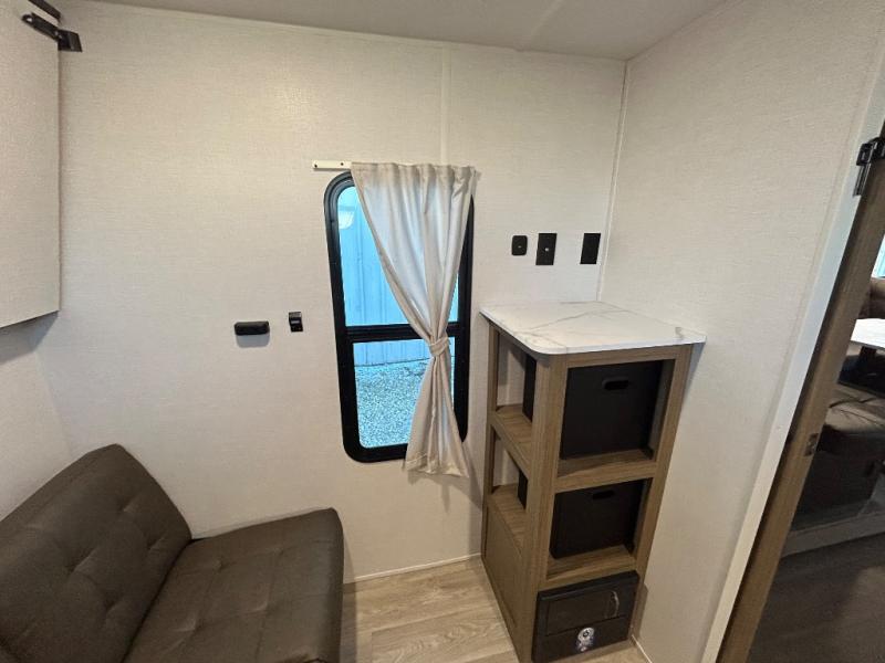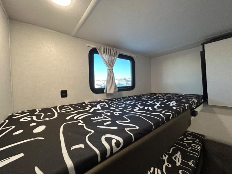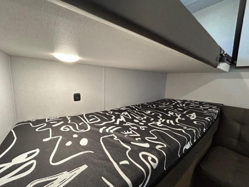 This versatile bunkhouse travel trailer is big enough for the whole family! The private bunkhouse has a 30" x 74" bunk bed and a 30" x 74"-fold-up bunk bed above a Jiffy sofa. Just outside the bunkhouse is a pantry big enough to store everyone's favorite snacks, and a full bathroom with a walk-in shower. The cooktop is just waiting for you to create a delicious meal, and the U-shaped dinette welcomes everyone to enjoy each meal in comfort, plus there is a large panoramic window for a perfect view of your surroundings. Any time of day you can kick back on the Versa-lounge and relax by the fireplace at the entertainment center. The exterior features a pass-through storage area for you to keep your outdoor camping gear stowed away when not in use and a 16' awning to protect you.