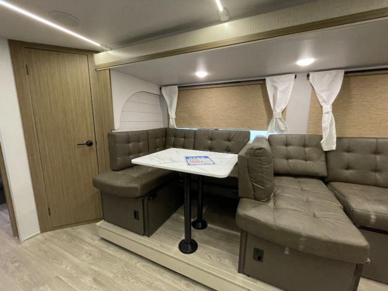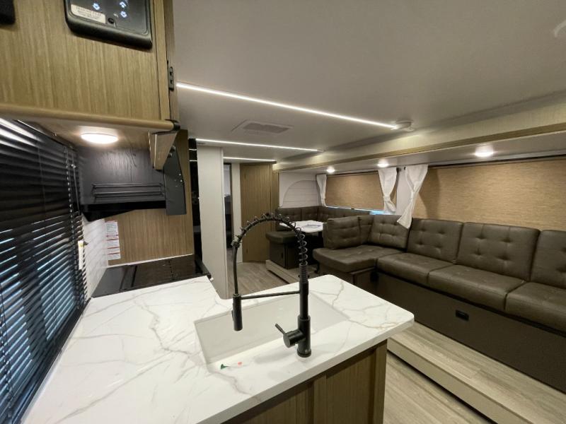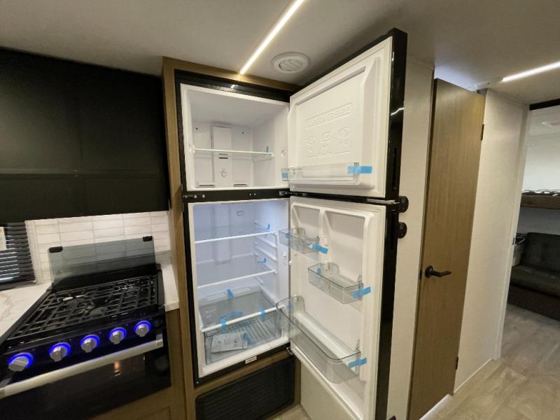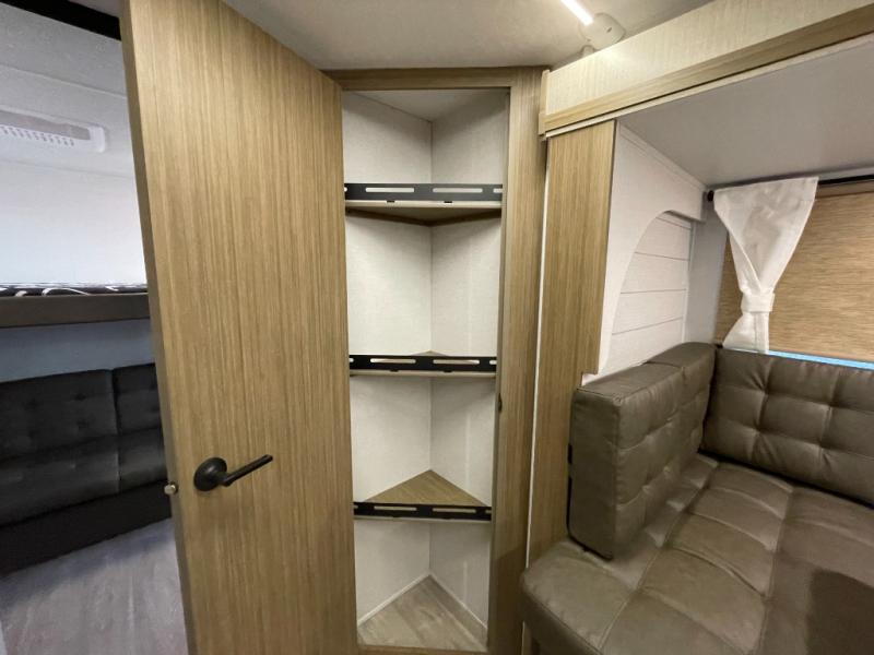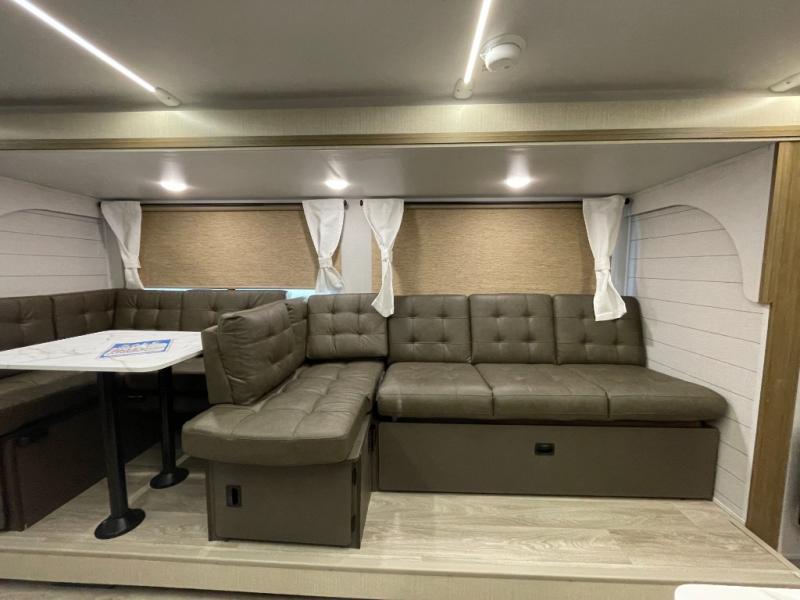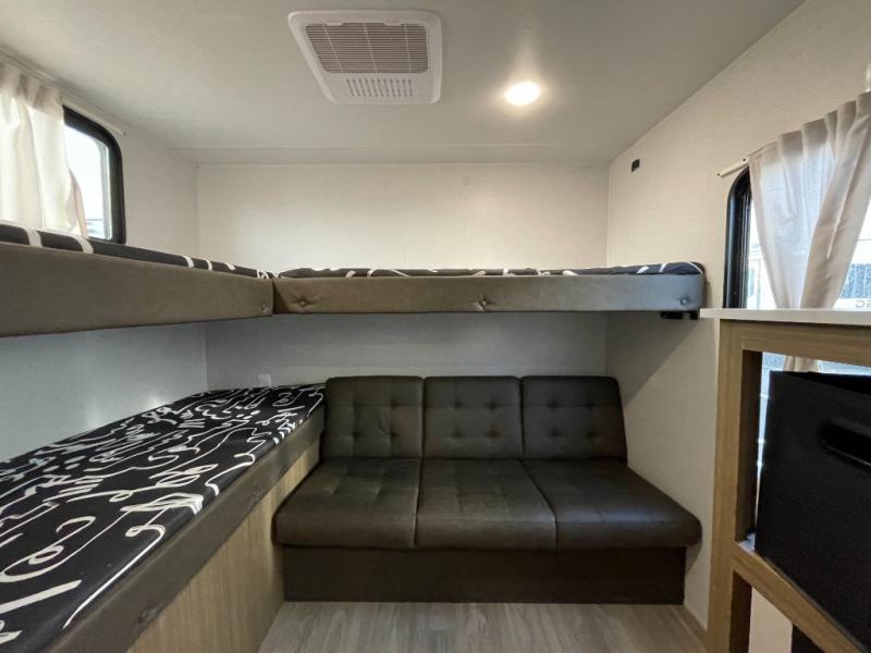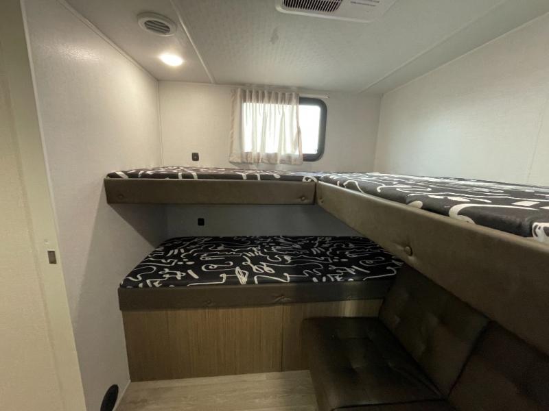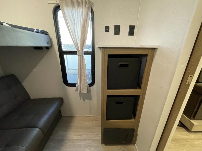 This versatile bunkhouse travel trailer is big enough for the whole family! The private bunkhouse has a 30" x 74" bunk bed and a 30" x 74"-fold-up bunk bed above a Jiffy sofa. Just outside the bunkhouse is a pantry big enough to store everyone's favorite snacks, and a full bathroom with a walk-in shower. The cooktop is just waiting for you to create a delicious meal, and the U-shaped dinette welcomes everyone to enjoy each meal in comfort, plus there is a large panoramic window for a perfect view of your surroundings. Any time of day you can kick back on the Versa-lounge and relax by the fireplace at the entertainment center. The exterior features a pass-through storage area for you to keep your outdoor camping gear stowed away when not in use and a 16' awning to protect you.