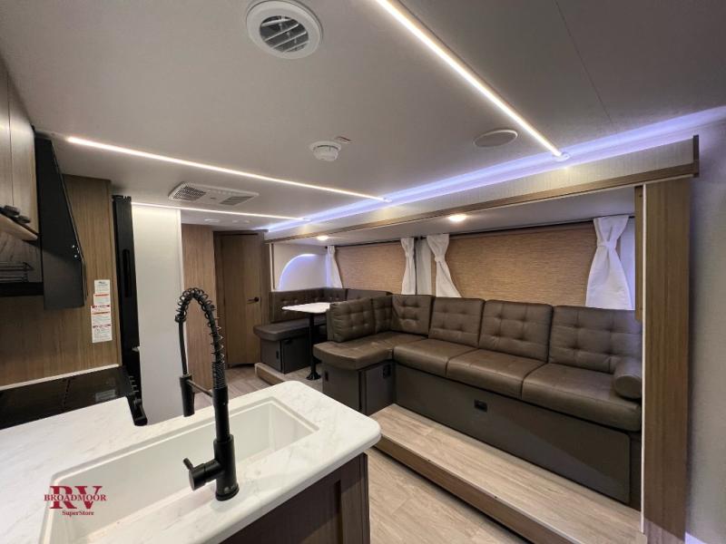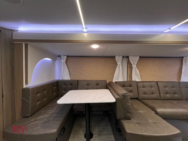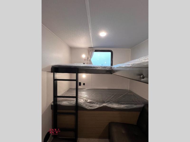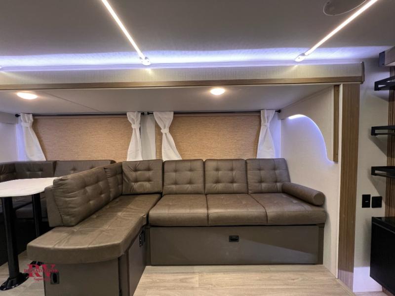 The kids can bring an extra guest or two with this travel trailer! It features a rear private bunkhouse with a set of bunk beds and a fold-up bunk above a Jiffy sofa. Just outside the bunkhouse is a pantry big enough to store your canned goods and a full bathroom to rinse off your fun-filled day. The kitchen is just waiting for you to create a delicious home cooked meal with a cooktop and a 12V refrigerator to store any leftovers in after eating at the Versa U-dinette. There is a pass-through storage area to hold all of your outdoor camping gear, a 16' awning to protect you, and an exterior camp kitchen for a sunrise breakfast!