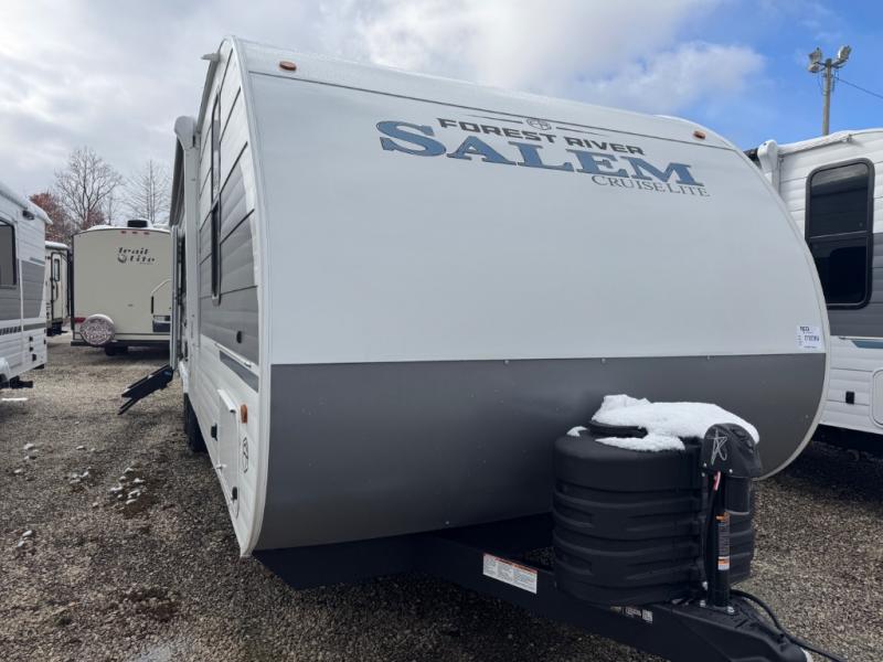 The Salem Cruise Lite travel trailers are packed with hassle-free camping amenities! There are a variety of floorplans to choose from so you can find the best one to fit your needs. The enclosed Accessibelly will help protect against the elements and debris during transport, and the exterior retro/metal redesign is sure to be eye-catching! There are stylish roller shades inside, along with updated backsplash, elegant curtain rods and curtains, plus many more interior comforts! Choose a Salem Cruise Lite travel trailer today for quality and value!