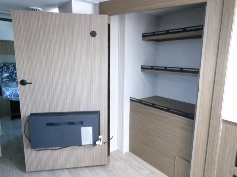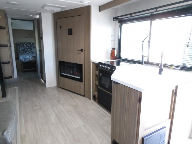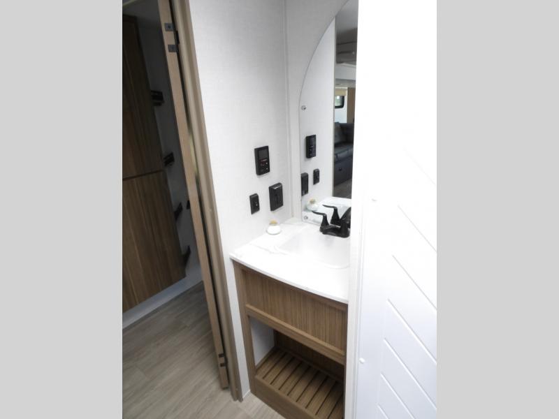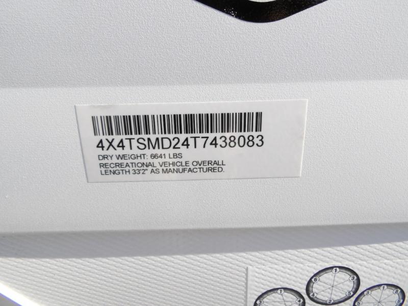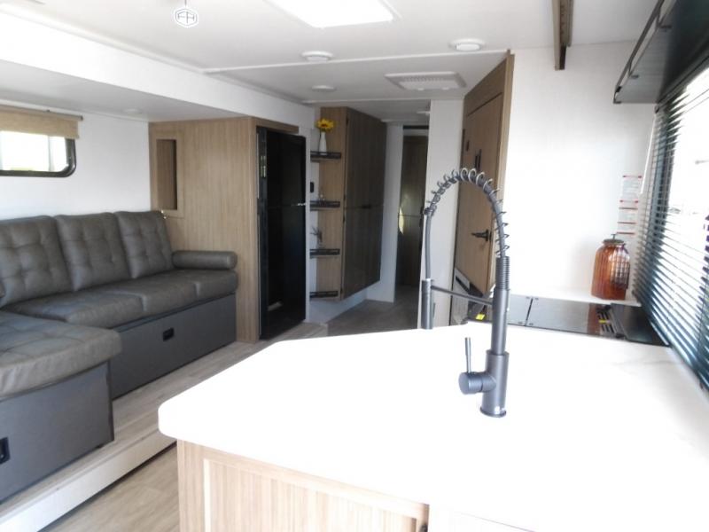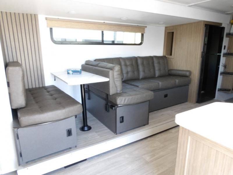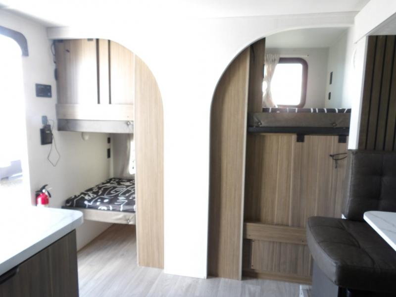Your guests or older kids will love camping in this spacious travel trailer thanks to the rear bunk beds, each with their own private door! The front bedroom includes a Versa-Tilt custom king bed, a closet and overhead shelf for storage, and any other guests can sleep on the booth dinette and Versa-Lounge within the large slide out. The combined kitchen and living area also includes all the appliances to make meals each day, a booth dinette, and an entertainment center with a fireplace and hidden pantry. And don't overlook the full bath with a walk-in shower to easily clean up each day!