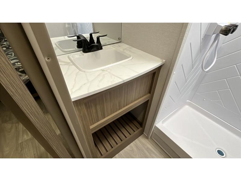 Your guests or older kids will love camping in this spacious travel trailer thanks to the rear bunk beds, each with their own private door! The front bedroom includes a Versa-Tilt custom king bed, a closet and overhead shelf for storage, and any other guests can sleep on the booth dinette and Versa-Lounge within the large slide out. The combined kitchen and living area also includes all the appliances to make meals each day, a booth dinette, and an entertainment center with a fireplace and hidden pantry. And don't overlook the full bath with a walk-in shower to easily clean up each day!