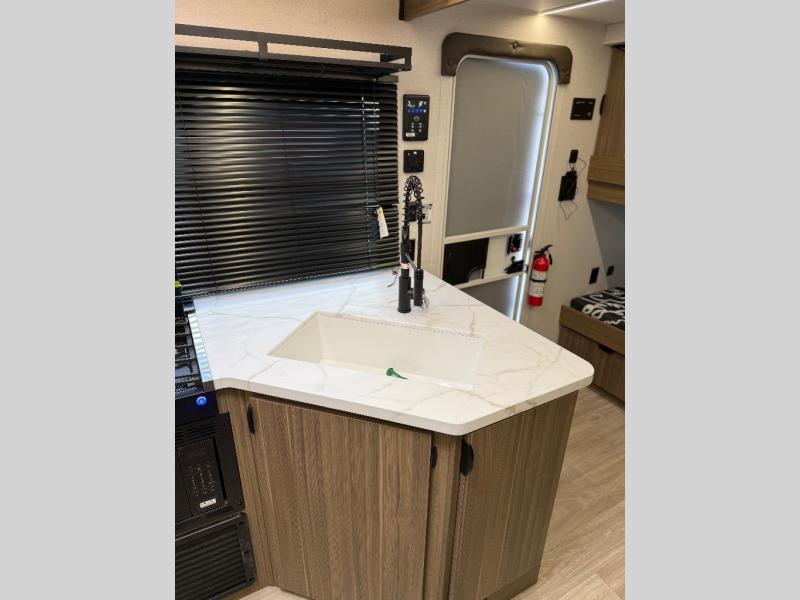 Your guests or older kids will love camping in this spacious travel trailer thanks to the rear bunk beds, each with their own private door! The front bedroom includes a Versa-Tilt custom king bed, a closet and overhead shelf for storage, and any other guests can sleep on the booth dinette and Versa-Lounge within the large slide out. The combined kitchen and living area also includes all the appliances to make meals each day, a booth dinette, and an entertainment center with a fireplace and hidden pantry. And don't overlook the full bath with a walk-in shower to easily clean up each day!