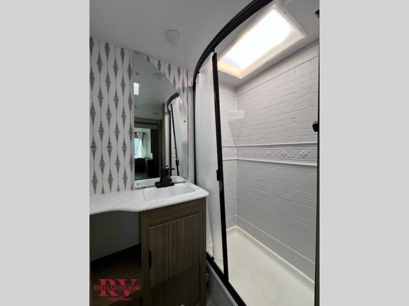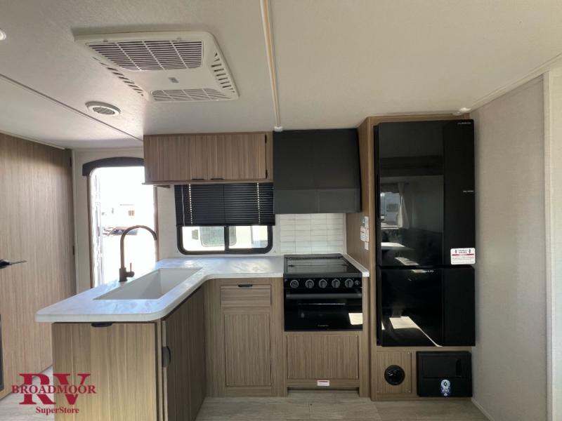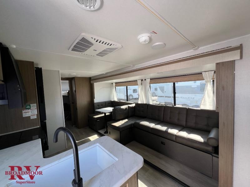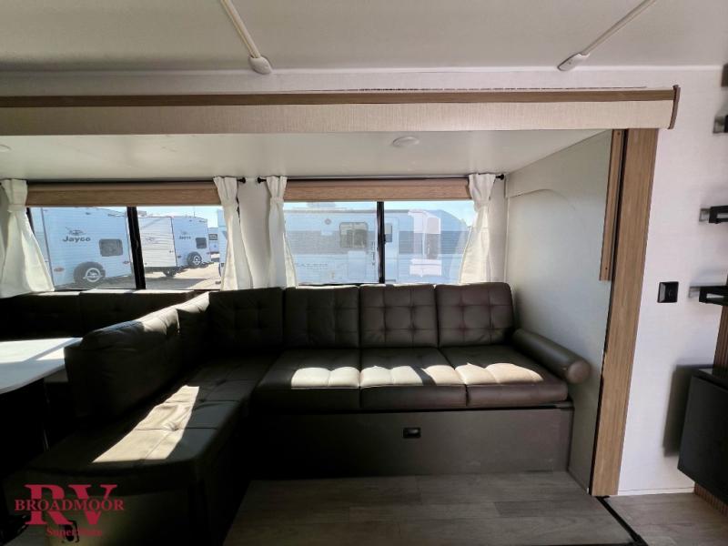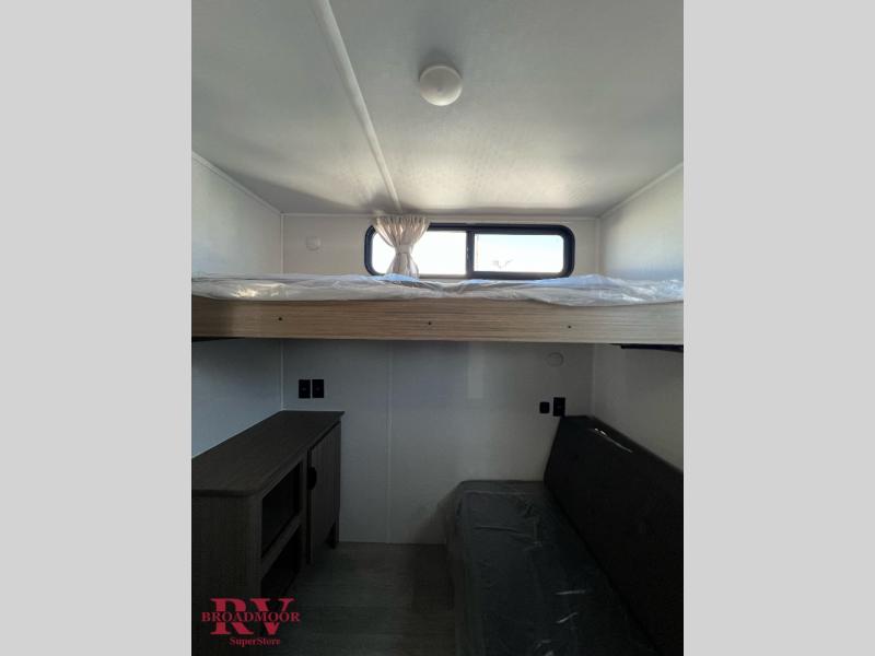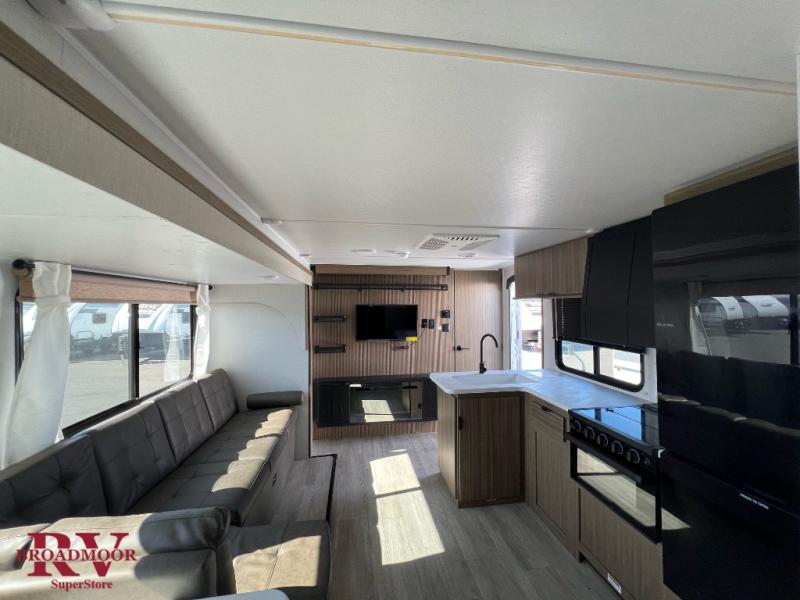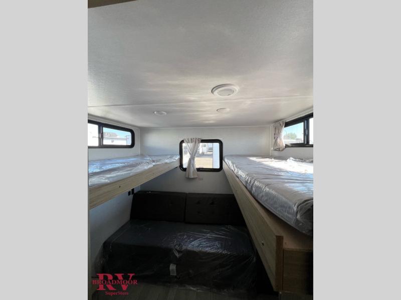 This travel trailer offers a large amount of versatility! The rear private bunkhouse has two 30" x 74" bunks and a sofa bed below that can transform into a bed so more can join in on the camping fun. Start each morning feeling clean and fresh after showering in the full bathroom then head to the front private bedroom to change. The kitchen has a 12V refrigerator to keep your eggs fresh, a cooktop to fry them up, and a U-shaped dinette to enjoy them at. What better way to wind down your nights than by relaxing on the Versa Lounge or playing a game around the U-shaped dinette!