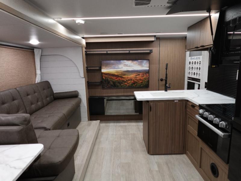 The Salem Cruise Lite travel trailers and toy haulers are value-minded units packed with great camping features! There are a variety of floorplans to choose from between two different regions. The enclosed Accessibelly will help protect against the elements and debris during transport, and the exterior retro/metal redesign is sure to be eye-catching! There are stylish roller shades inside, along with updated backsplash, elegant curtain rods and curtains, plus many more interior comforts! Choose a Salem Cruise Lite today for quality and value!