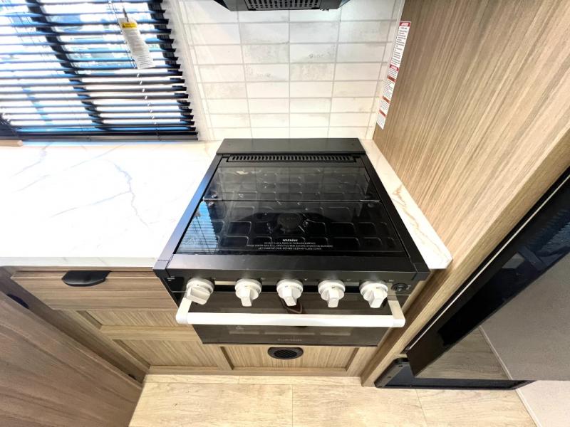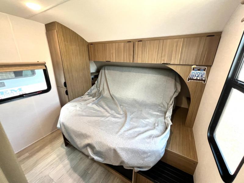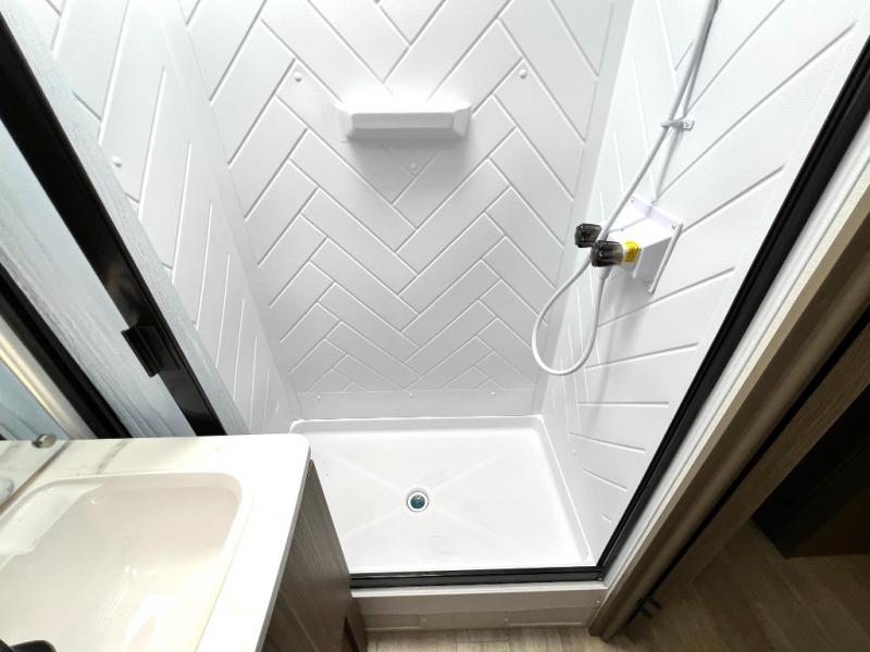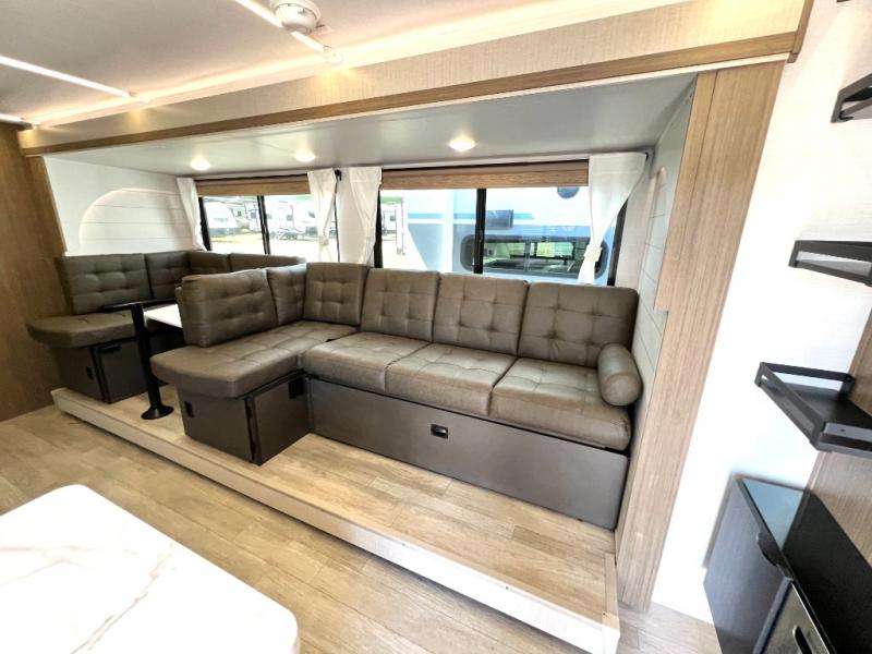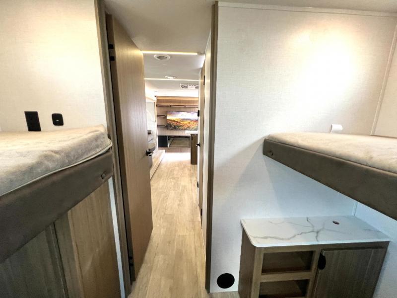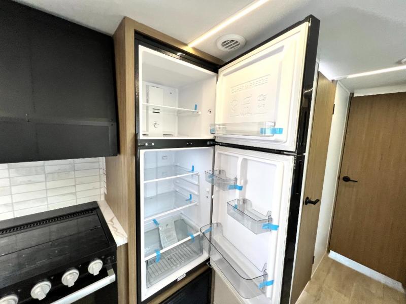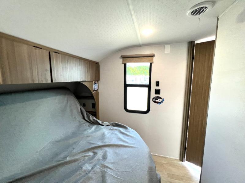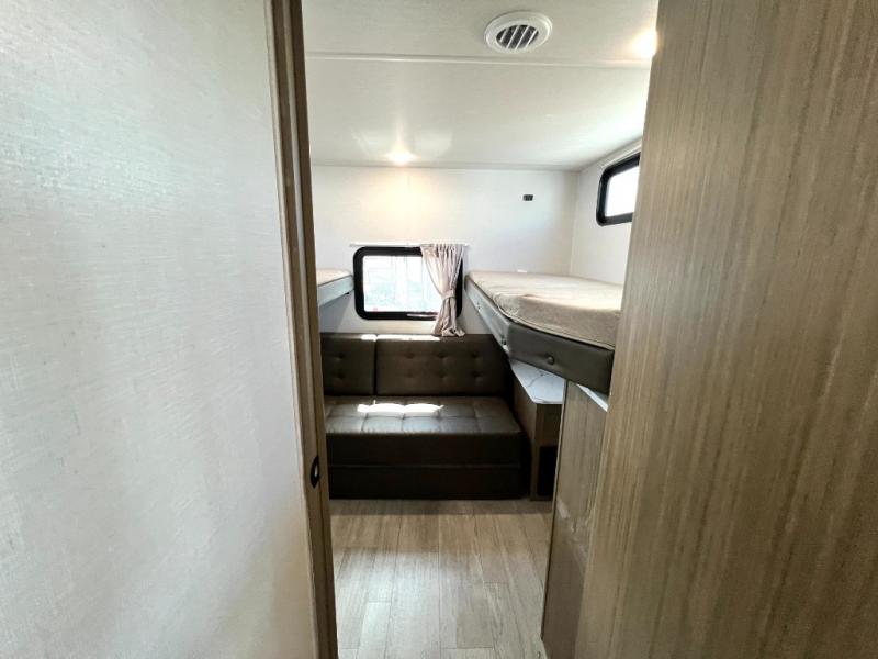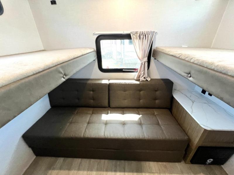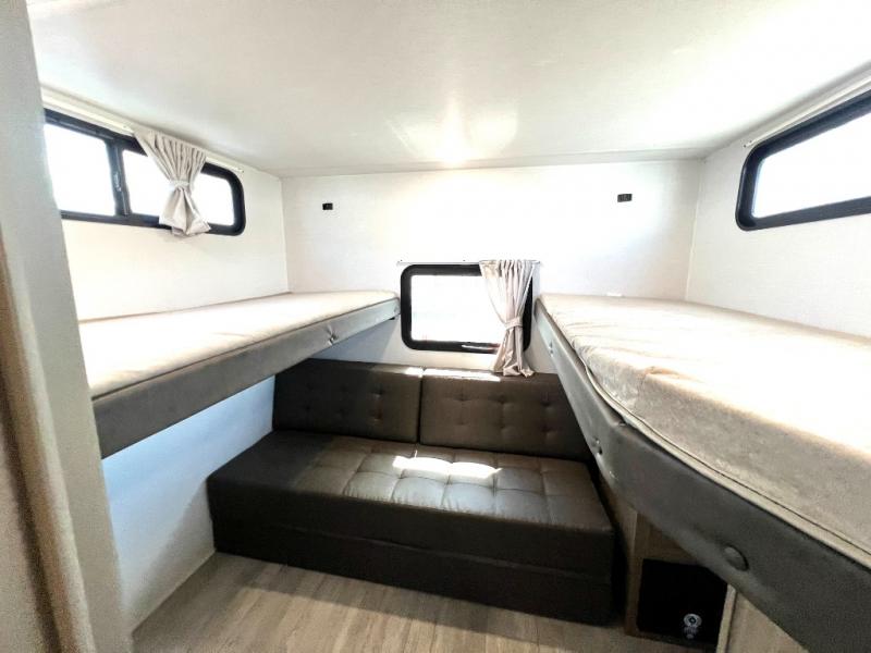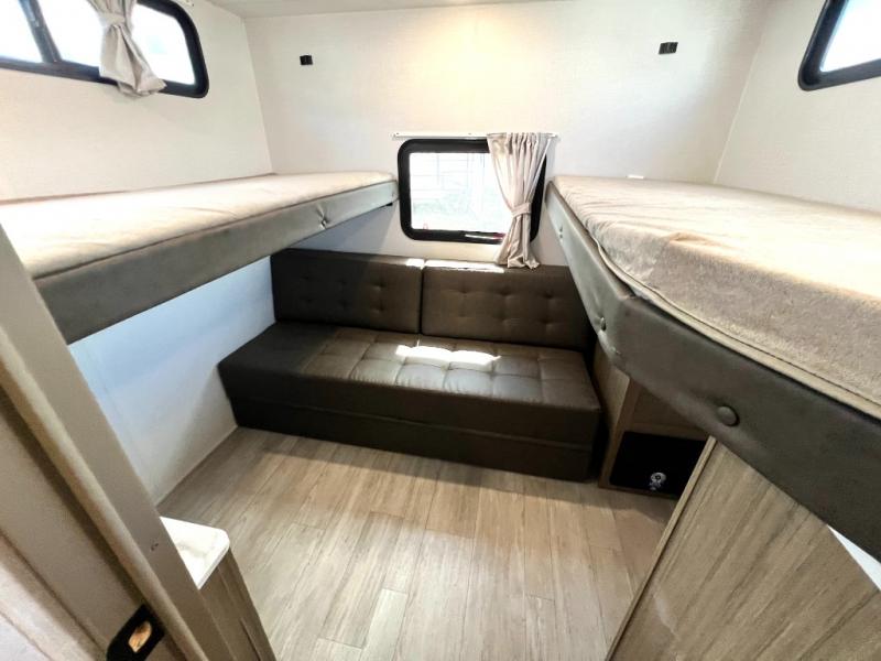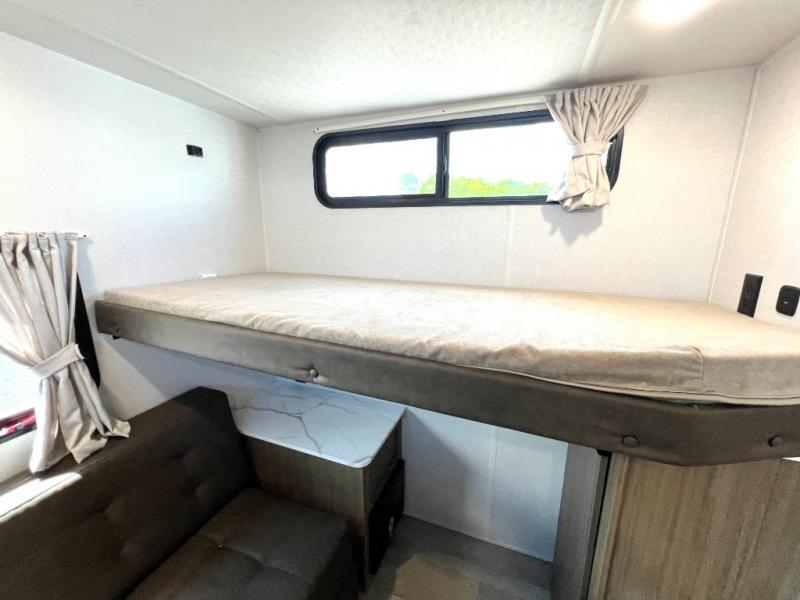 This travel trailer is new to the lineup and offers a large amount of versatility! The rear private bunkhouse has two 30" x 74" Versa-bunks and a Versa-queen bed so that more can join in on the camping fun. Start each morning feeling clean and fresh after showering in the walk-in shower with fiberglass surround then head to the front private bedroom to change. The kitchen has an oversized refrigerator to keep your perishables fresh, a cooktop for meals, and a U-shaped dinette for dining, game time, or just hanging out.