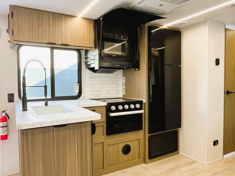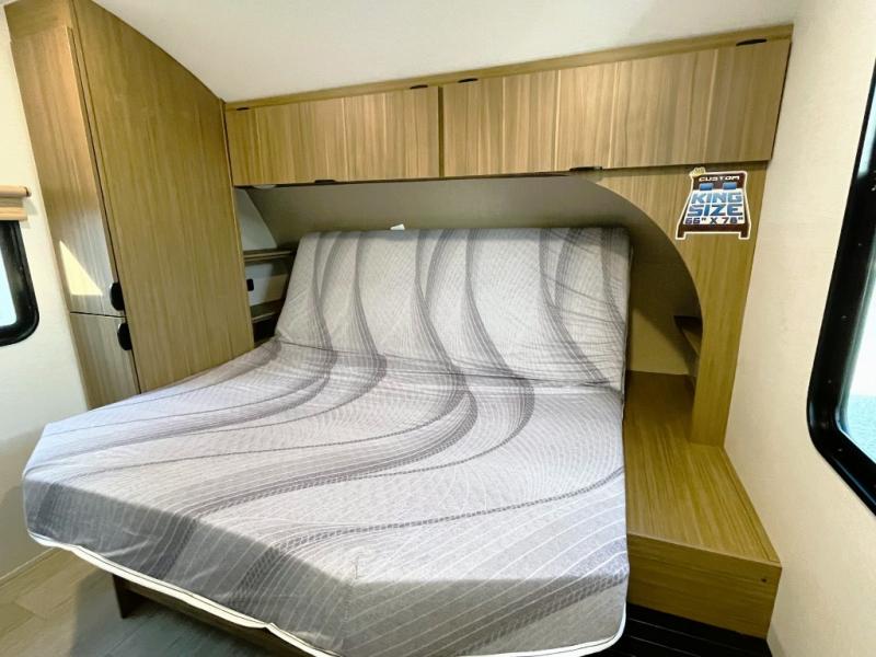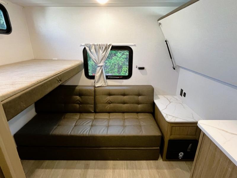This travel trailer is new to the lineup and offers a large amount of versatility! The rear private bunkhouse has two 30" x 74" Versa-bunks and a Versa-queen bed so that more can join in on the camping fun. Start each morning feeling clean and fresh after showering in the walk-in shower with fiberglass surround then head to the front private bedroom to change. The kitchen has an oversized refrigerator to keep your perishables fresh, a cooktop for meals, and a U-shaped dinette for dining, game time, or just hanging out.