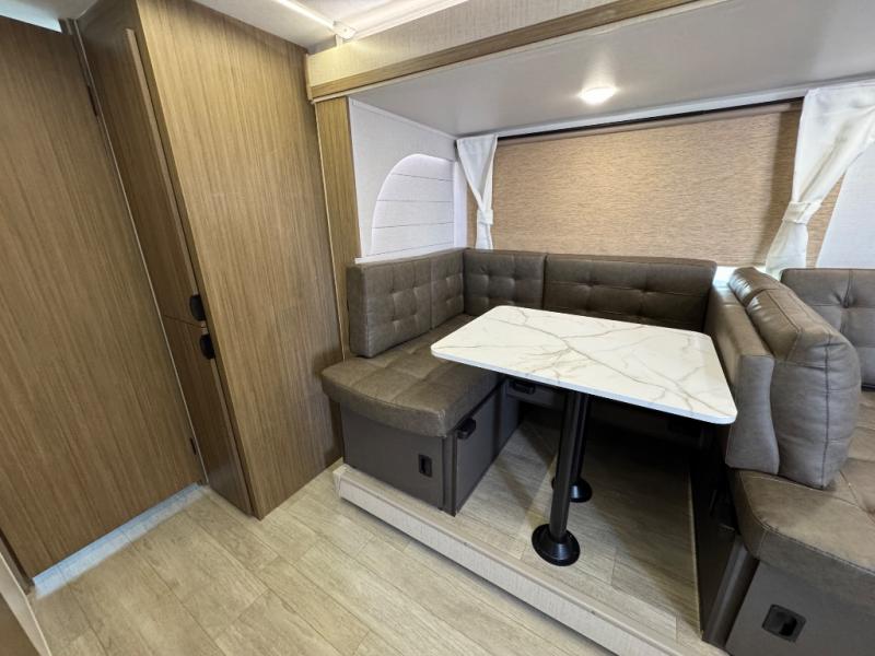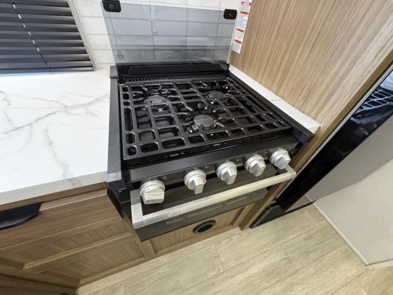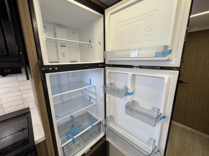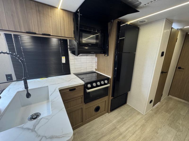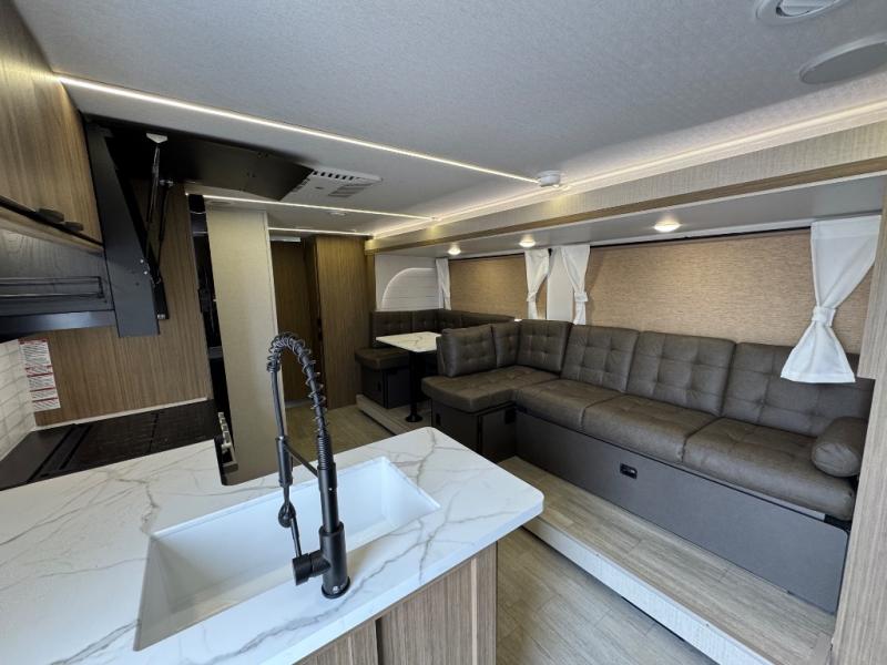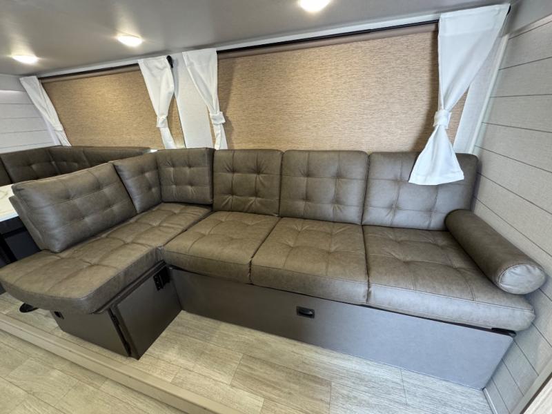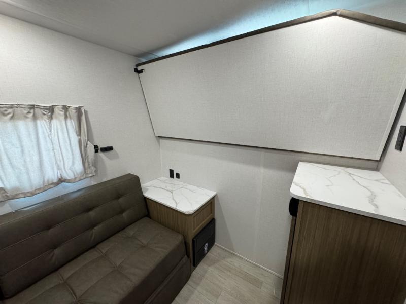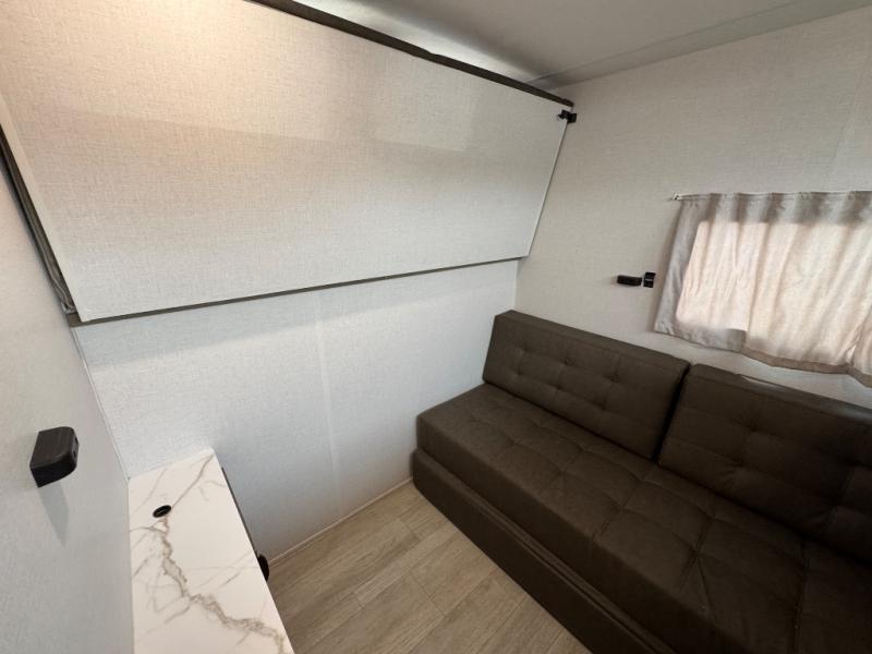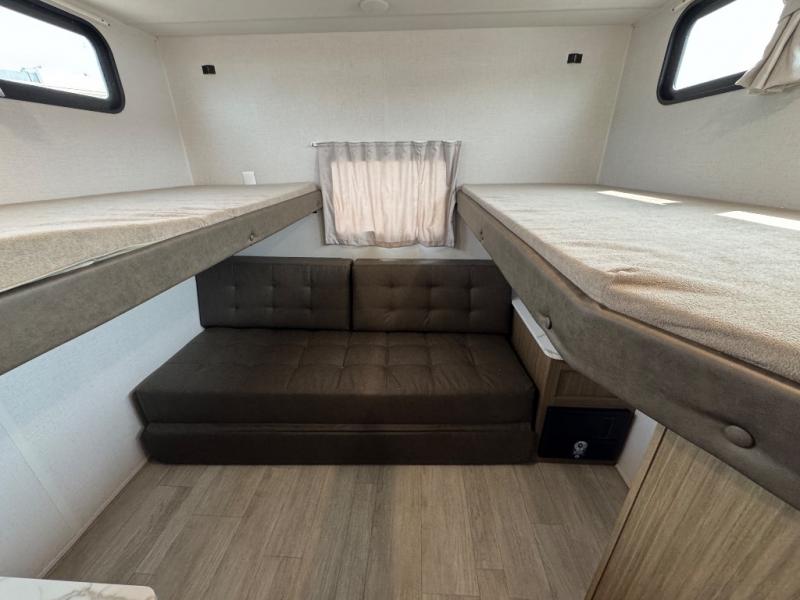 This travel trailer is new to the lineup and offers a large amount of versatility! The rear private bunkhouse has two 30" x 74" Versa-bunks and a Versa-queen bed so that more can join in on the camping fun. Start each morning feeling clean and fresh after showering in the walk-in shower with fiberglass surround then head to the front private bedroom to change. The kitchen has an oversized refrigerator to keep your perishables fresh, a cooktop for meals, and a U-shaped dinette for dining, game time, or just hanging out.