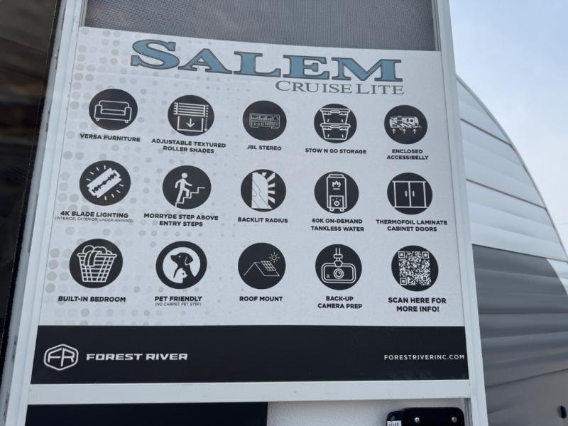 The Salem Cruise Lite travel trailers and toy haulers are value-minded units packed with great camping features! There are a variety of floorplans to choose from between two different regions. The enclosed Accessibelly will help protect against the elements and debris during transport, and the exterior retro/metal redesign is sure to be eye-catching! There are stylish roller shades inside, along with updated backsplash, elegant curtain rods and curtains, plus many more interior comforts! Choose a Salem Cruise Lite today for quality and value!