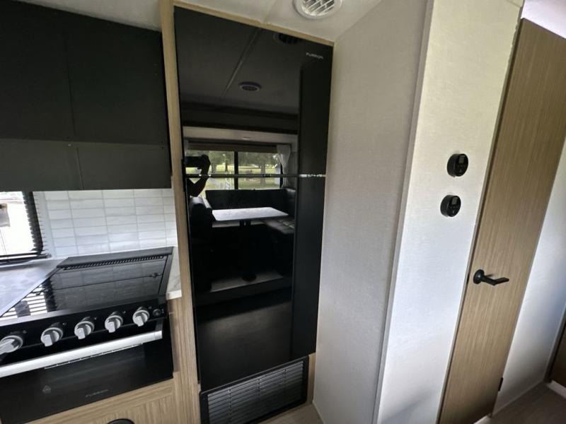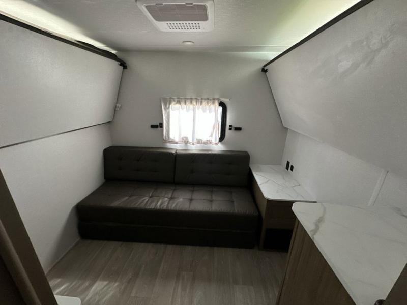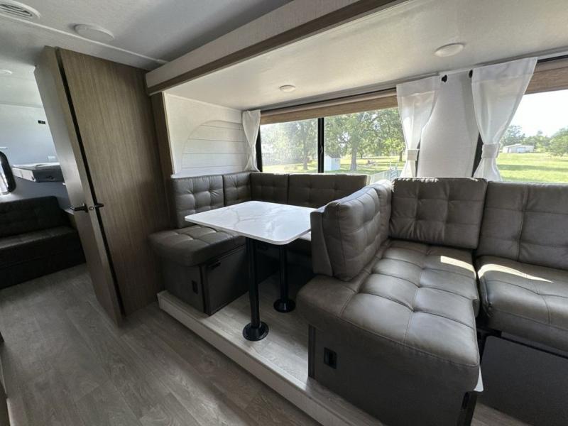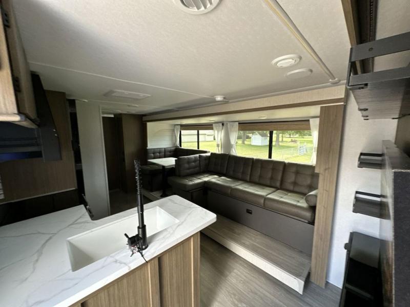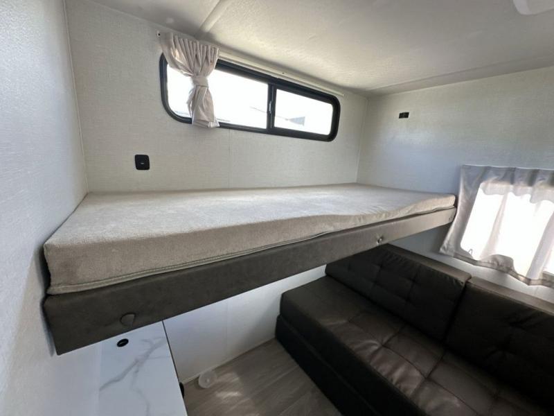 This travel trailer is new to the lineup and offers a large amount of versatility! The rear private bunkhouse has two 30" x 74" Versa-bunks and a Versa-queen bed so that more can join in on the camping fun. Start each morning feeling clean and fresh after showering in the walk-in shower with fiberglass surround then head to the front private bedroom to change. The kitchen has an oversized refrigerator to keep your perishables fresh, a cooktop for meals, and a U-shaped dinette for dining, game time, or just hanging out.