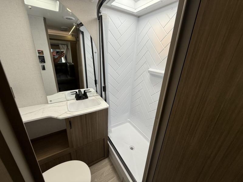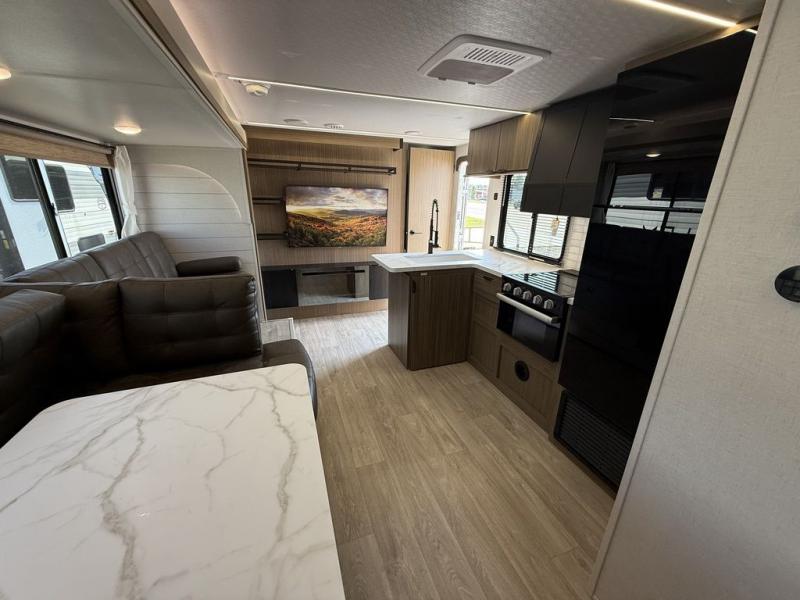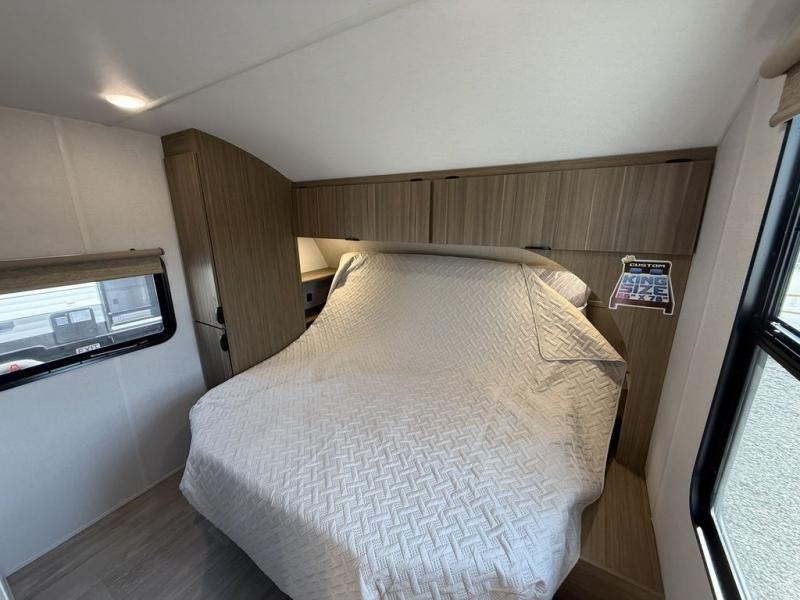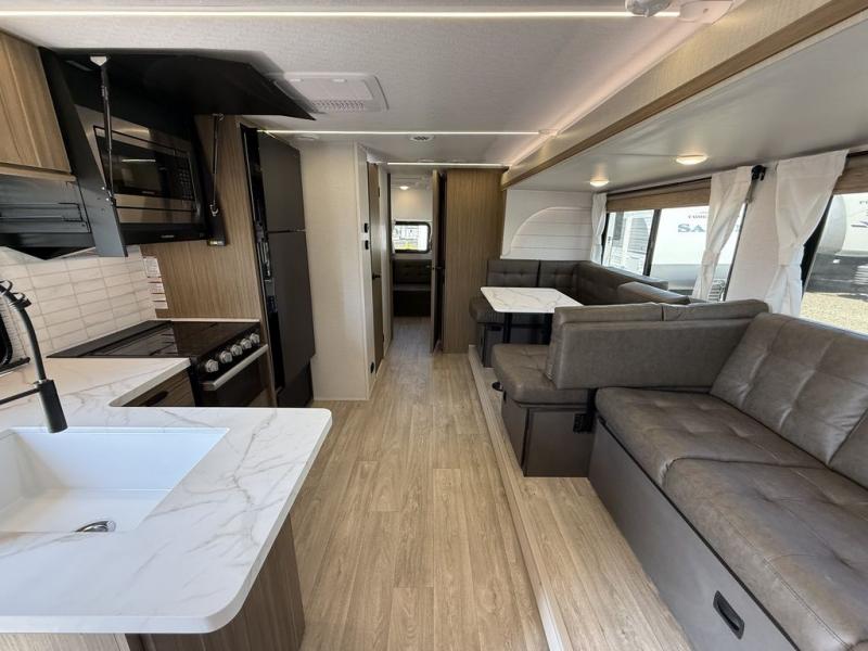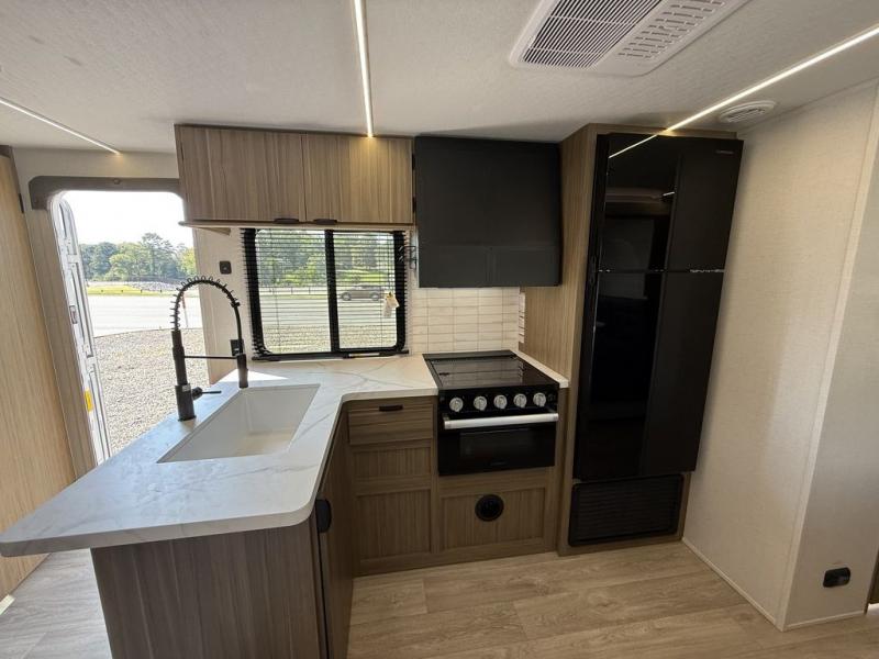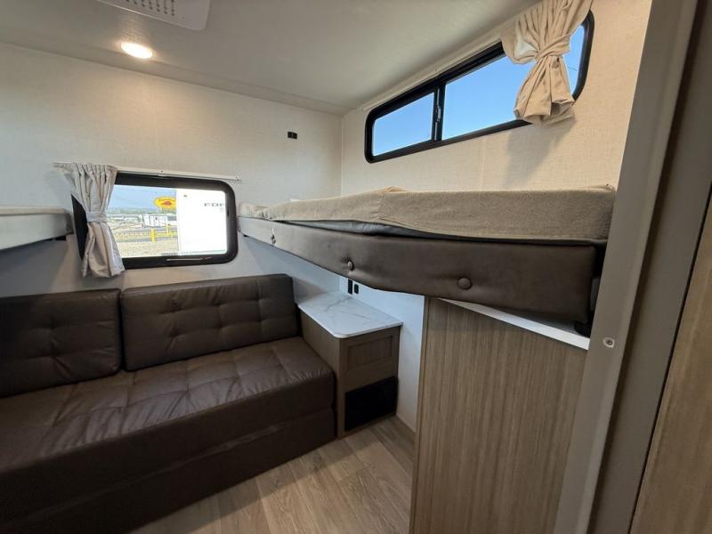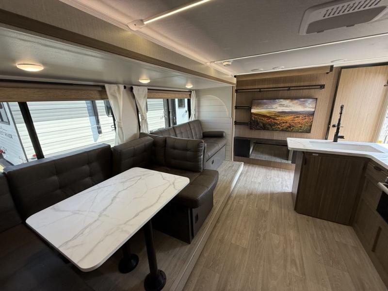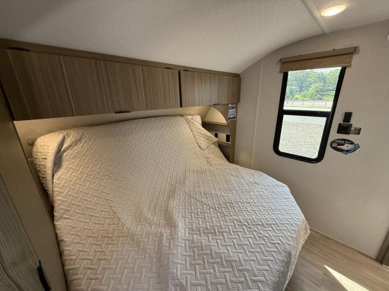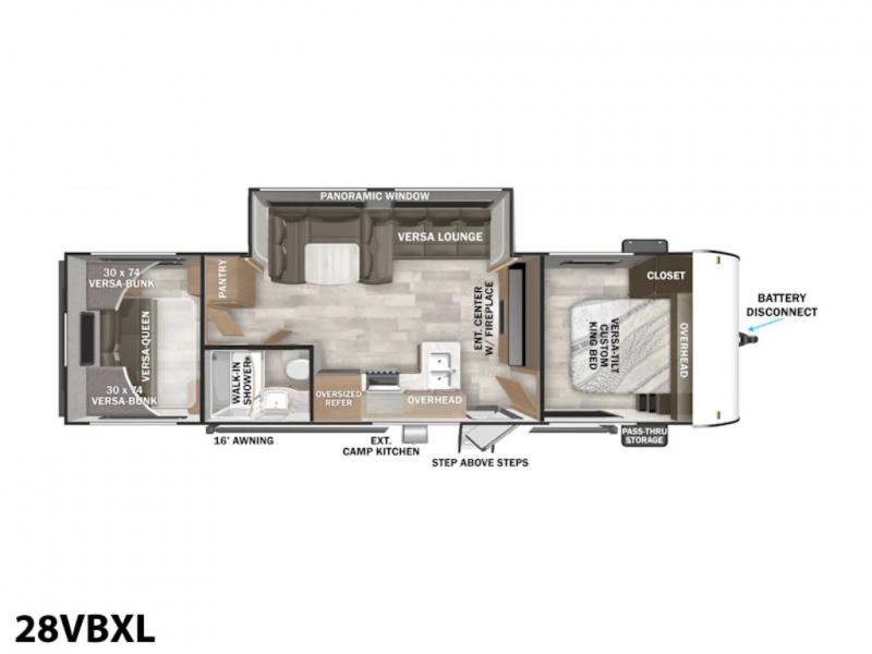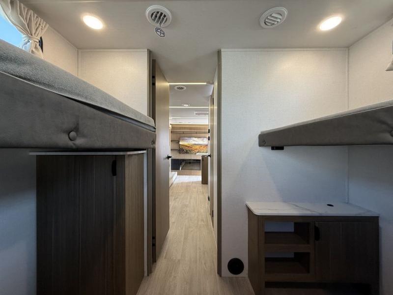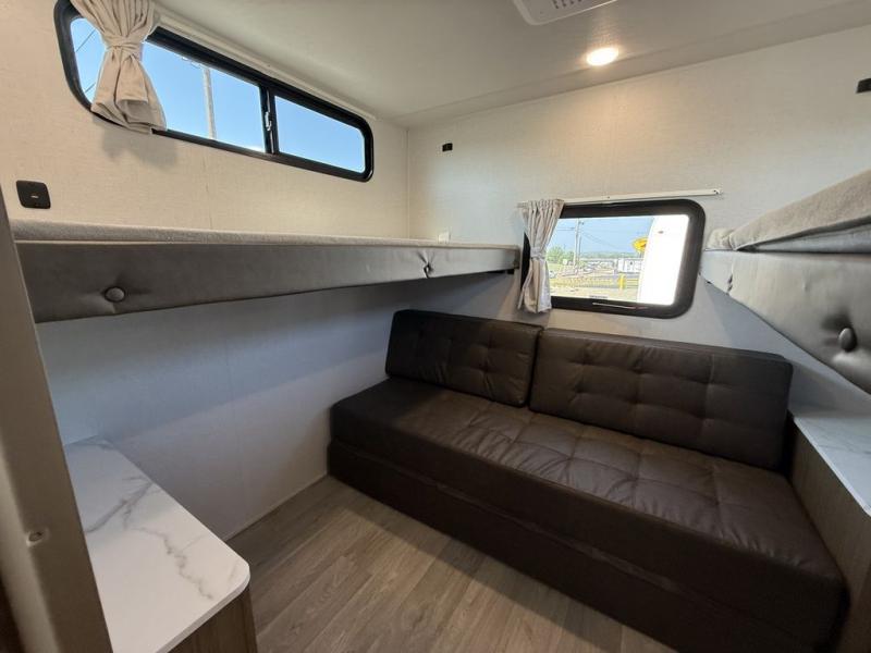 This travel trailer is new to the lineup and offers a large amount of versatility! The rear private bunkhouse has two 30" x 74" Versa-bunks and a Versa-queen bed so that more can join in on the camping fun. Start each morning feeling clean and fresh after showering in the walk-in shower with fiberglass surround then head to the front private bedroom to change. The kitchen has an oversized refrigerator to keep your perishables fresh, a cooktop for meals, and a U-shaped dinette for dining, game time, or just hanging out.