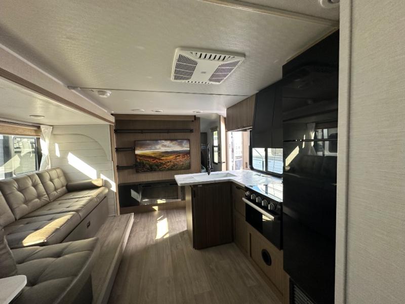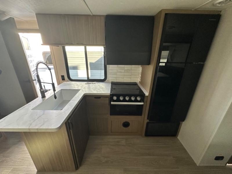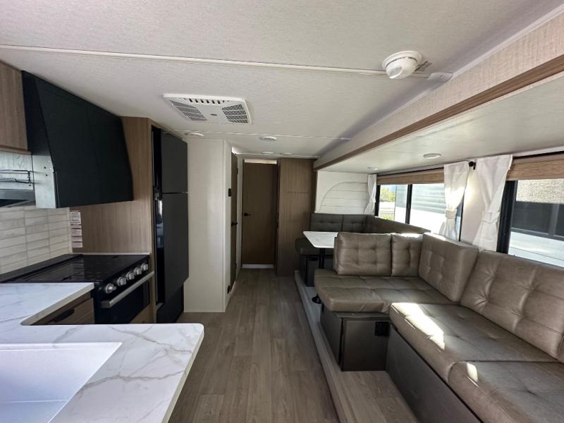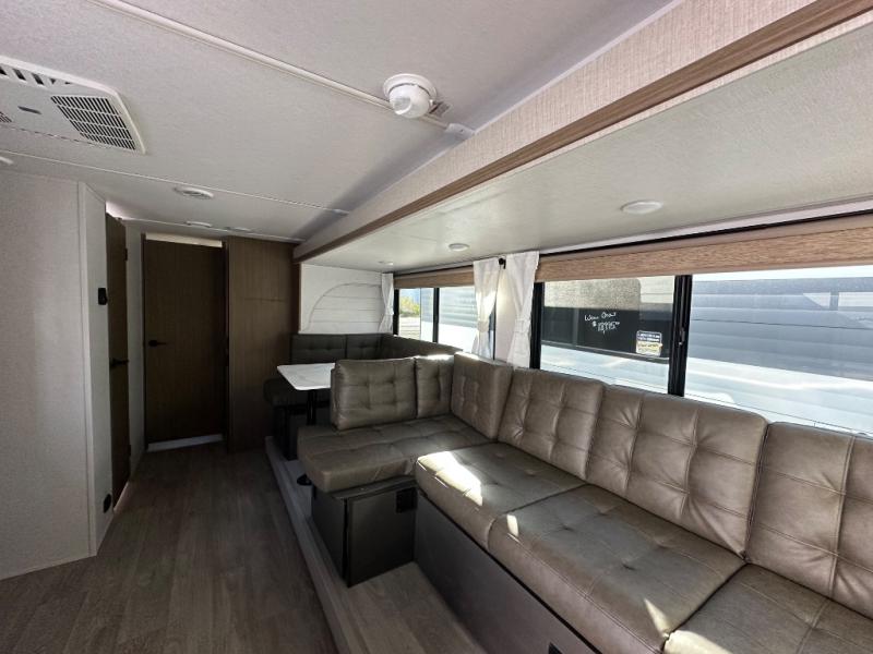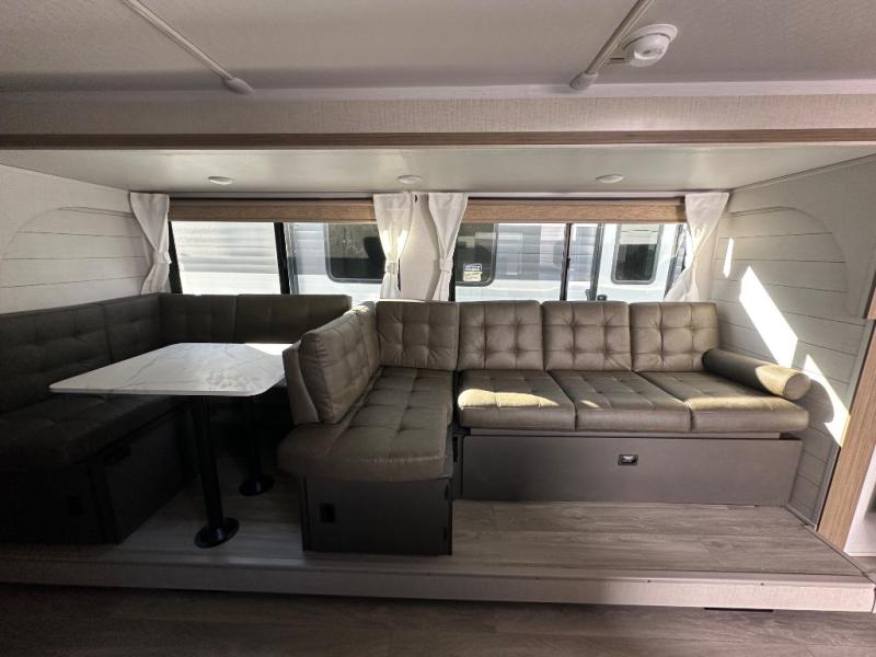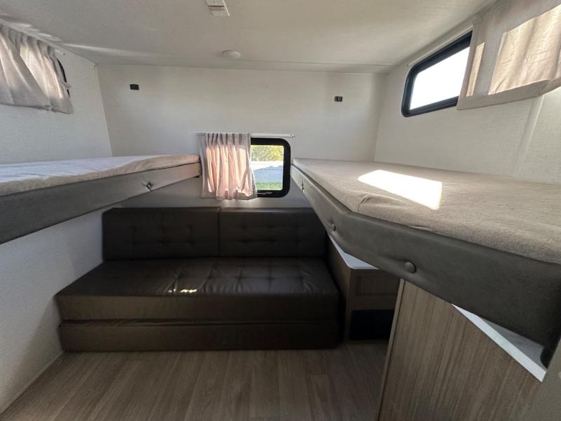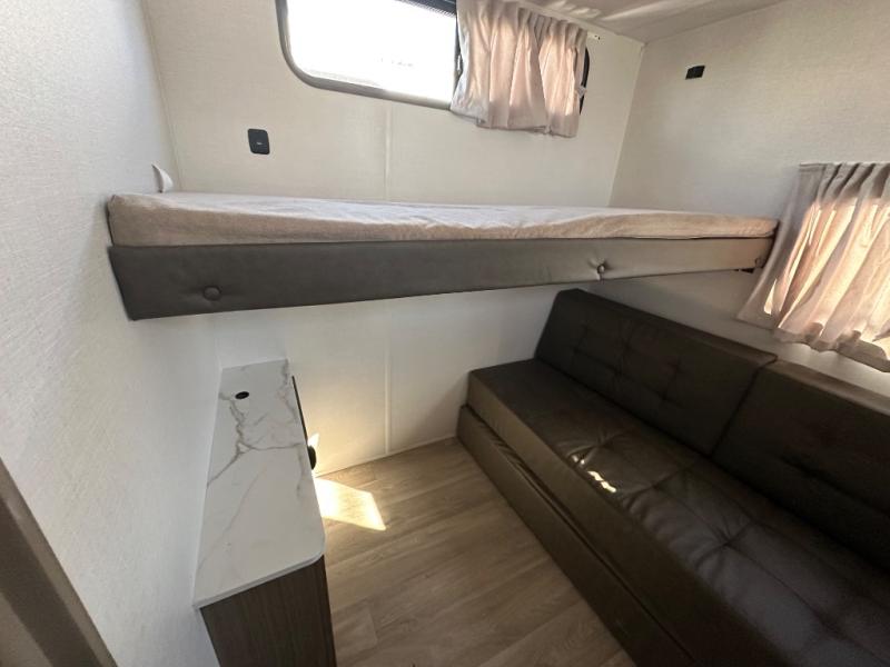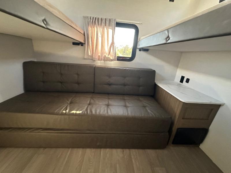 This travel trailer is new to the lineup and offers a large amount of versatility! The rear private bunkhouse has two 30" x 74" Versa-bunks and a Versa-queen bed so that more can join in on the camping fun. Start each morning feeling clean and fresh after showering in the walk-in shower with fiberglass surround then head to the front private bedroom to change. The kitchen has an oversized refrigerator to keep your perishables fresh, a cooktop for meals, and a U-shaped dinette for dining, game time, or just hanging out.