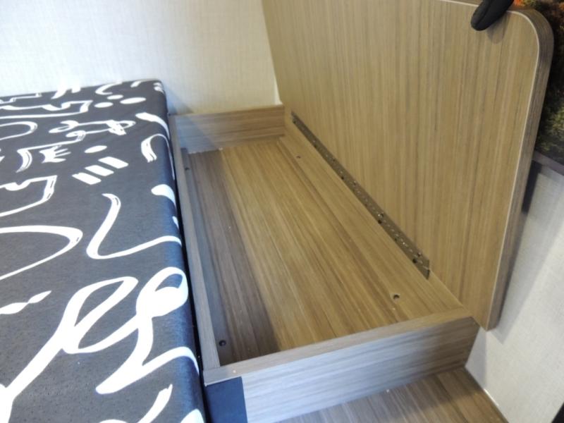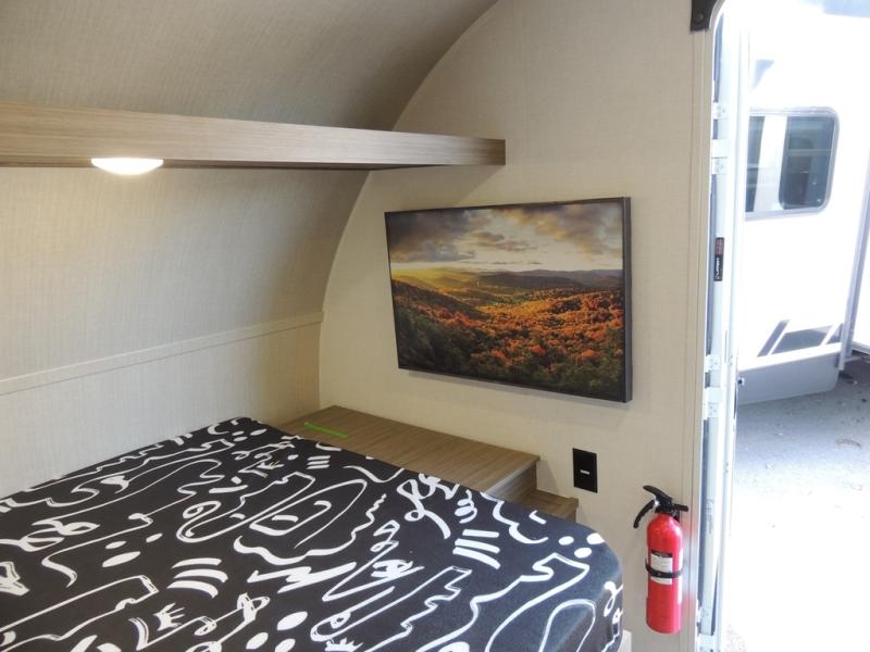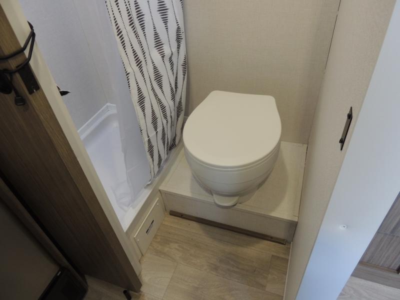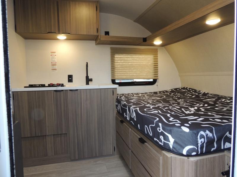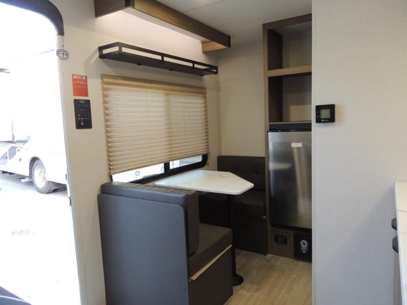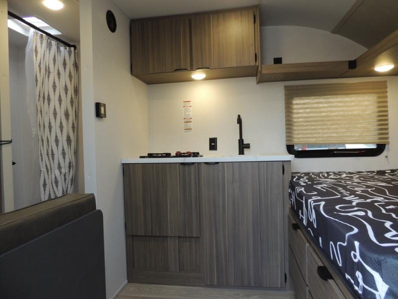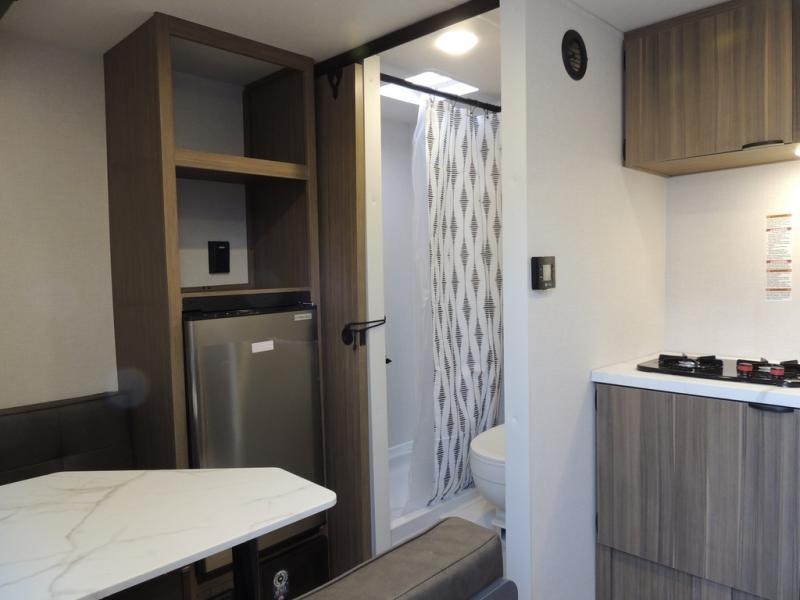 This lightweight travel trailer has everything you need to enjoy camping trips! There is a front east to west custom king bed with storage at the foot of the bed and overhead for your valuables. A private bath includes a toilet and walk-in shower so you can easily get ready each day, and you can prepare your meals on the two-burner cooktop when you get hungry. The booth dinette will provide dining space, along with sleeping space for one to two little ones. Don't let this trailer get away!
