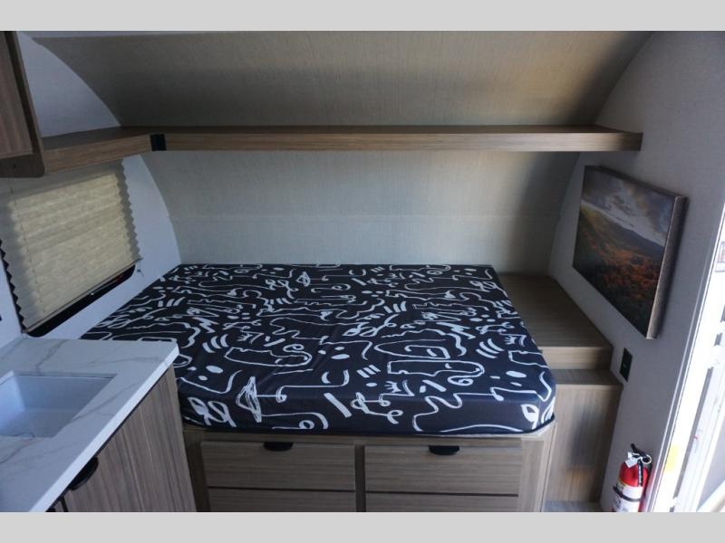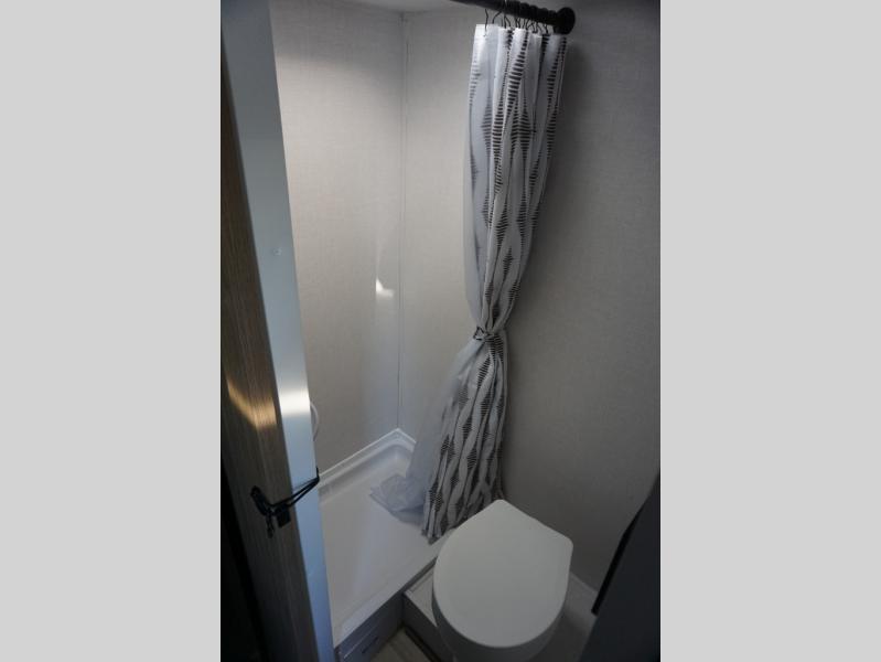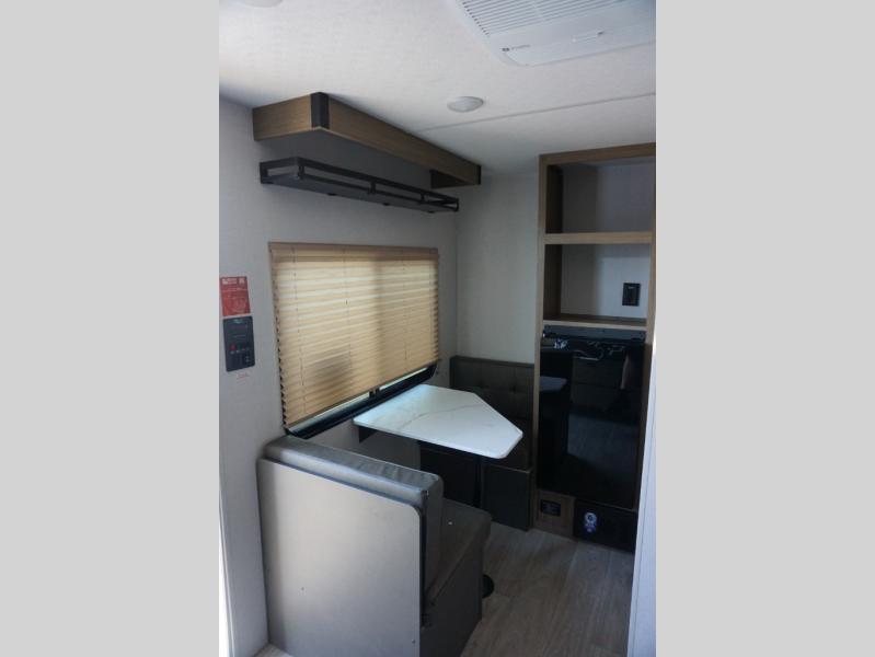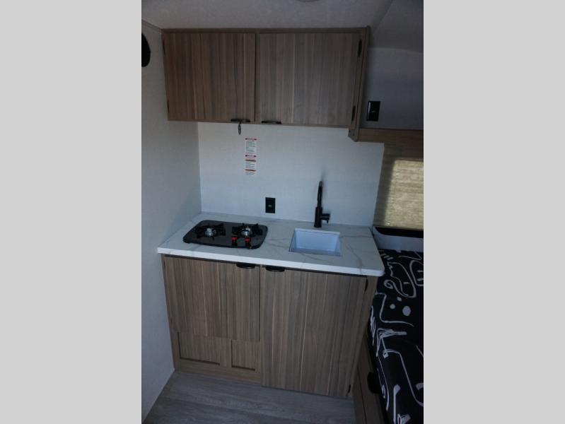 This lightweight travel trailer has everything you need to enjoy camping trips! There is a front east to west custom king bed with storage at the foot of the bed and overhead for your valuables. A private bath includes a toilet and walk-in shower so you can easily get ready each day, and you can prepare your meals on the two-burner cooktop when you get hungry. The booth dinette will provide dining space, along with sleeping space for one to two little ones. Don't let this trailer get away!