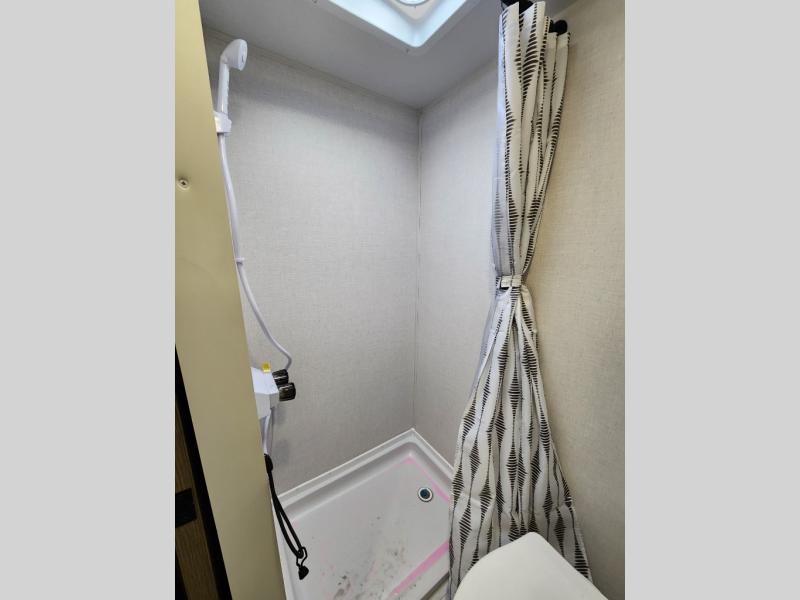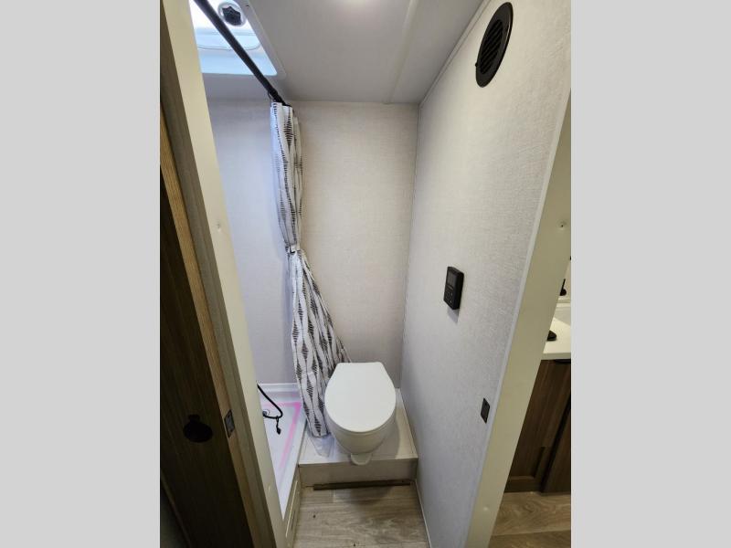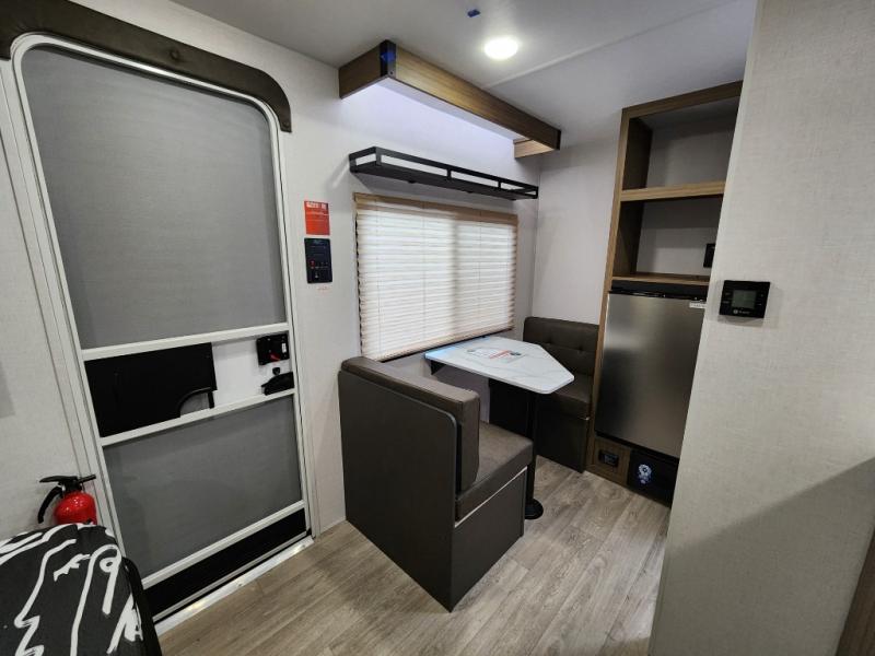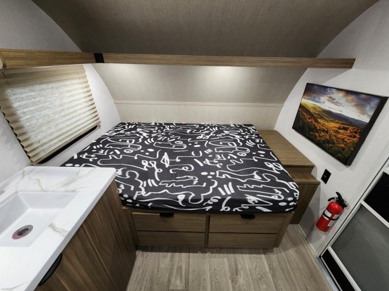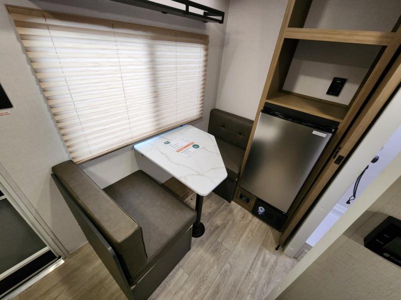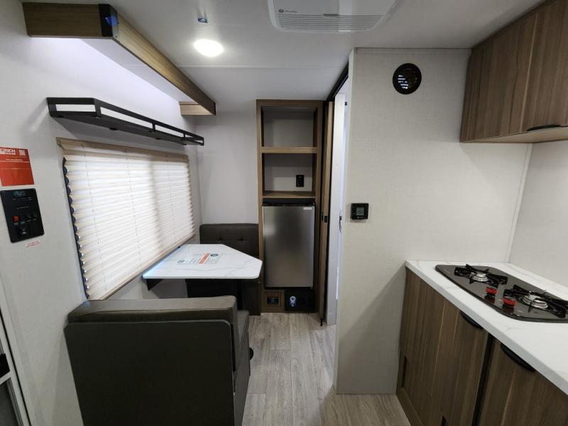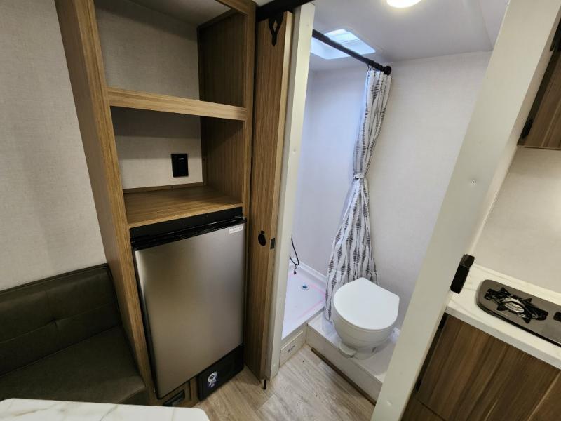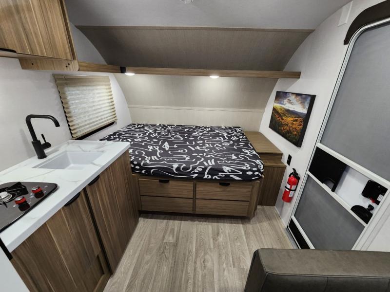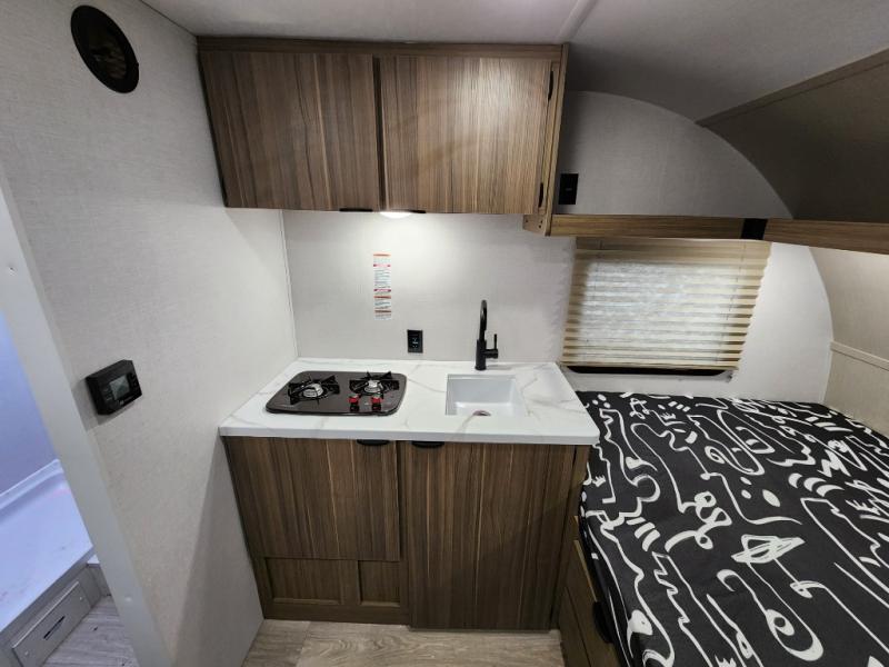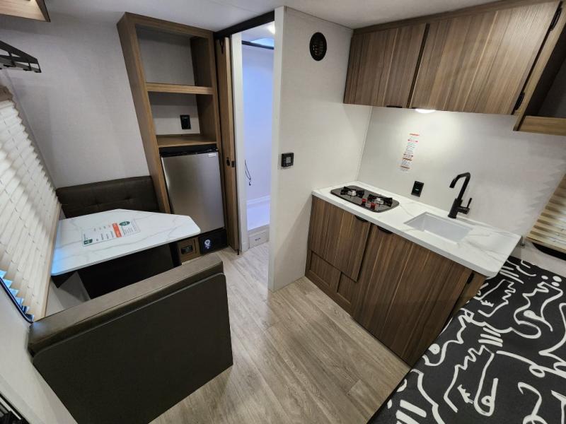 This lightweight travel trailer has everything you need to enjoy camping trips! There is a front east to west custom king bed with storage at the foot of the bed and overhead for your valuables. A private bath includes a toilet and walk-in shower so you can easily get ready each day, and you can prepare your meals on the two-burner cooktop when you get hungry. The booth dinette will provide dining space, along with sleeping space for one to two little ones. Don't let this trailer get away!