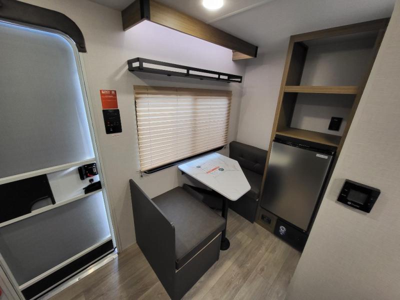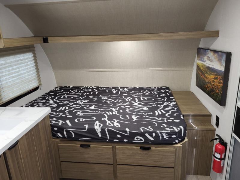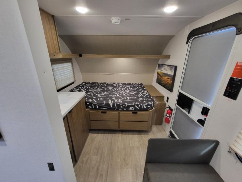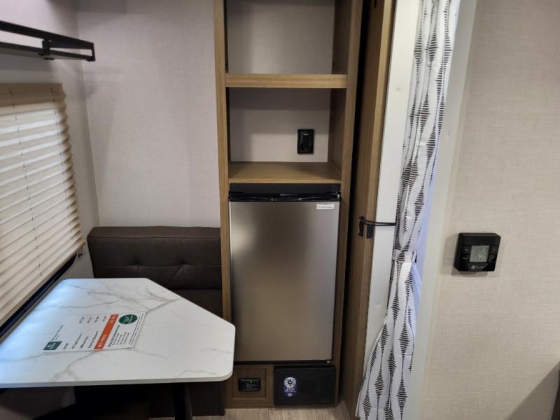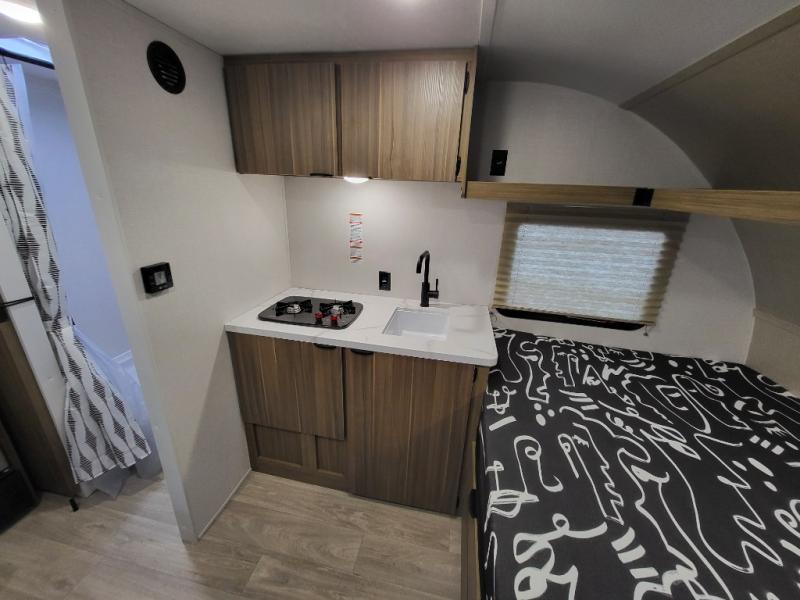This lightweight travel trailer has everything you need to enjoy camping trips! There is a front east to west custom king bed with storage at the foot of the bed and overhead for your valuables. A private bath includes a toilet and walk-in shower so you can easily get ready each day, and you can prepare your meals on the two-burner cooktop when you get hungry. The booth dinette will provide dining space, along with sleeping space for one to two little ones. Don't let this trailer get away!