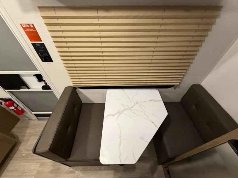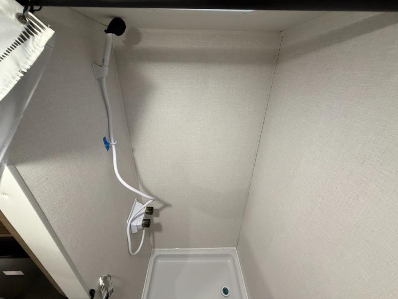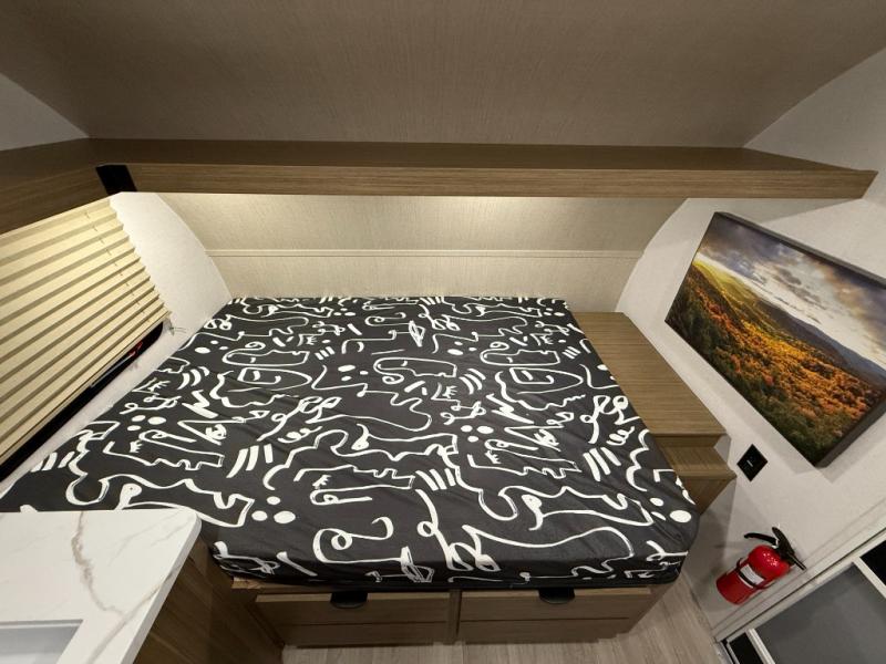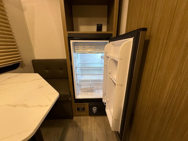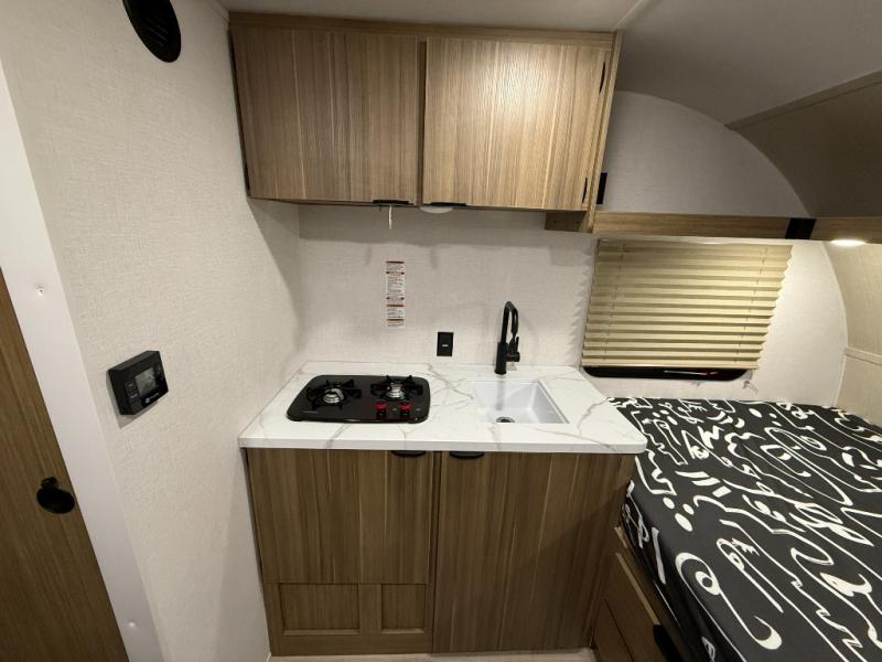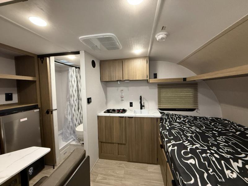 This lightweight travel trailer has everything you need to enjoy camping trips! There is a front east to west custom king bed with storage at the foot of the bed and overhead for your valuables. A private bath includes a toilet and walk-in shower so you can easily get ready each day, and you can prepare your meals on the two-burner cooktop when you get hungry. The booth dinette will provide dining space, along with sleeping space for one to two little ones. Don't let this trailer get away!