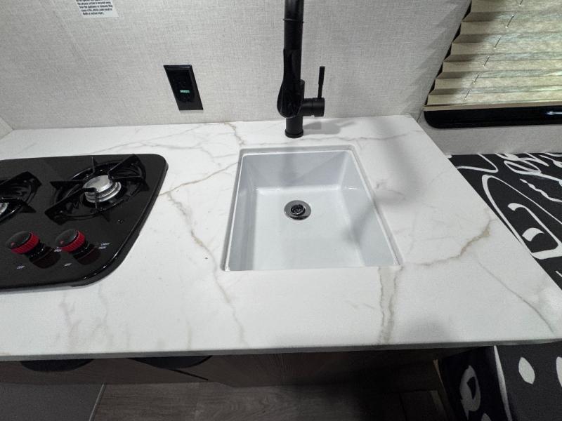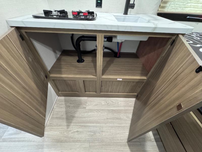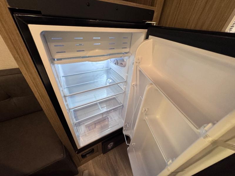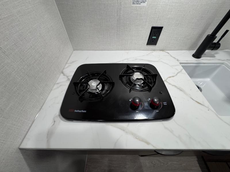 This lightweight travel trailer has everything you need to enjoy camping trips! There is a front east to west custom king bed with storage at the foot of the bed and overhead for your valuables. A private bath includes a toilet and walk-in shower so you can easily get ready each day, and you can prepare your meals on the two-burner cooktop when you get hungry. The booth dinette will provide dining space, along with sleeping space for one to two little ones. Don't let this trailer get away!