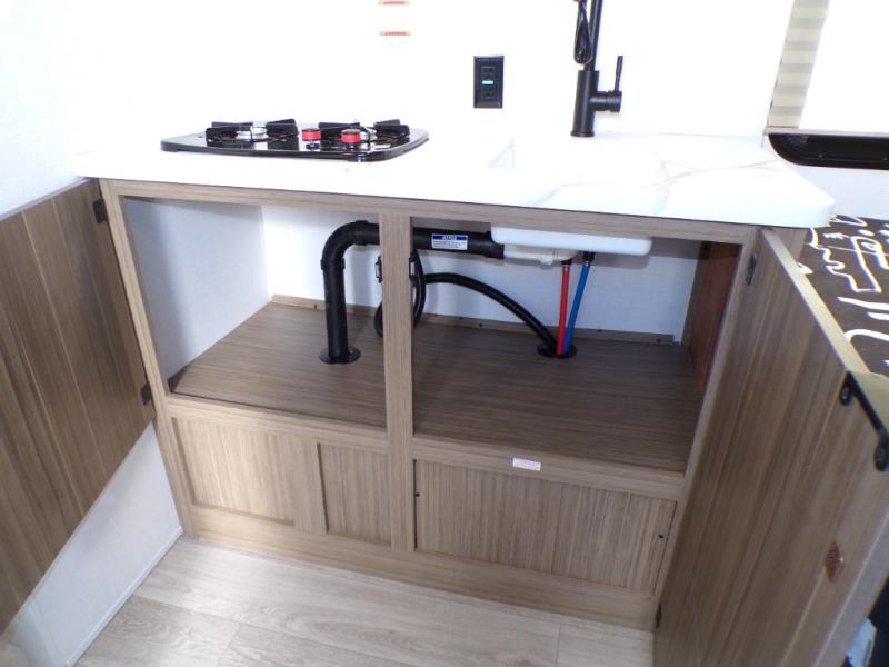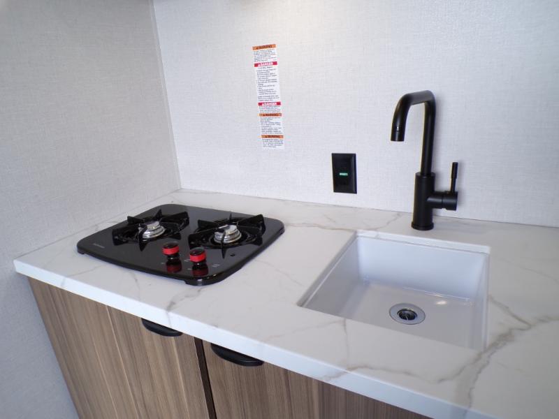 This lightweight travel trailer has everything you need to enjoy camping trips! There is a front east to west custom king bed with storage at the foot of the bed and overhead for your valuables. A private bath includes a toilet and walk-in shower so you can easily get ready each day, and you can prepare your meals on the two-burner cooktop when you get hungry. The booth dinette will provide dining space, along with sleeping space for one to two little ones. Don't let this trailer get away!