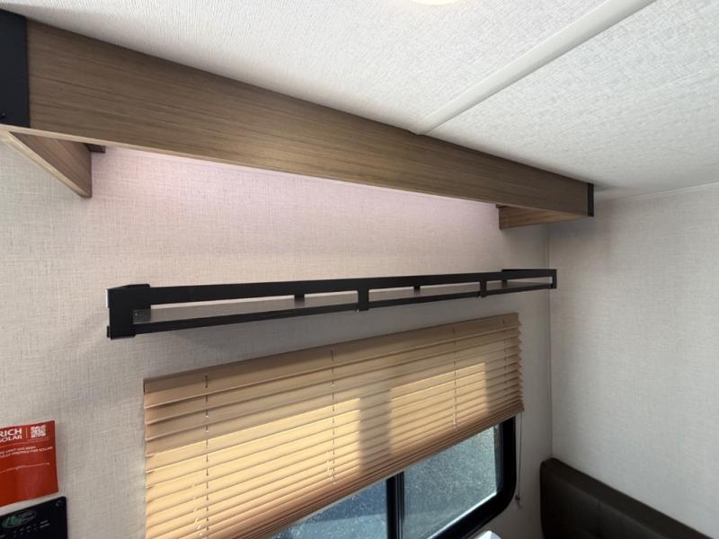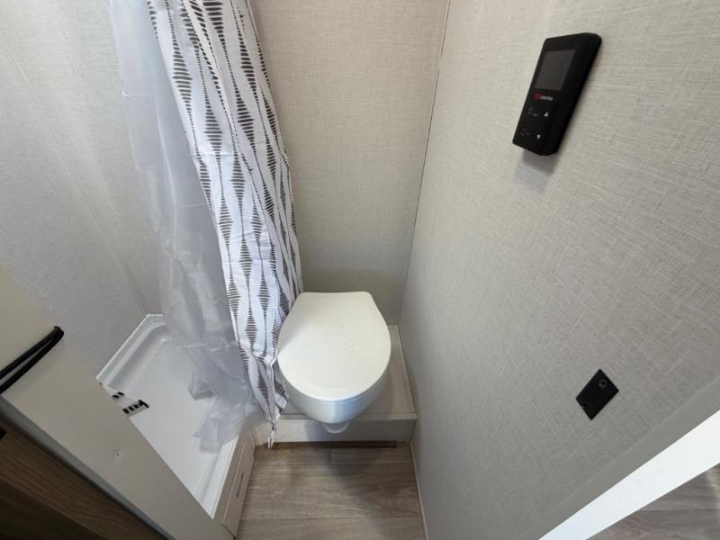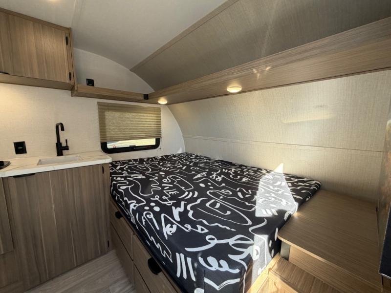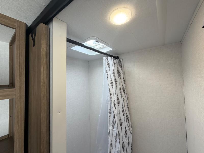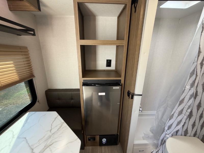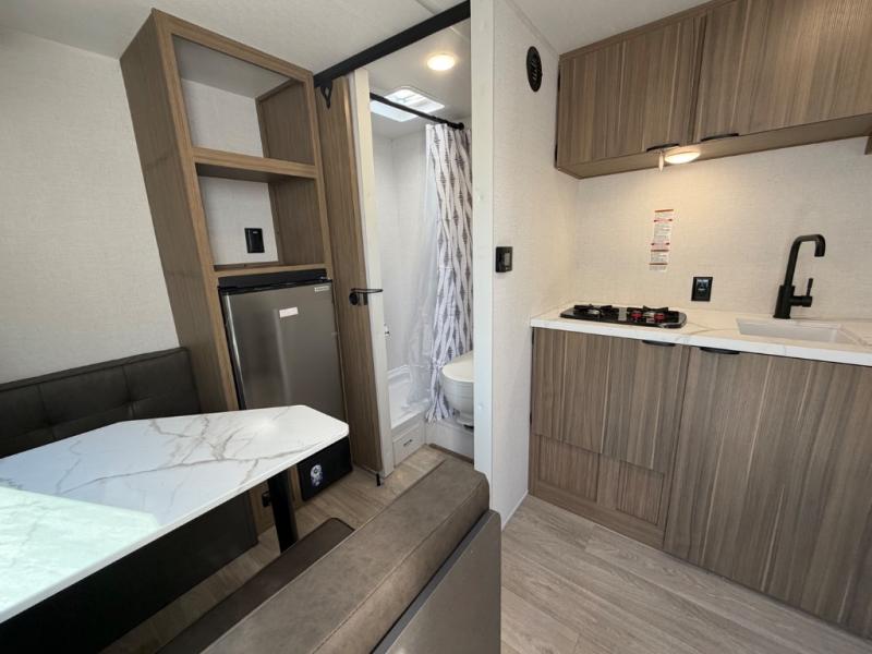 This lightweight travel trailer has everything you need to enjoy camping trips! There is a front east to west custom king bed with storage at the foot of the bed and overhead for your valuables. A private bath includes a toilet and walk-in shower so you can easily get ready each day, and you can prepare your meals on the two-burner cooktop when you get hungry. The booth dinette will provide dining space, along with sleeping space for one to two little ones. Don't let this trailer get away!