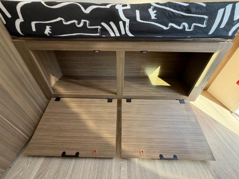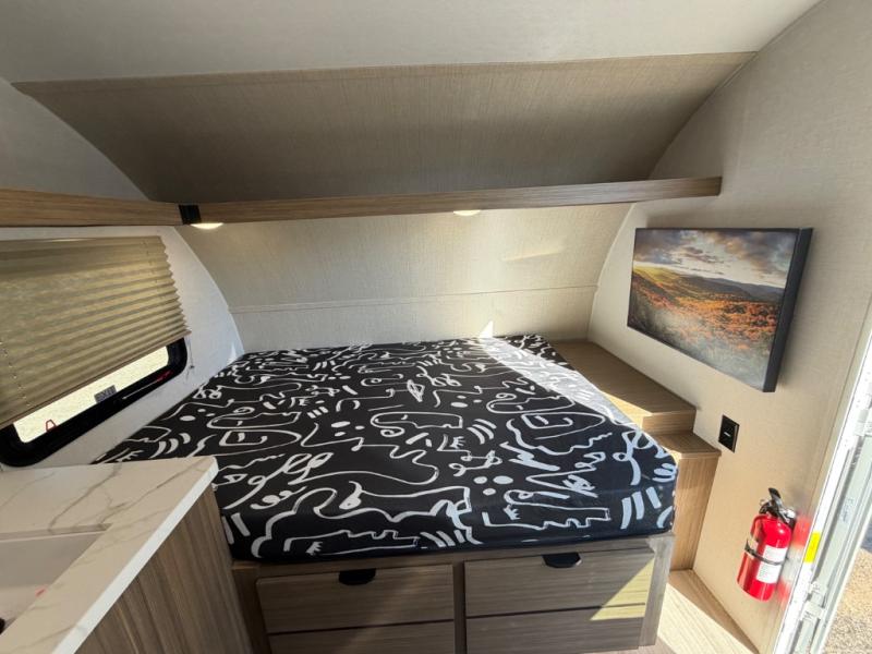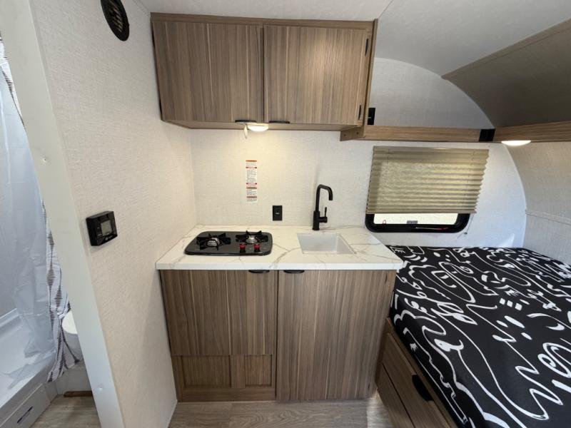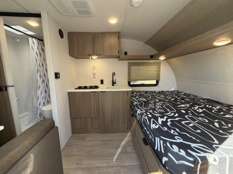 This lightweight travel trailer has everything you need to enjoy camping trips! There is a front east to west custom king bed with storage at the foot of the bed and overhead for your valuables. A private bath includes a toilet and walk-in shower so you can easily get ready each day, and you can prepare your meals on the two-burner cooktop when you get hungry. The booth dinette will provide dining space, along with sleeping space for one to two little ones. Don't let this trailer get away!