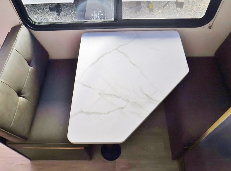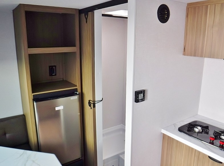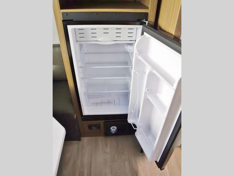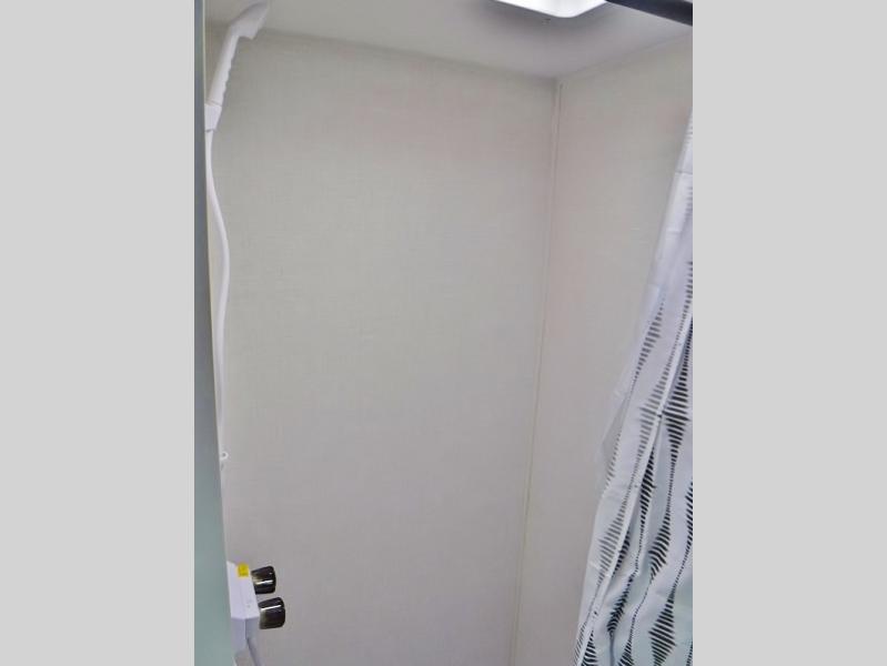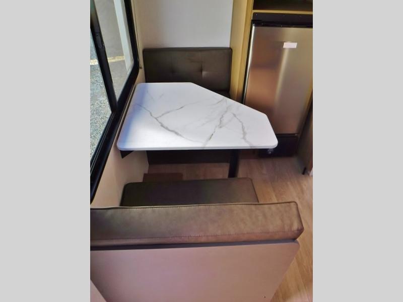 This lightweight travel trailer has everything you need to enjoy camping trips! There is a front east to west custom king bed with storage at the foot of the bed and overhead for your valuables. A private bath includes a toilet and walk-in shower so you can easily get ready each day, and you can prepare your meals on the two-burner cooktop when you get hungry. The booth dinette will provide dining space, along with sleeping space for one to two little ones. Don't let this trailer get away!