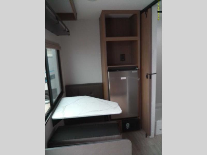This lightweight travel trailer has everything you need to enjoy camping trips! There is a front east to west custom king bed with storage at the foot of the bed and overhead for your valuables. A private bath includes a toilet and walk-in shower so you can easily get ready each day, and you can prepare your meals on the two-burner cooktop when you get hungry. The booth dinette will provide dining space, along with sleeping space for one to two little ones. Don't let this trailer get away!