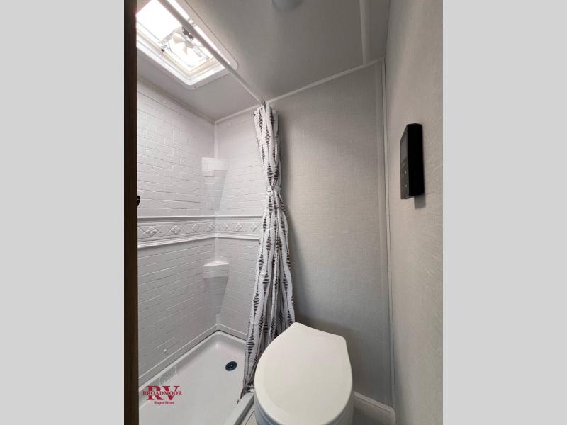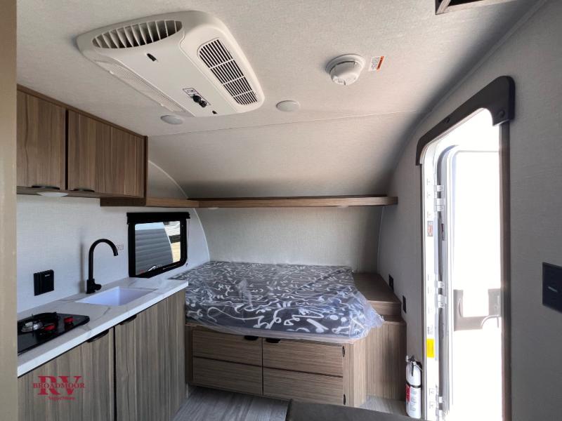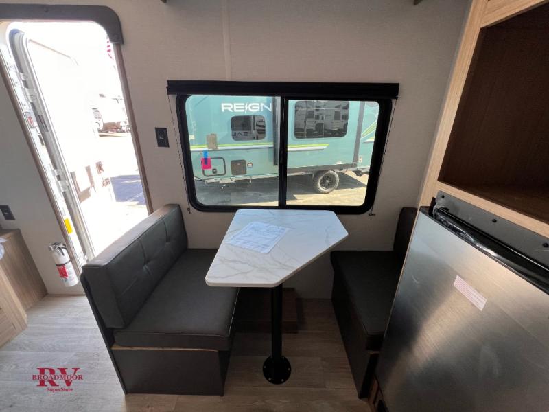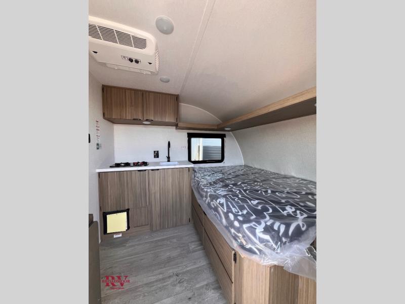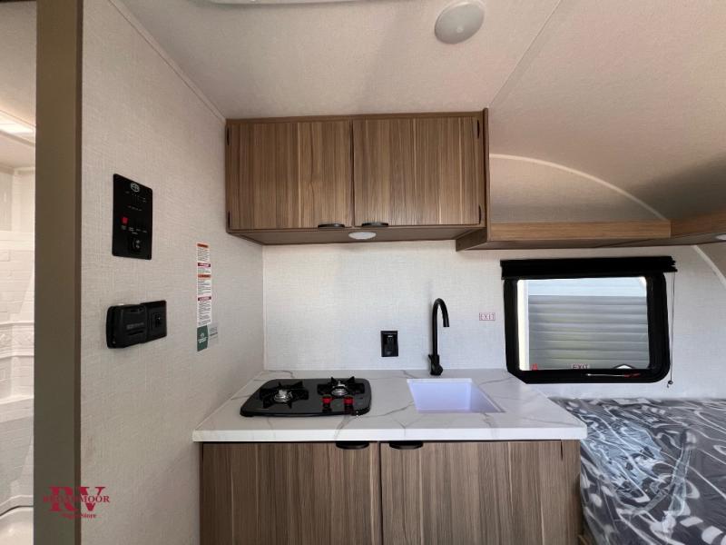 This lightweight travel trailer has everything you need to enjoy camping trips! There is a front east to west custom king bed with storage at the foot of the bed and overhead for your valuables. A private bath includes a toilet and walk-in shower so you can easily get ready each day, and you can prepare your meals on the two-burner cooktop when you get hungry. The booth dinette will provide dining space, along with sleeping space for one to two little ones. Don't let this trailer get away!